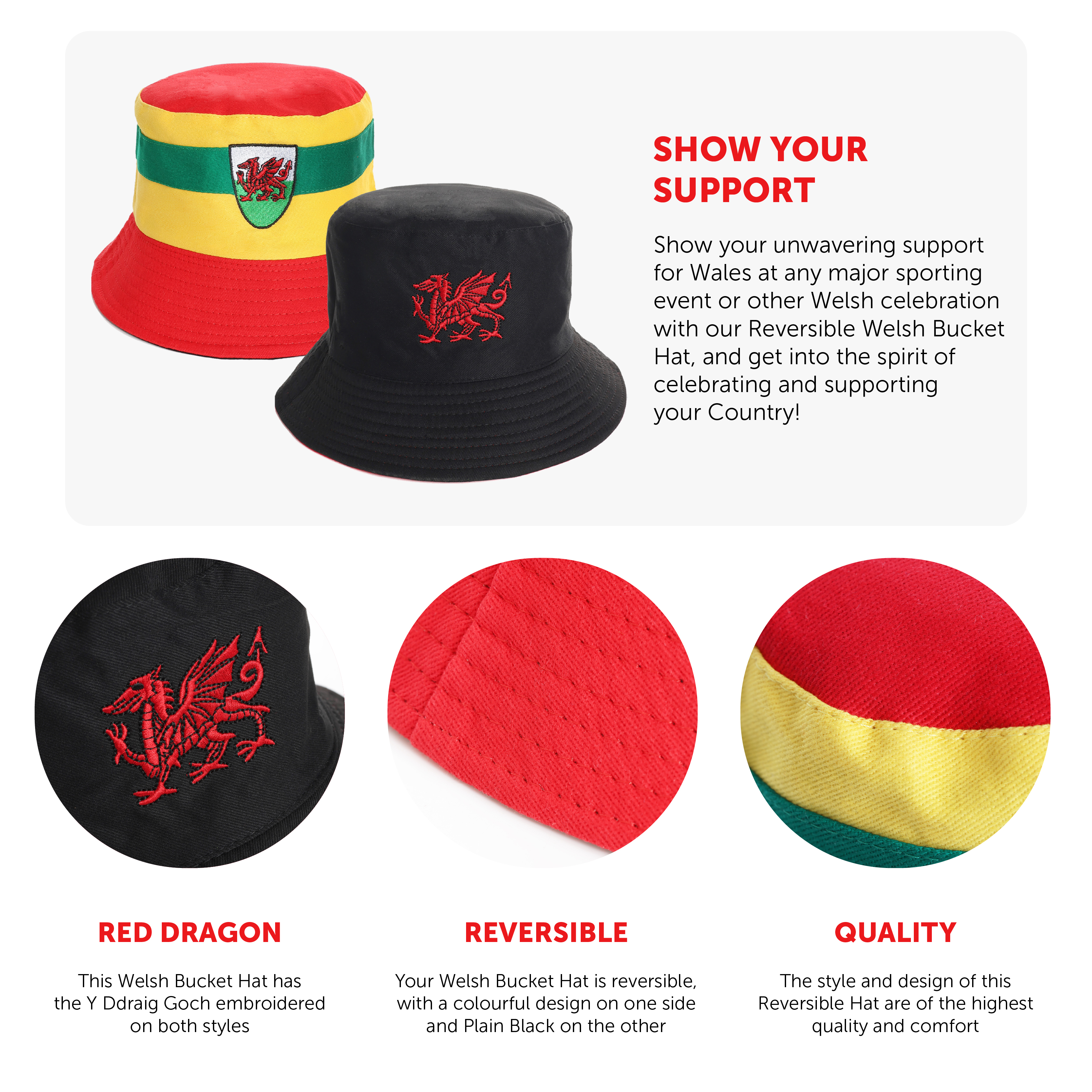 REVERSIBLE WELSH BUCKET HAT: Show your unwavering support for Wales at any major sporting event or other Welsh celebration with our Reversible Welsh Bucket Hat, and get into the spirit of celebrating and supporting your Country!