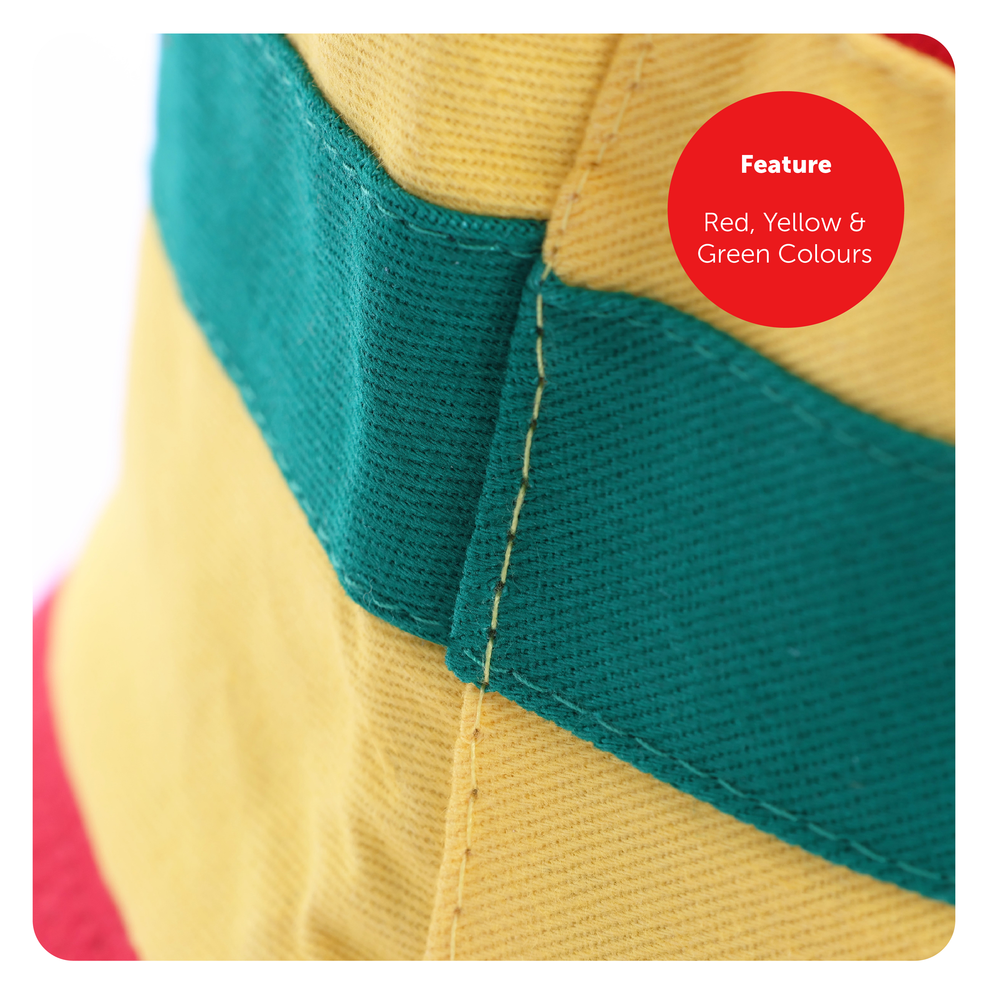 HAT DETAILS: A Reversible Bucket Hat with a Red, Yellow and Green Striped design with the Red Dragon emblem on one side, and a Plain Black design with an embroidered Red Dragon on the other side, the perfect look for any occasion!
