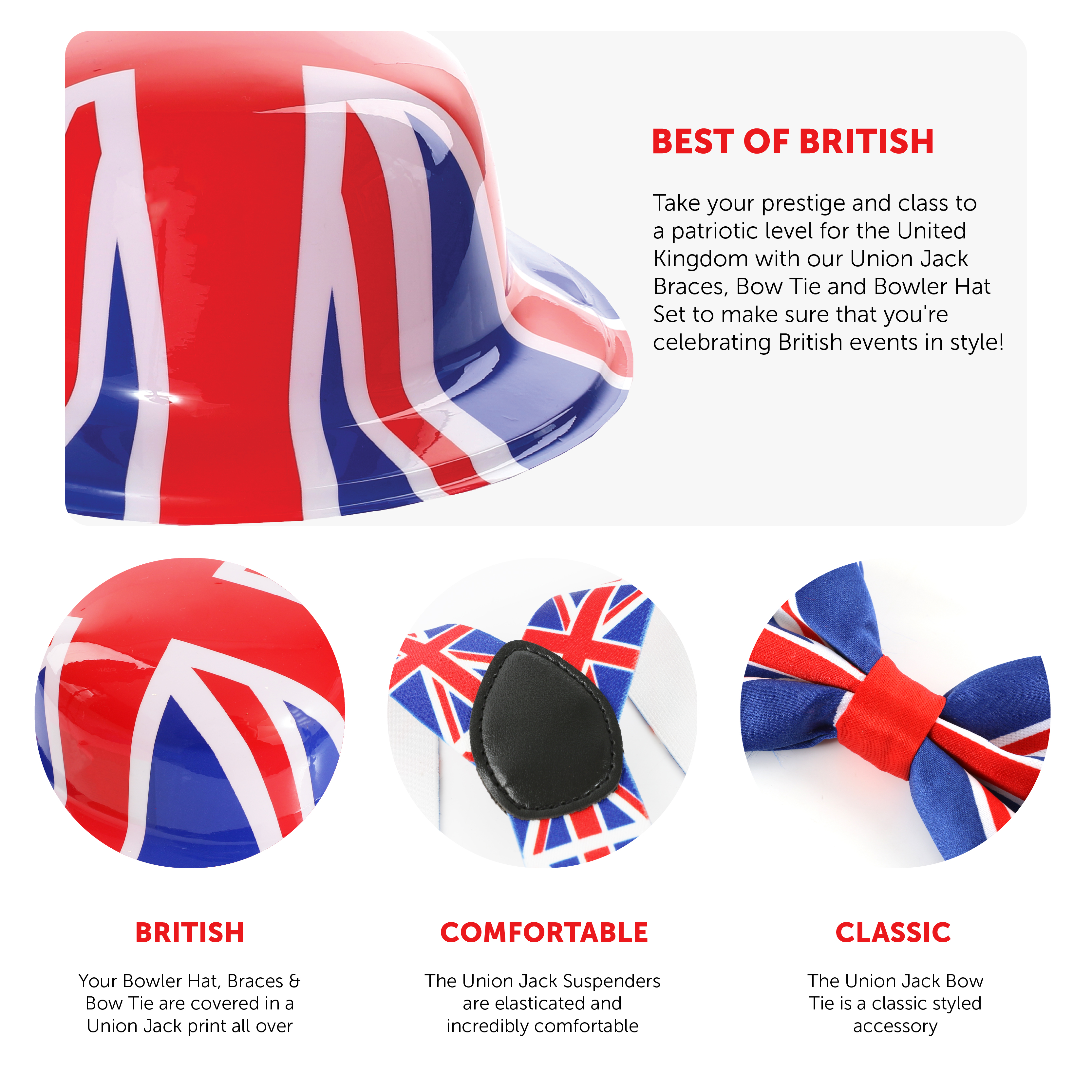 UNION JACK ACCESSORY SET INCLUDES: Your Union Jack Accessory Set includes a set of adjustable Union Jack Braces with metal fasteners, a matching Union Jack Bow Tie and a lightweight Plastic Bowler Hat with a Union Jack flag print, for any British events!