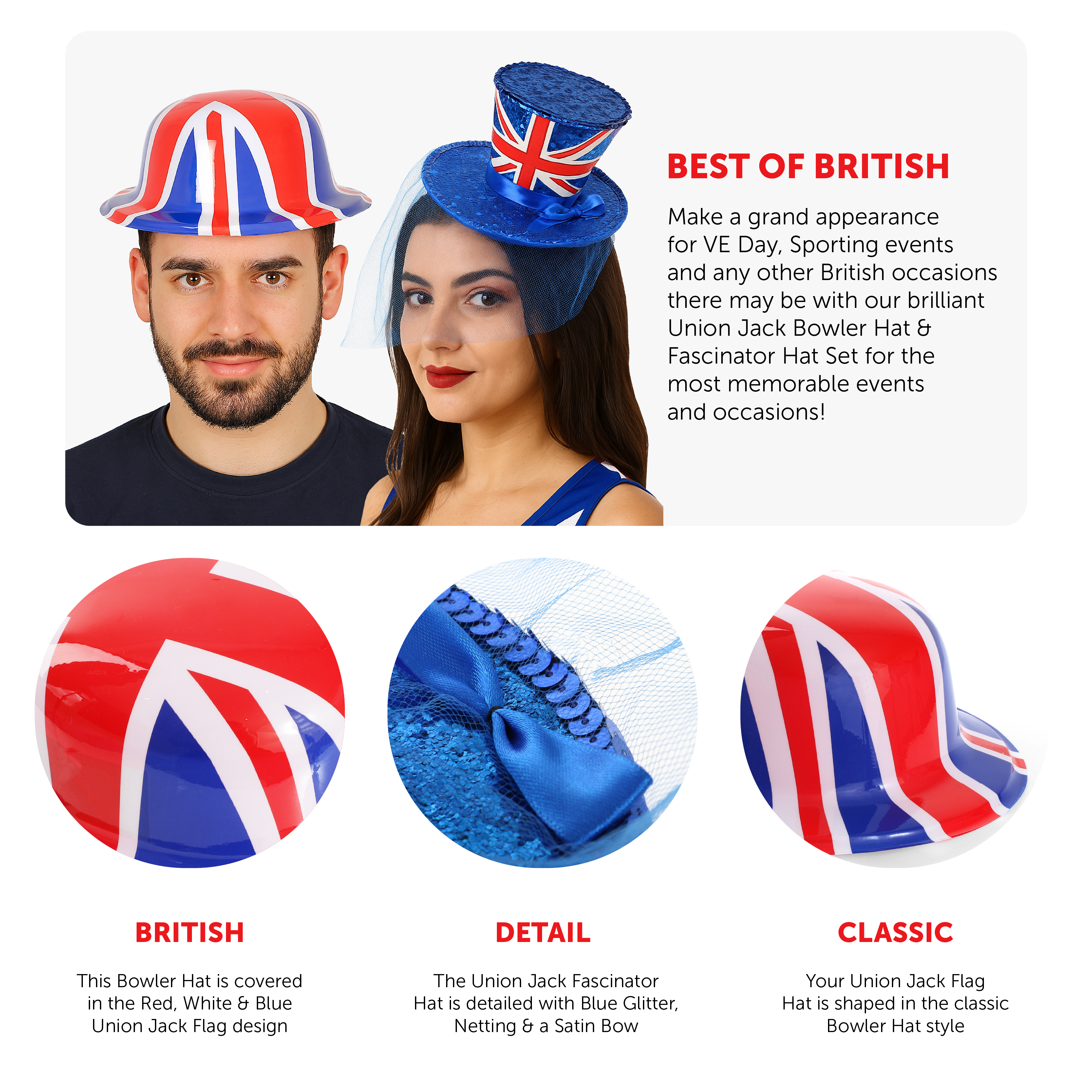 PERFECT FOR BRITISH EVENTS: Whether you're celebrating VE Day, British Sporting events, Royal celebrations or for any other occasion, make sure you don't miss out on our Union Jack Bowler Hat & Fascinator Hat Set!