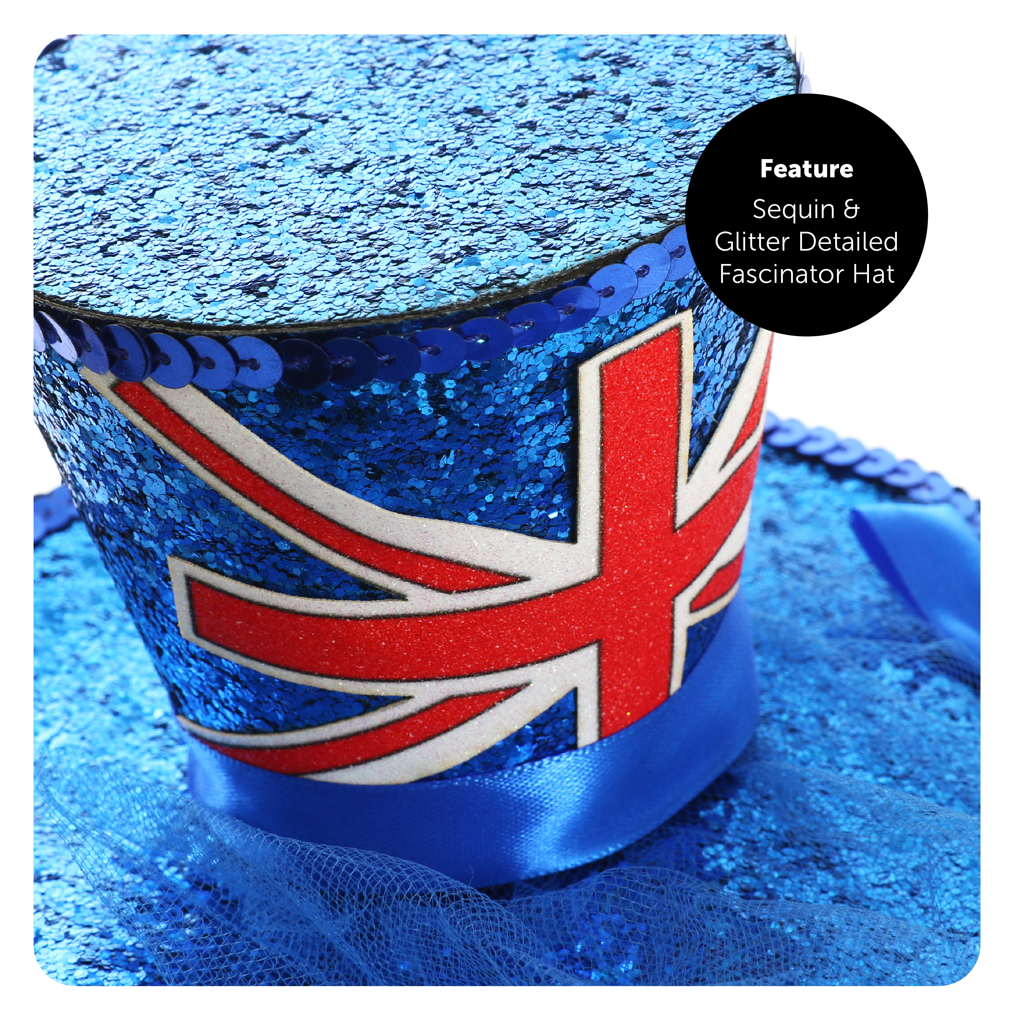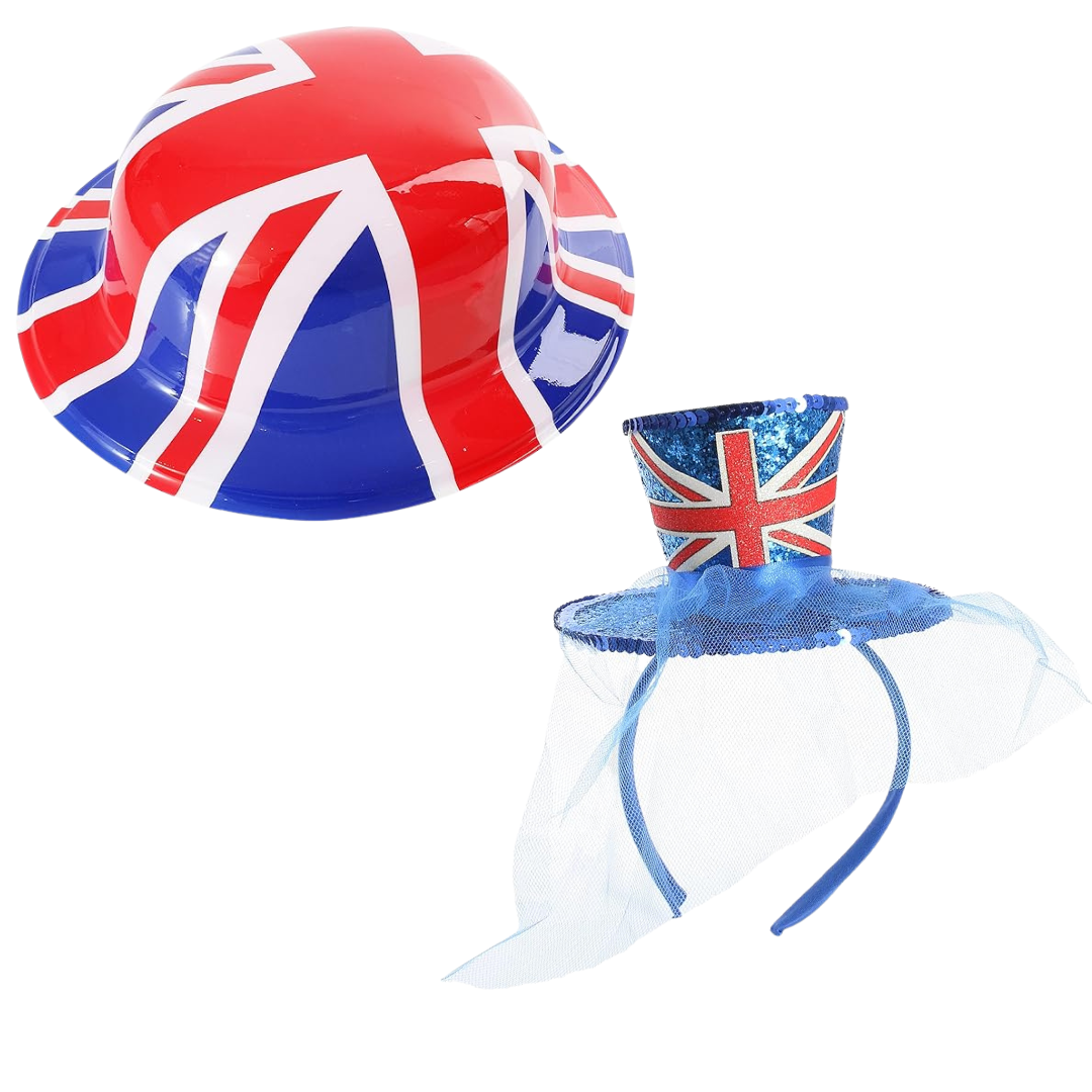 SET INCLUDES: Your Union Jack Hat set includes 1x Plastic Bowler Hat with the Red, White & Blue Union Jack Flag design on top, and 1x Glitter covered Mini Fascinator Hat attached to a Headband with the Union Jack on the front, a detailed sequin edge and netting, the perfect addition to any British themed event!