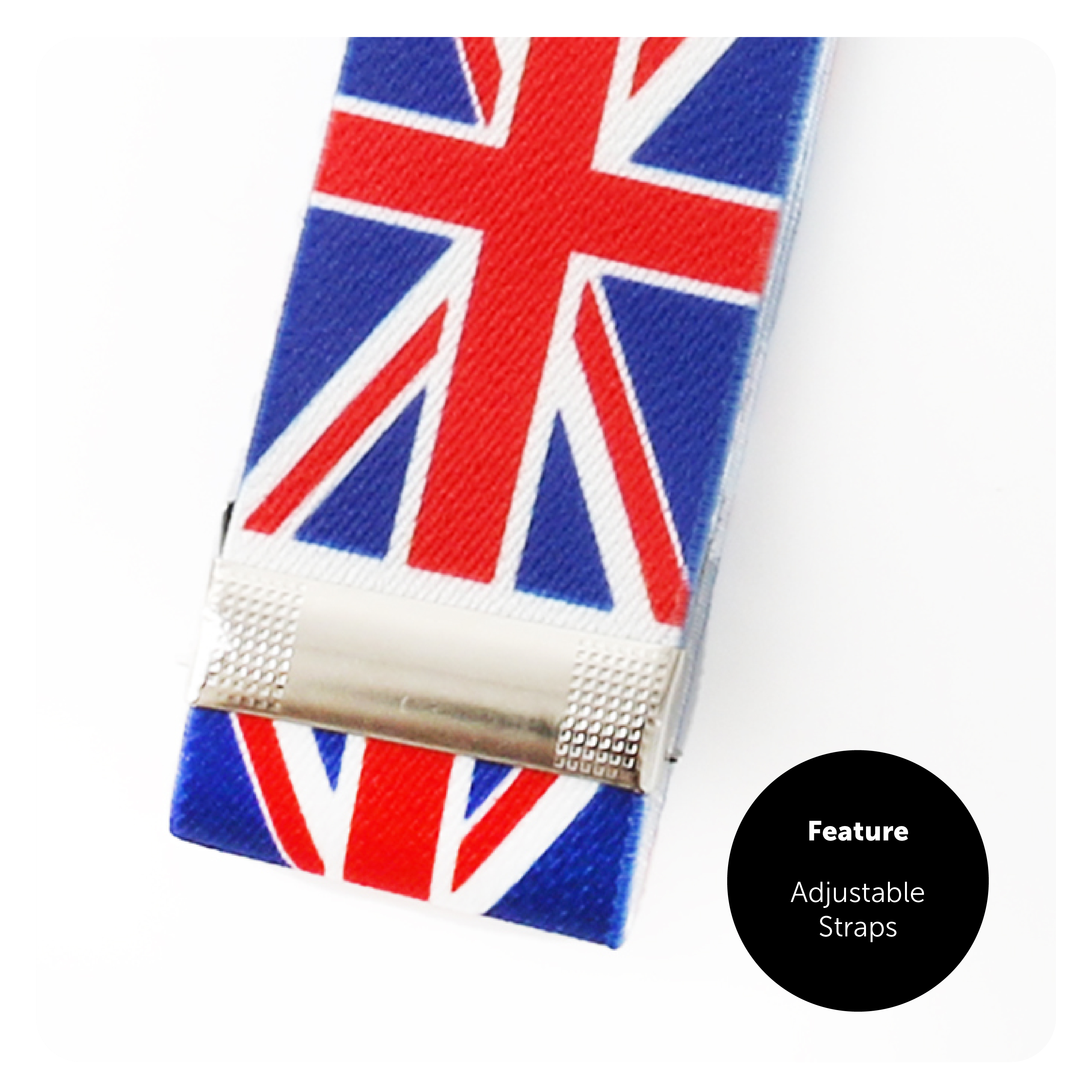 UNION JACK SET DETAILS: This Union Jack Set includes a classic shaped, plastic Bowler Hat with the Union Jack Flag design printed on top and matching adjustable Suspenders, with quality metal fastening clips, the perfect addition to any British themed event!