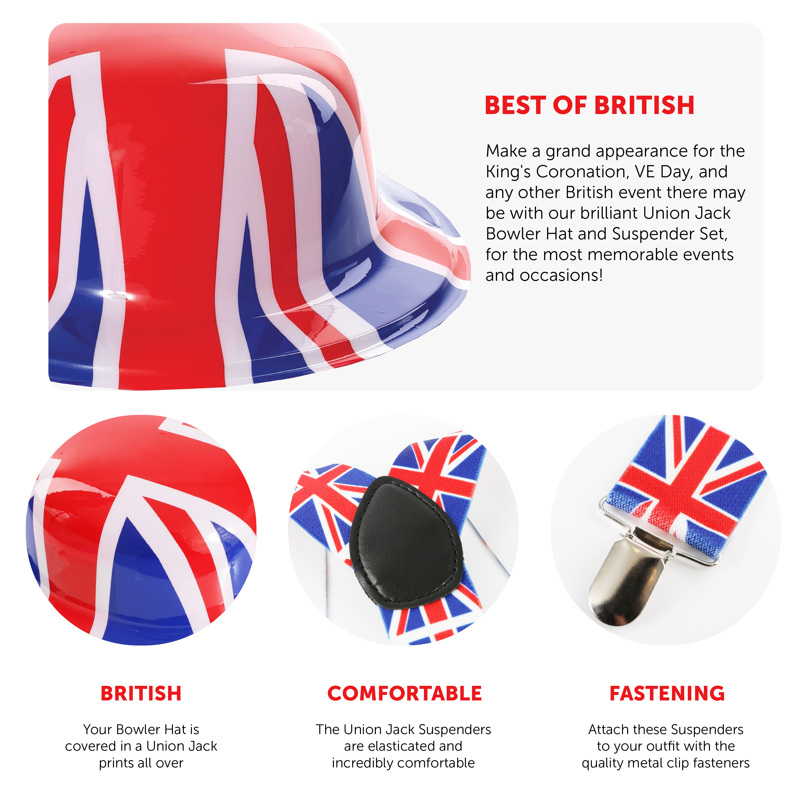 UNION JACK BOWLER HAT & SUSPENDERS: Make a grand appearance for the King's Coronation, VE Day, and any other British event there may be with our brilliant Union Jack Bowler Hat and Suspender Set, for the most memorable events and occasions!