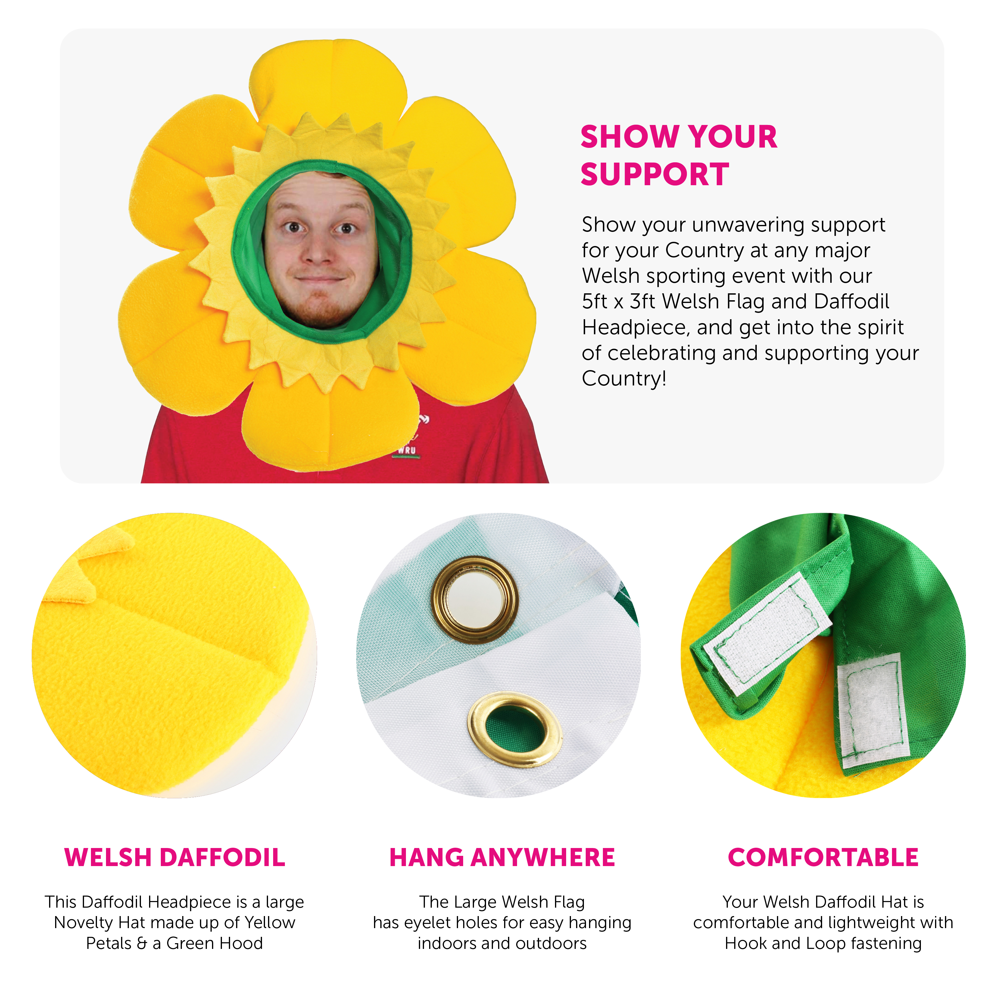 SET INCLUDES: This Welsh Set includes a large 5ft x 3ft Welsh Flag with eyelet holes for easy hanging anywhere, and a Daffodil Headpiece made up of Yellow Petals attached to a Green Hood, you'll be sure to look the part at any Welsh event!