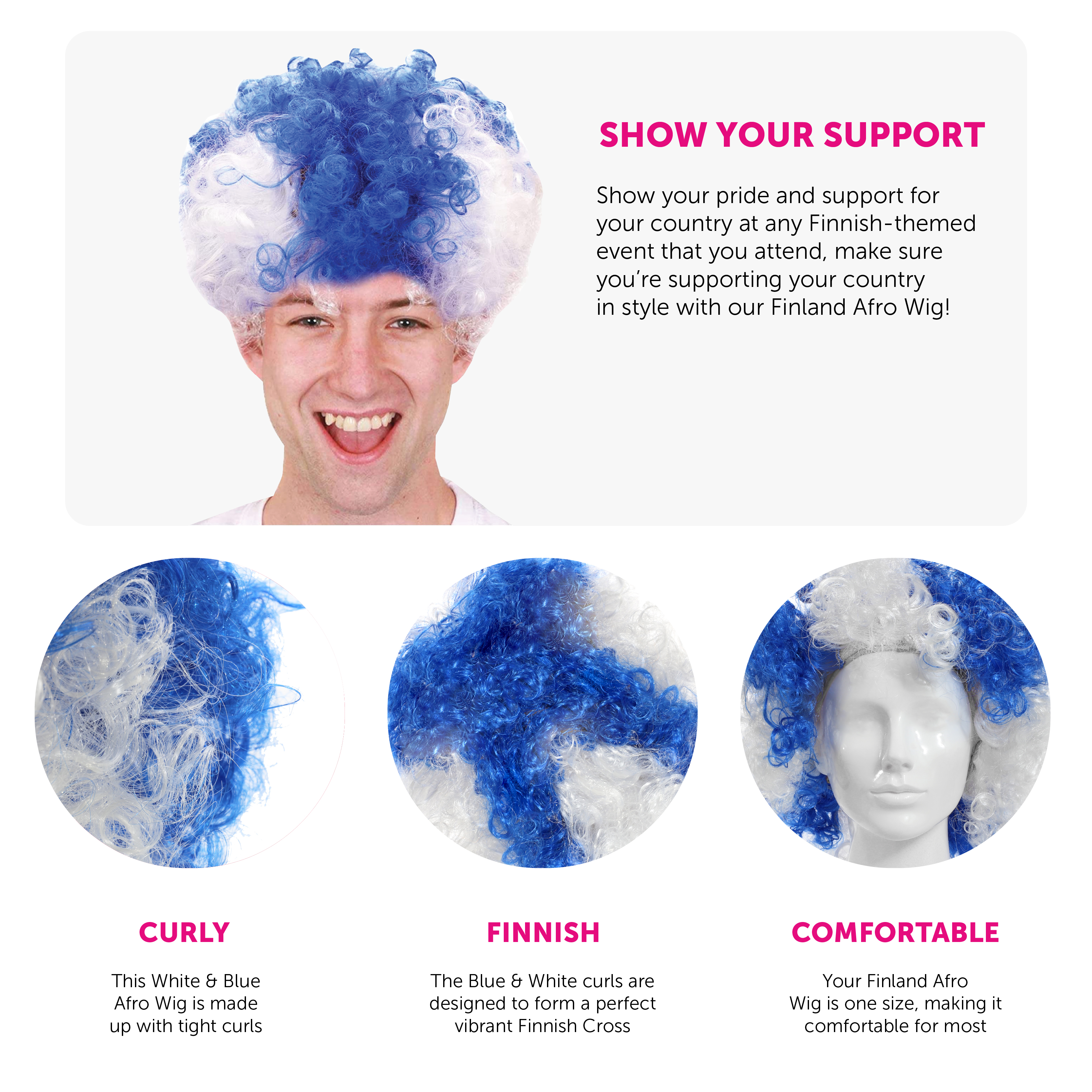 FINLAND AFRO WIG: Show your pride and support for your country at any Finnish-themed event that you attend, make sure you’re supporting your country in style with our Finland Afro Wig!