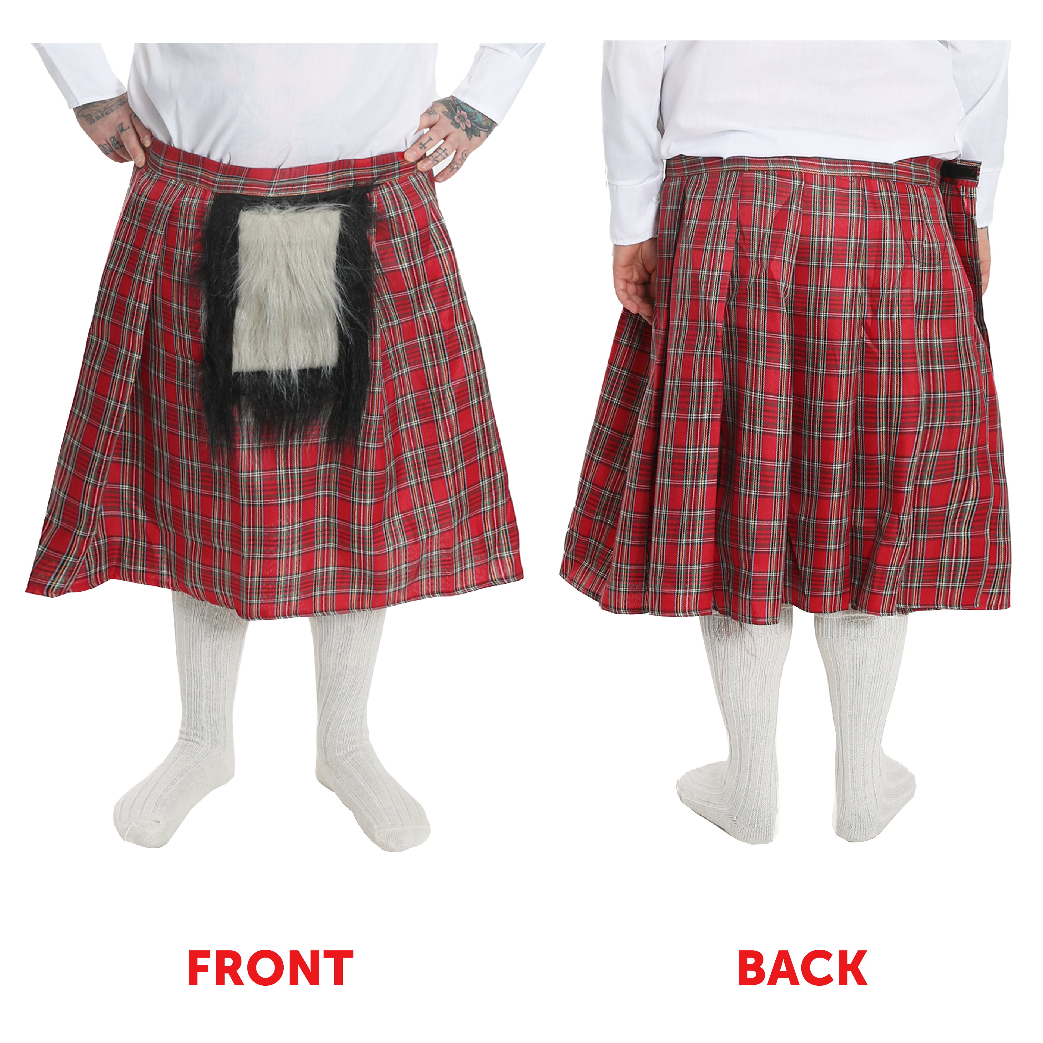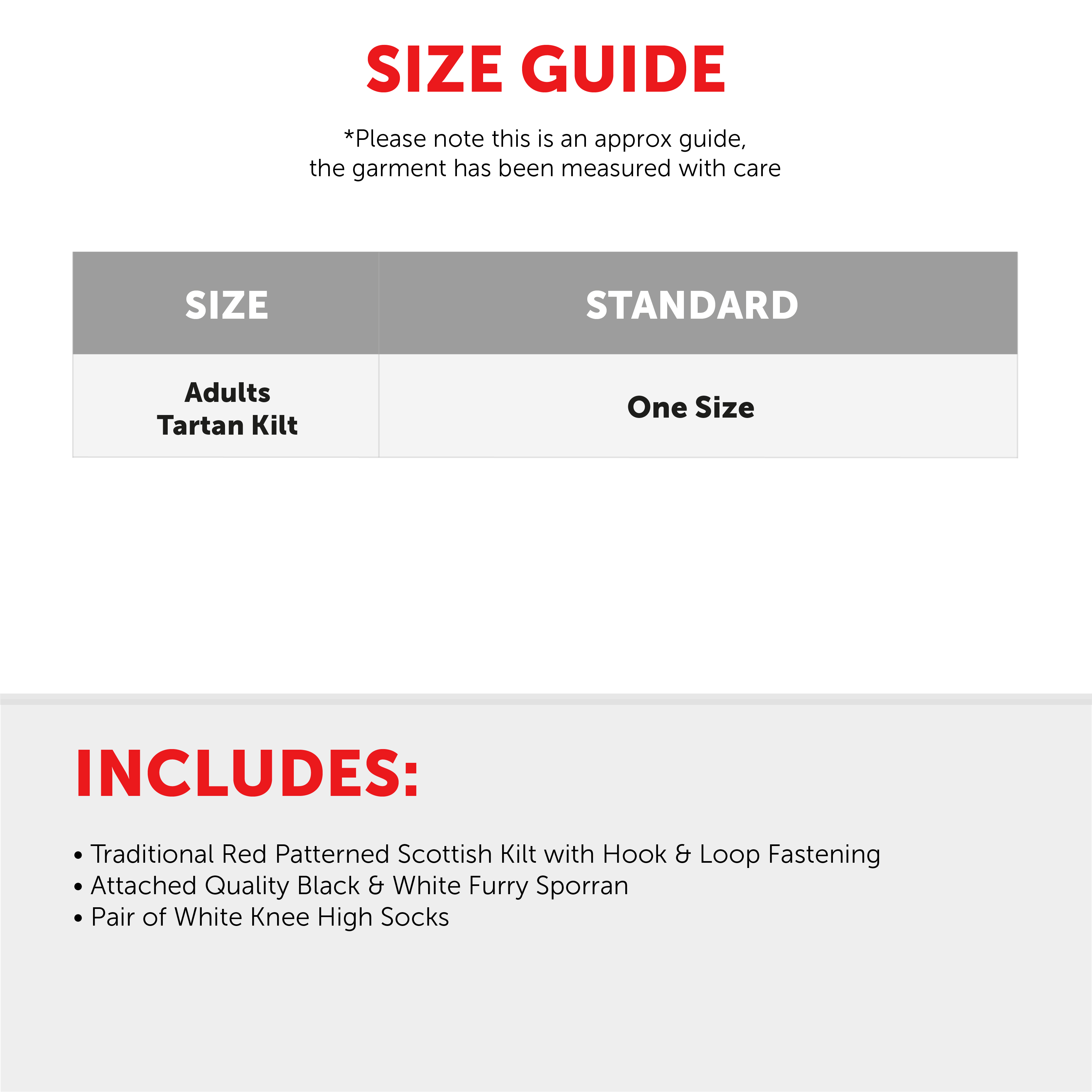 COSTUME DETAILS: An Adults Scottish Kilt, covered in a traditional styled Red Tartan pattern, with a soft Black and White Sporran attached to the front, and a comfortable hook and loop fastening design, and a pair of White Knee Socks, you'll be sure to look bonny in this Scottish outfit!