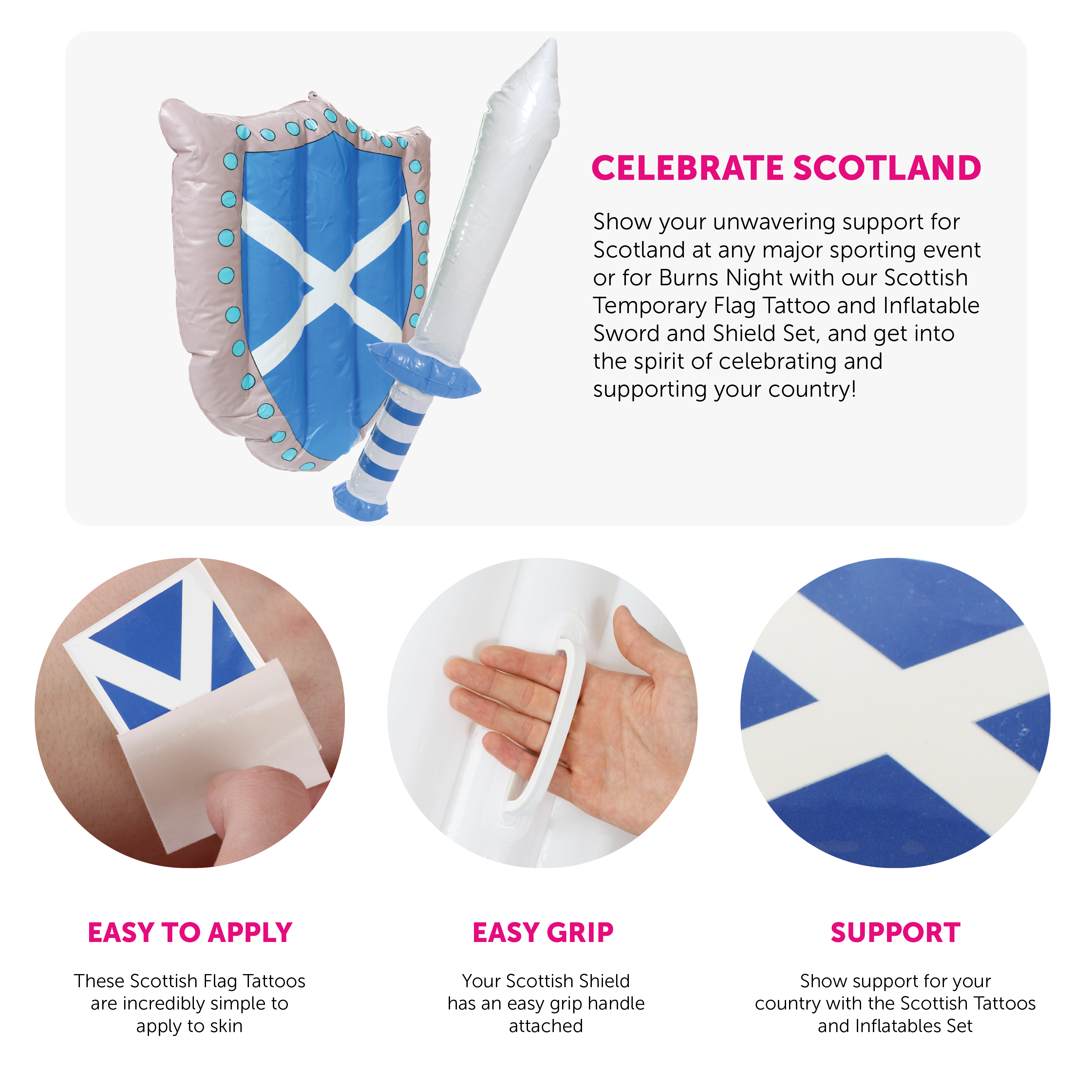SCOTTISH FLAG TATTOO & INFLATABLE SWORD AND SHIELD SET: Show your unwavering support for Scotland at any major sporting event or for Burns Night with our Scottish Temporary Flag Tattoo and Inflatable Sword and Shield Set, and get into the spirit of celebrating and supporting your country!