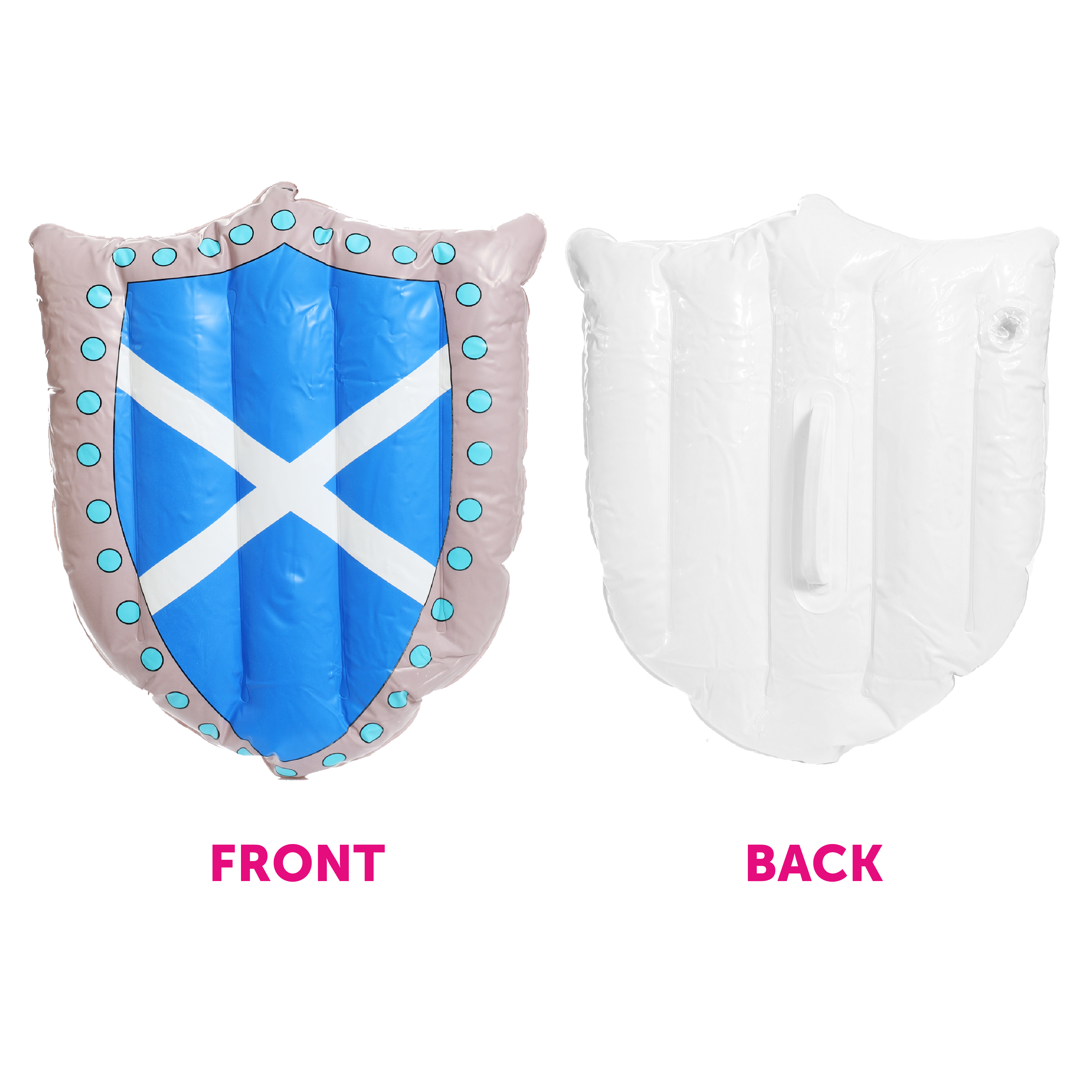 SCOTTISH SET INCLUDES: This Scottish Set includes a Pack of 4 Temporary Scottish Flag Tattoos, an Inflatable Sword with a Blue and White Stripe themed handle, and an Inflatable Shield with the Scottish Flag branded across the front