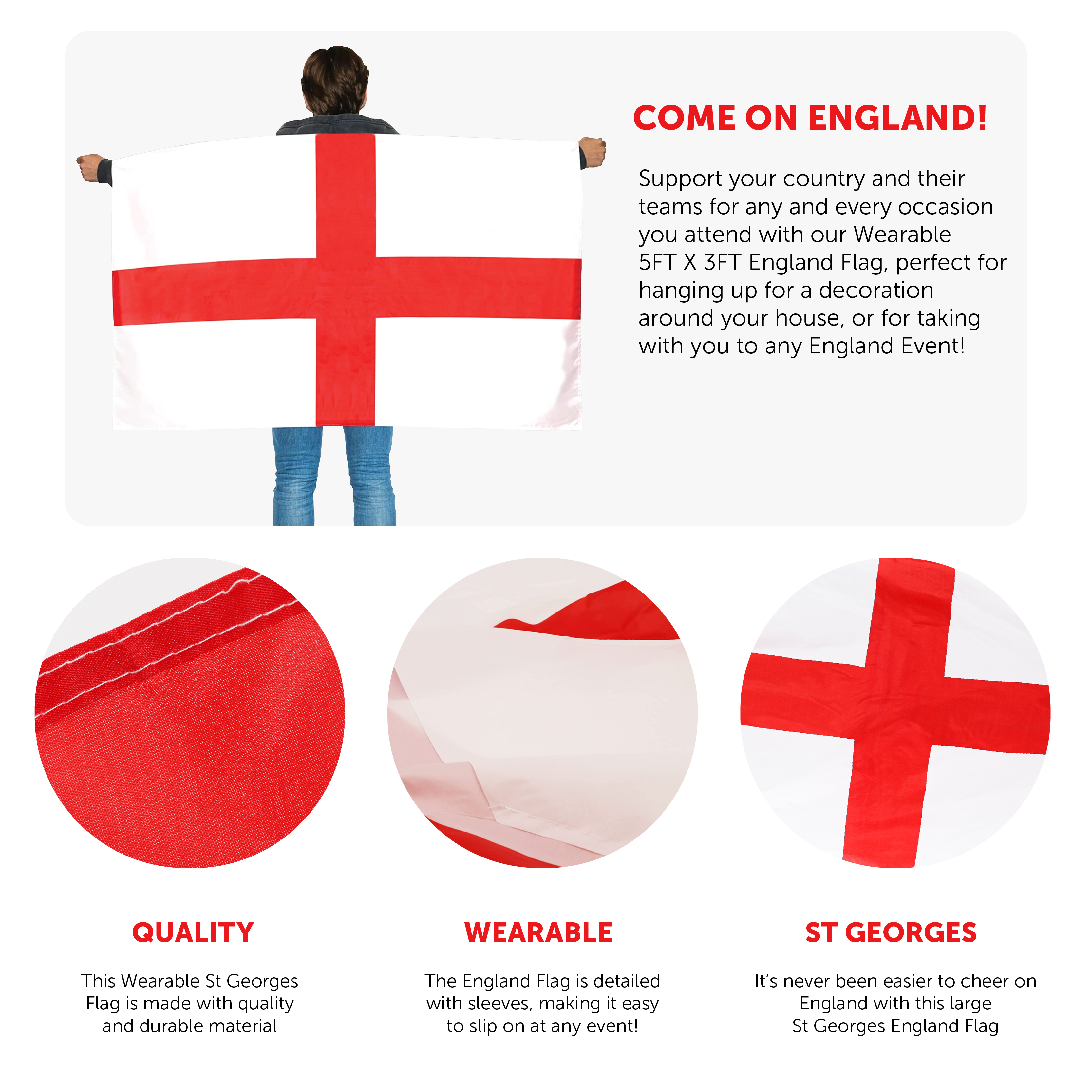 - PERFECT FOR ENGLAND EVENTS AND SPORTS: Whether it be celebrating the worldwide event of St George’s Day, your countries team during a match, or any other occasion, make sure that you celebrate it with our Wearable 5ft x 3ft England Large Flag!