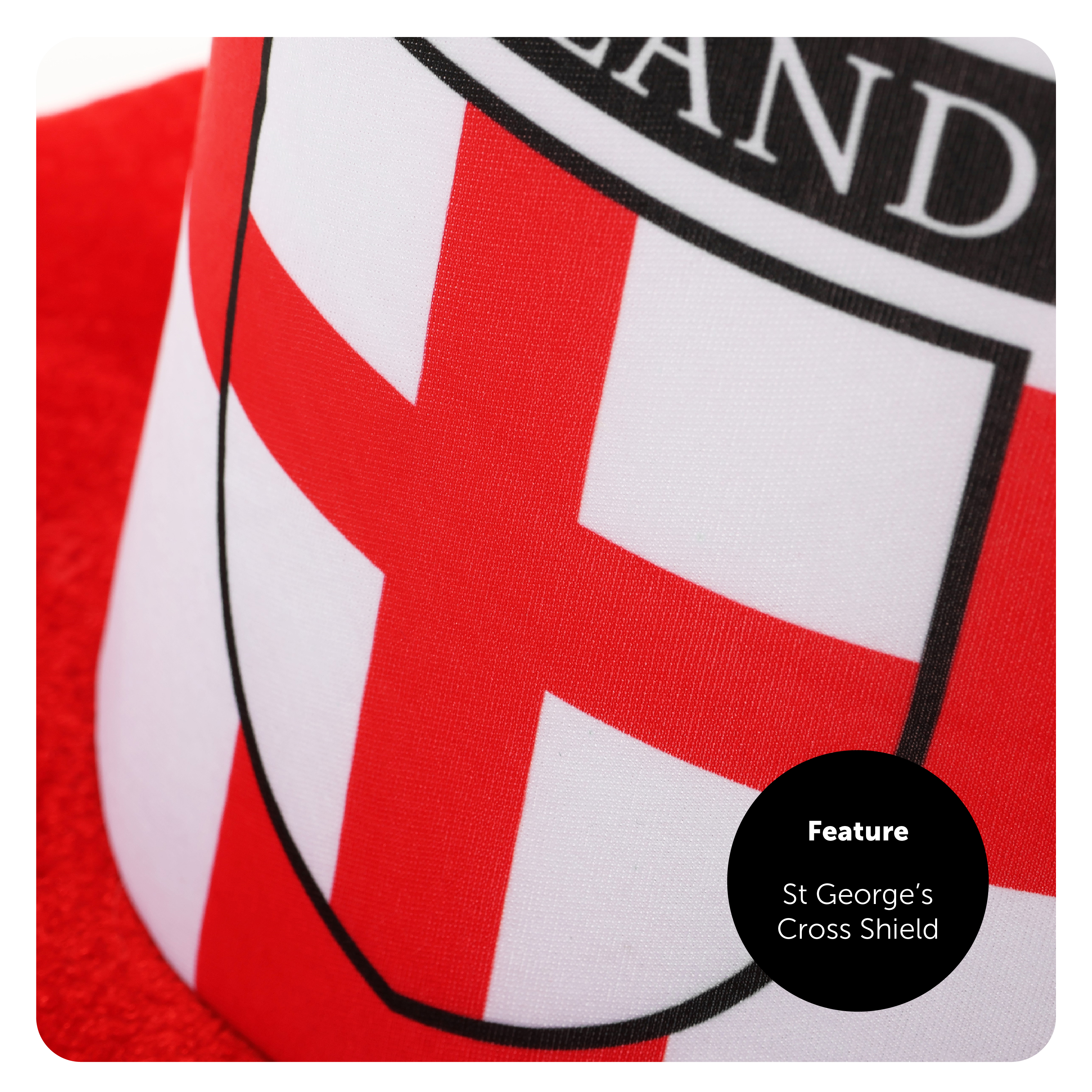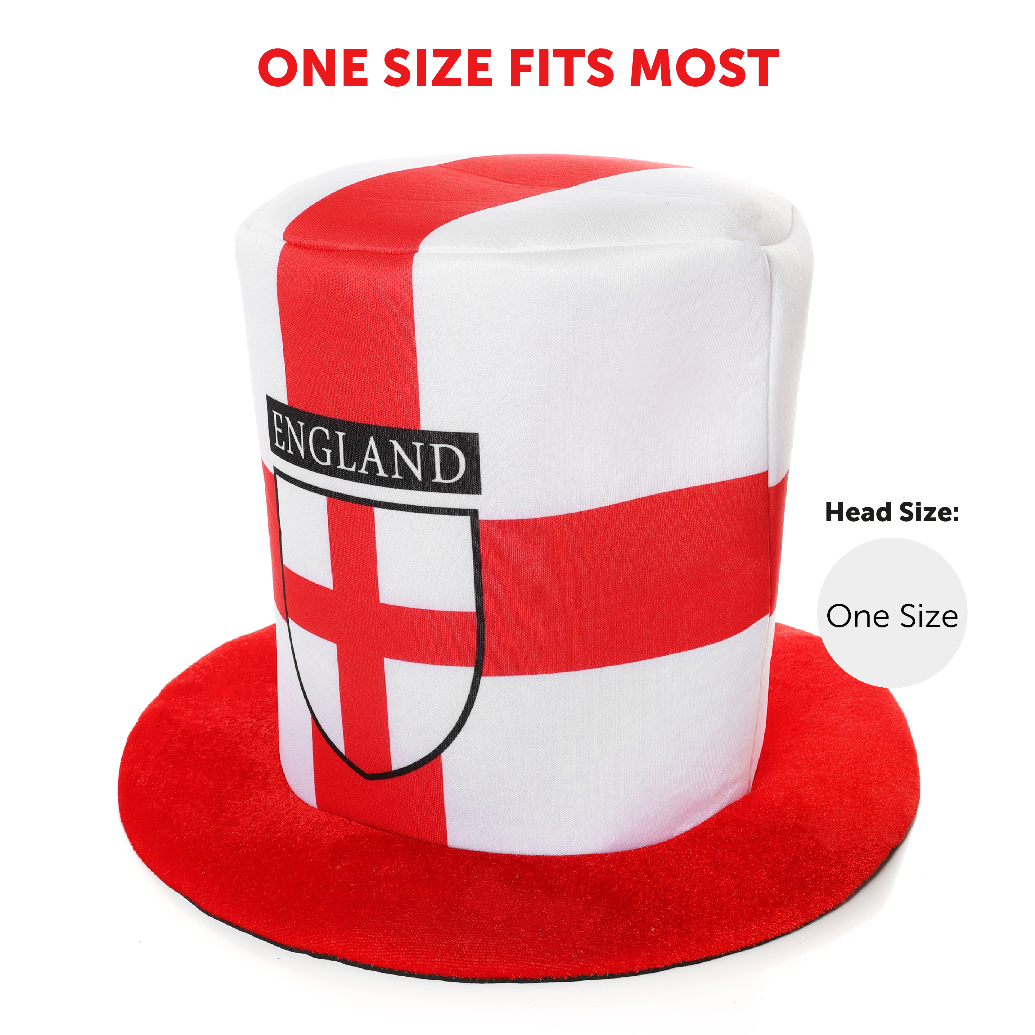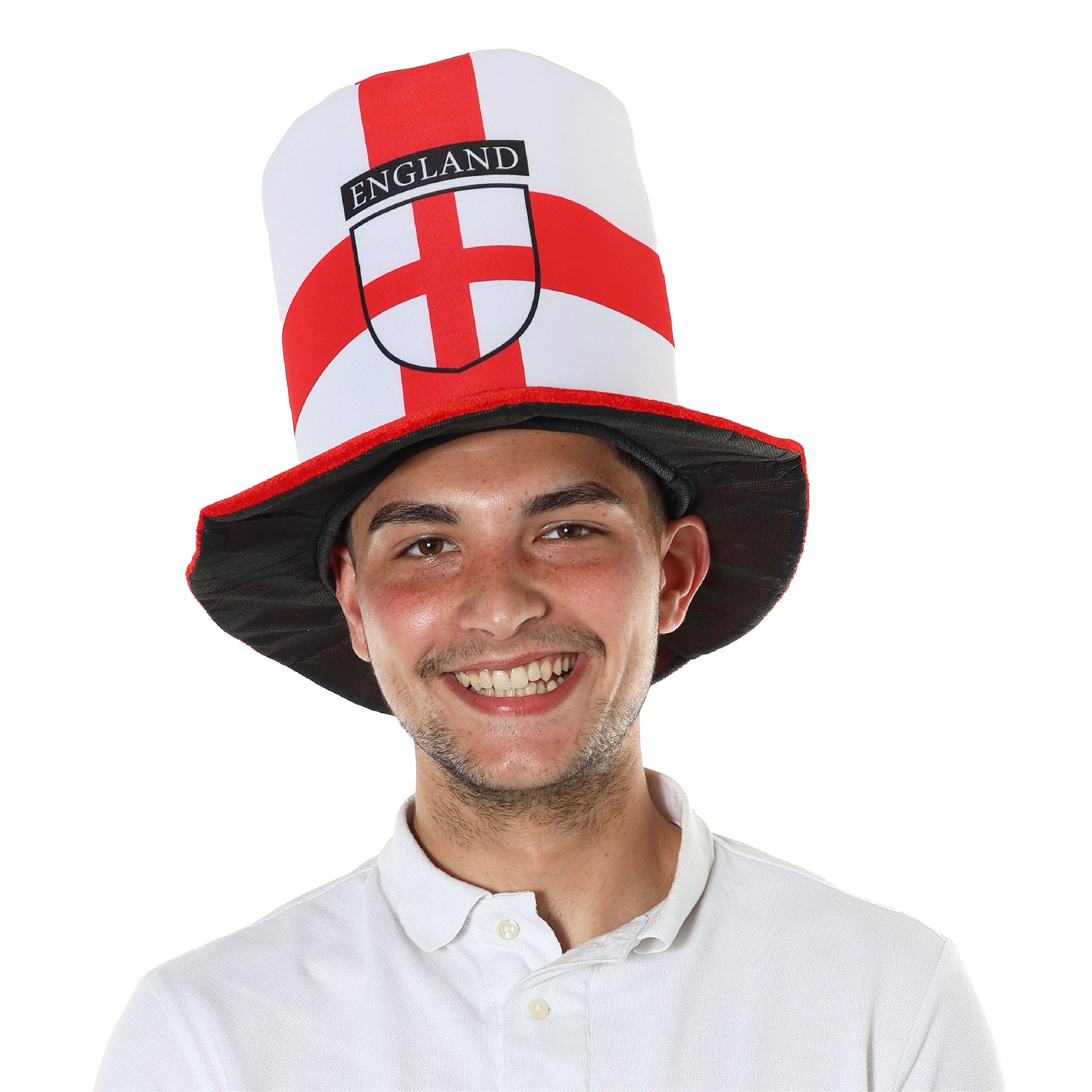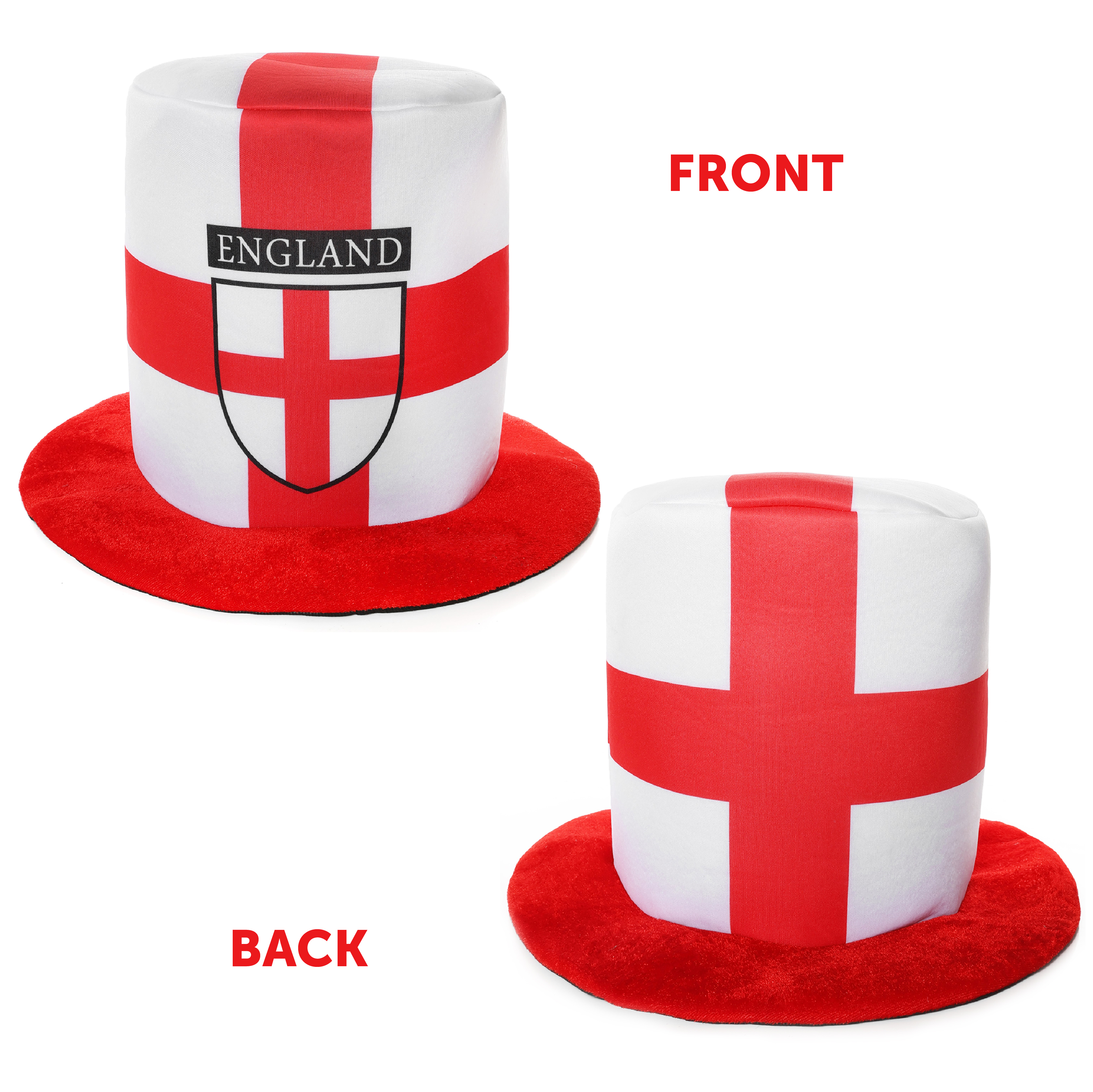 HAT DETAILS: A tall, Plush Top Hat with the St George's Cross wrapped all the way around the top, a soft Red Brim and a smaller St George's Cross on the front in a Shield with 'ENGLAND' printed above it, the perfect look for any English occasion!