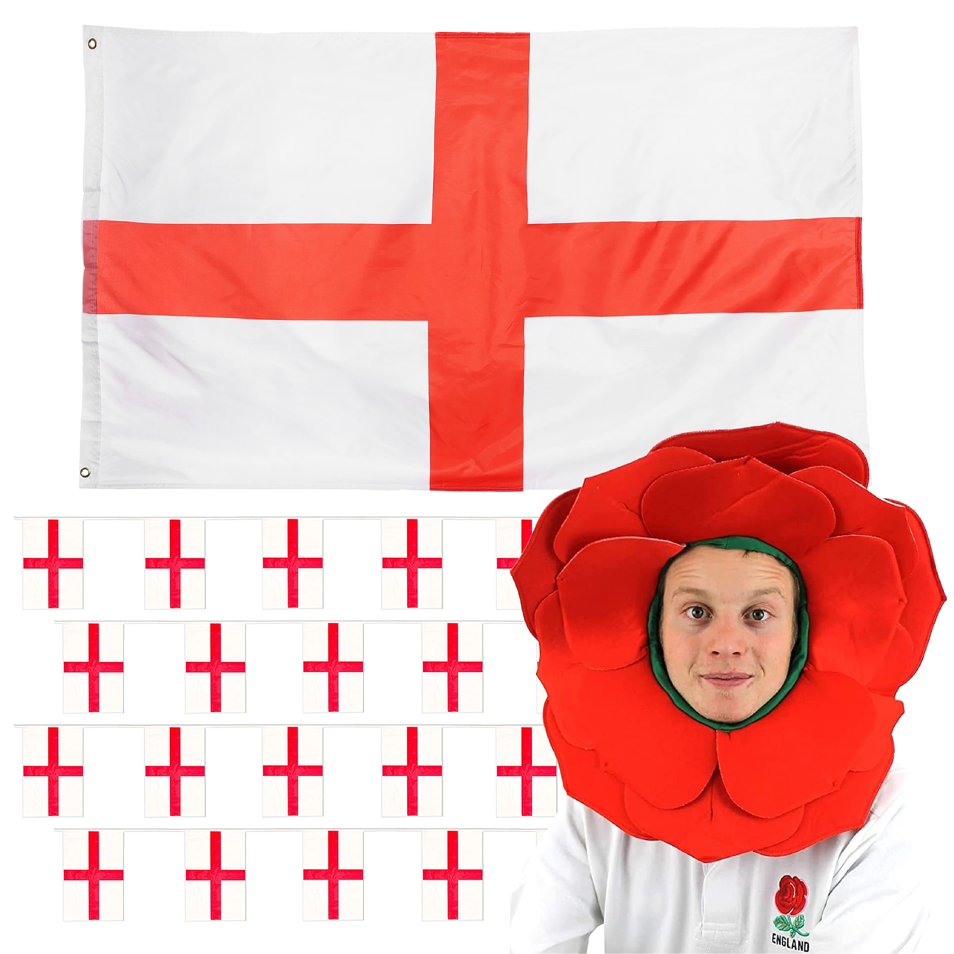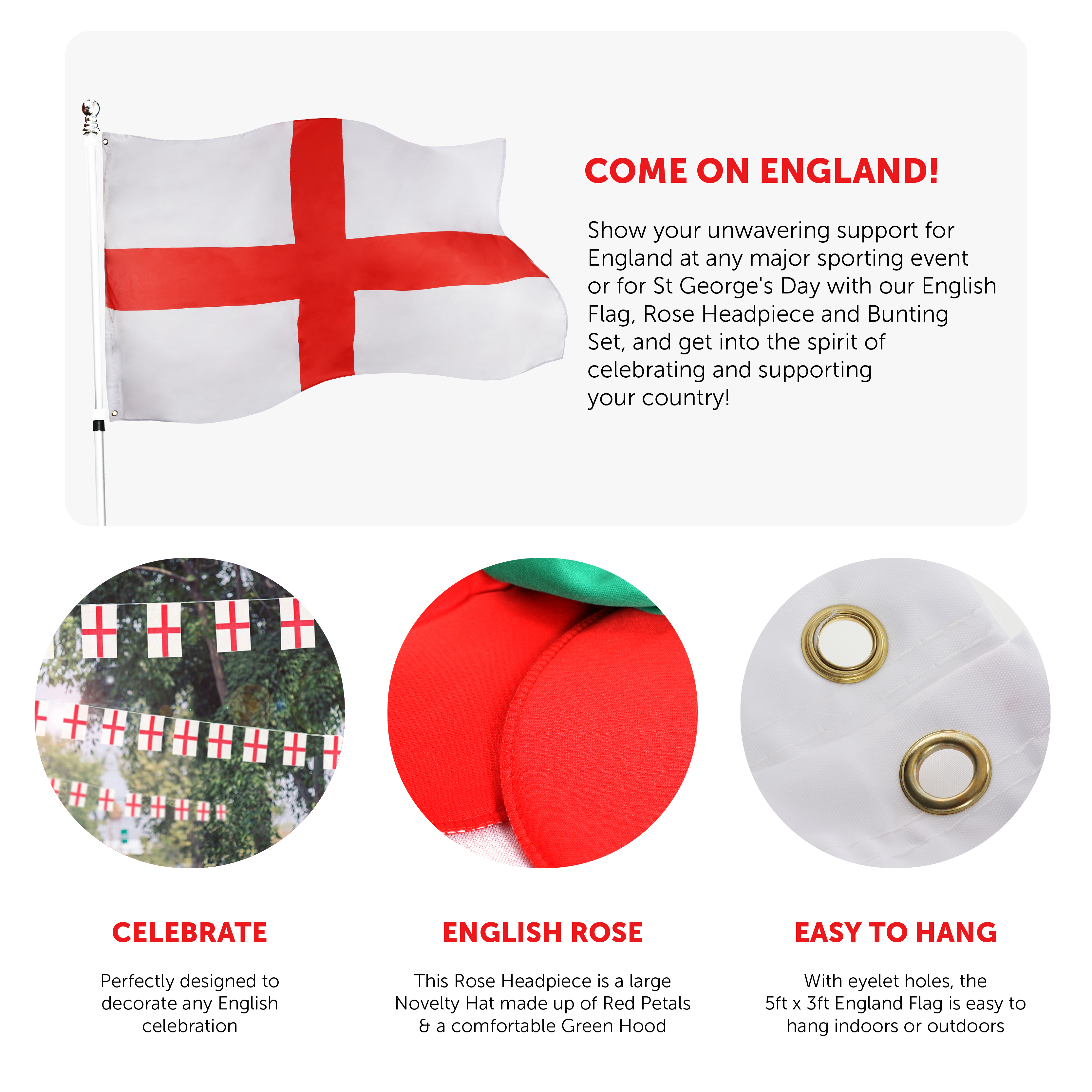 5FT X 3FT ENGLAND FLAG, ROSE HEADPIECE & BUNTING SET: Show your unwavering support for England at any major sporting event or for St George's Day with our English Flag, Rose Headpiece and Bunting Set, and get into the spirit of celebrating and supporting your country!