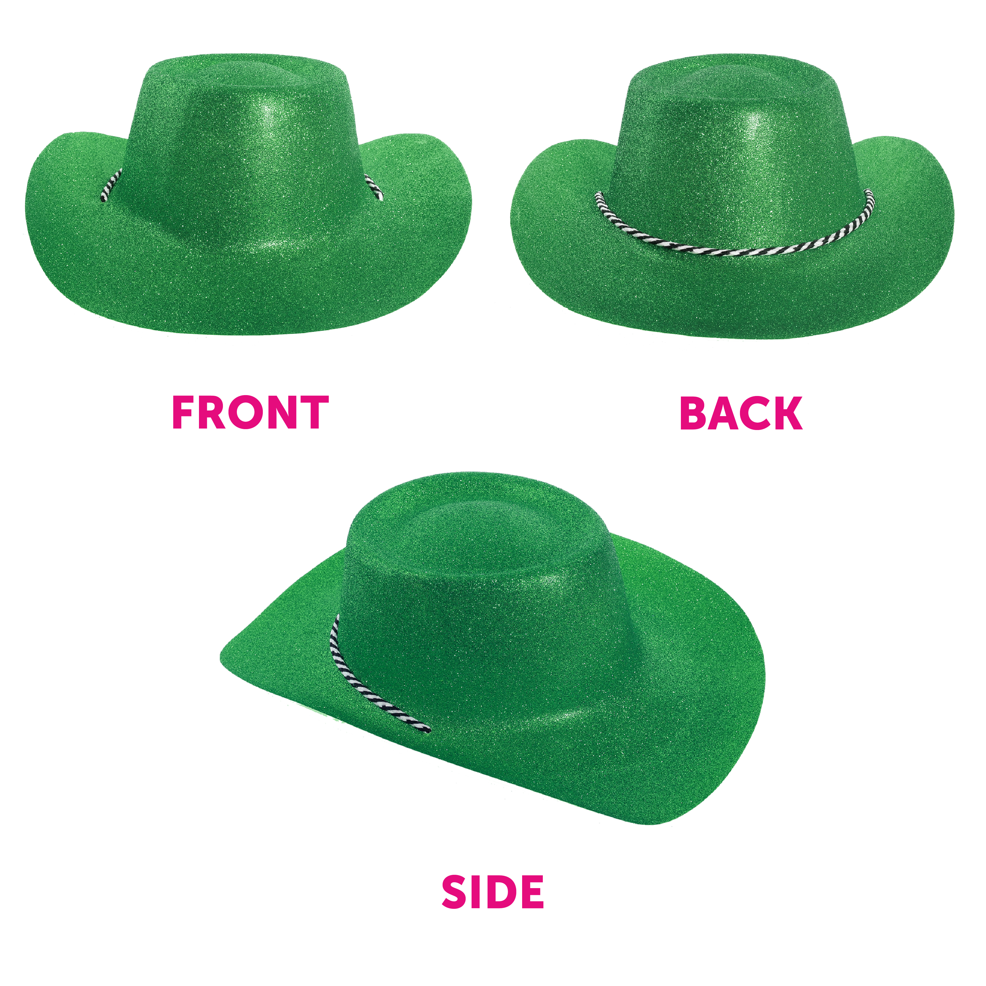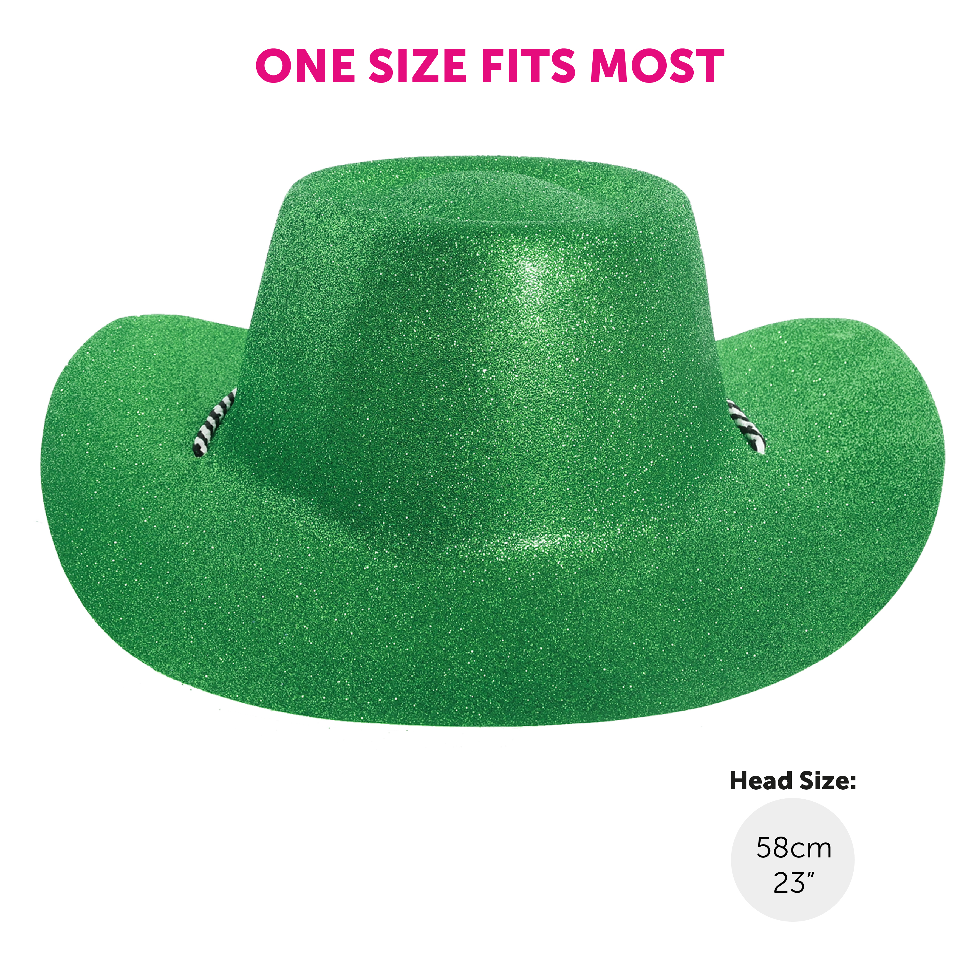 ONE SIZE FITS MOST: Your Green Glitter Cowboy Hat is designed as a comfortable one size fits most, with the head size measuring 58cm (23"), incredibly comfortable for most!