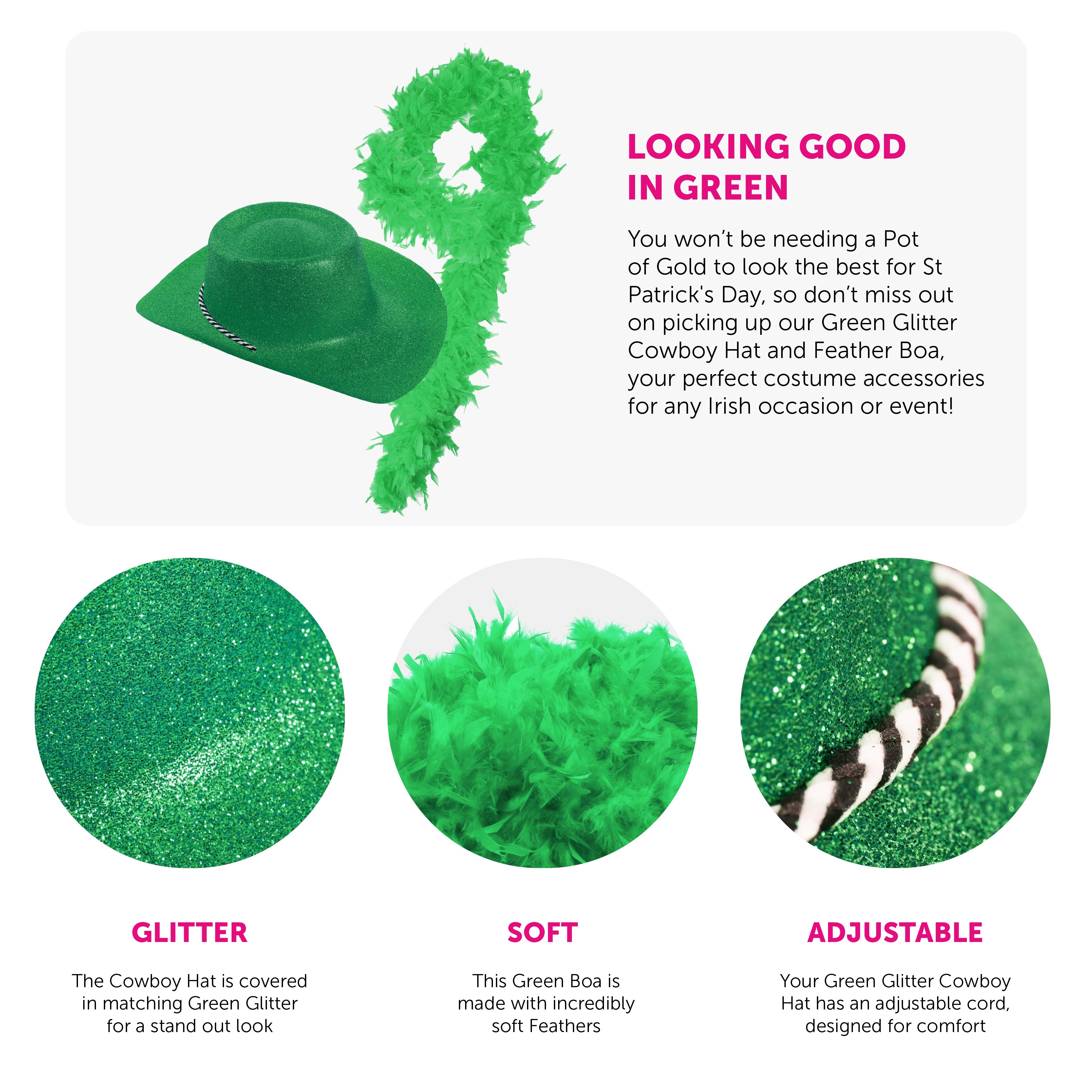 GREEN GLITTER COWBOY HAT & FEATHER BOA: You won’t be needing a Pot of Gold to look the best for St Patrick's Day, so don’t miss out on picking up our Green Glitter Cowboy Hat and Feather Boa, your perfect costume accessories for any Irish occasion or event!