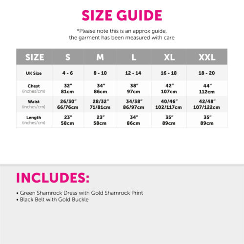 AVAILABLE IN MULTIPLE SIZES: Your Ladies Green St Patrick’s Day Dress is available in multiple sizes from Small to XX-Large: Small (UK 4-6) - Chest: 32"/81cm, Waist: 26-30"/66-76cm, Length: 23"/58cm | Medium (UK 8-10) - Chest: 34"/86cm, Waist: 28-32"/71-81cm, Length: 23"/58cm | Large (UK 12-14) - Chest: 38"/97cm, Waist: 34-38"/86-97cm, Length: 34"/86cm | X-Large (UK 16-18) - Chest: 42”/107cm, Waist: 40-46”/102-117cm, Length: 35”/89cm | XX-Large (UK 18-20) - Chest: 44"/112cm, Waist: 42-48"/107-122cm, Length: 35"/89cm