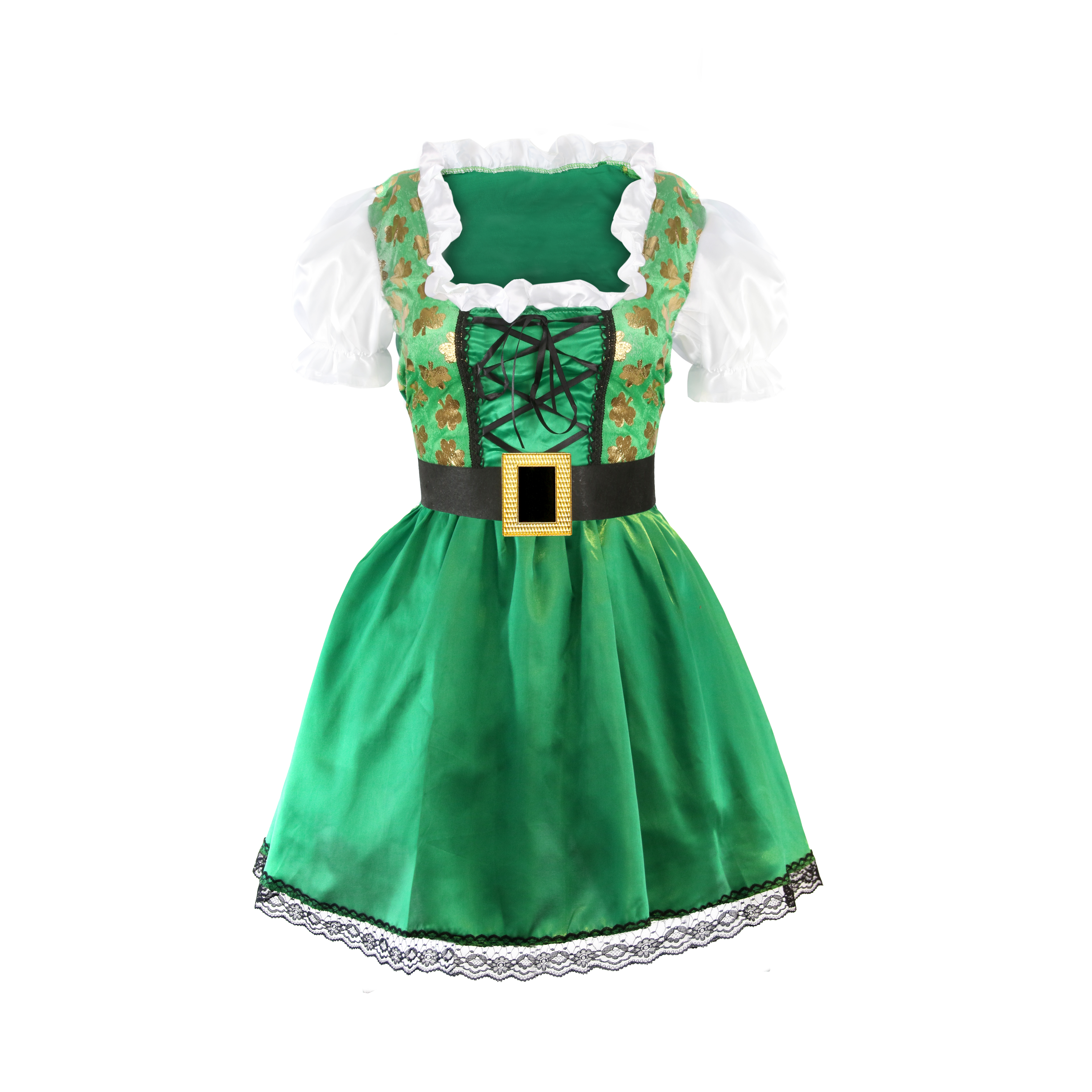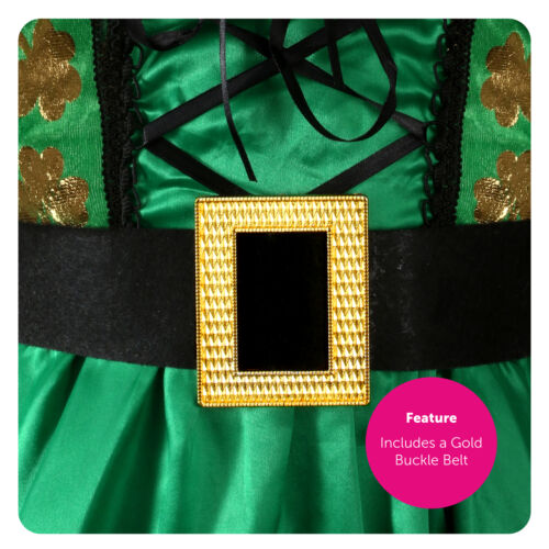 GREEN SHAMROCK IRISH DRESS DETAILS: Your Ladies Green St Patrick’s Day Dress includes a Green Shamrock Dress with Gold Shamrock Print and a Black Belt with Gold Buckle to finish your look!