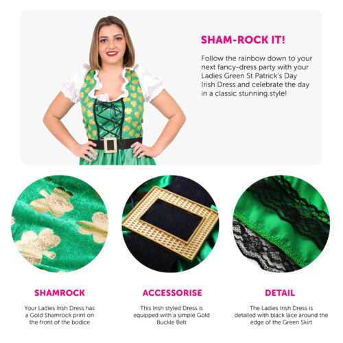 LADIES GREEN ST PATRICK’S DAY IRISH DRESS: Follow the rainbow down to your next fancy-dress party with your Ladies Green St Patrick’s Day Irish Dress and celebrate the day in a classic stunning style!