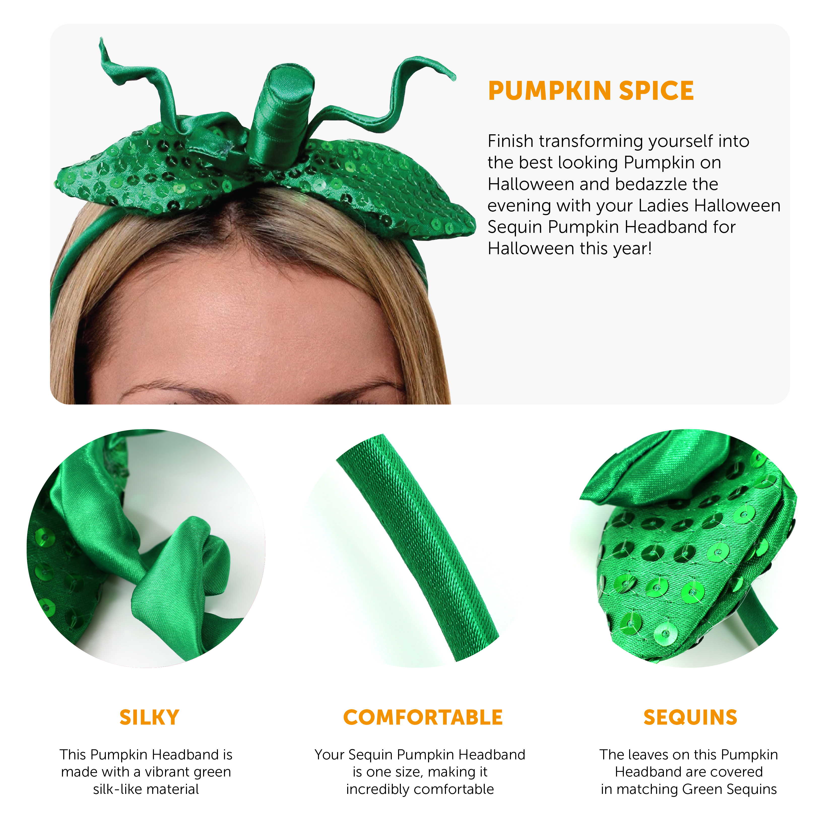 COMPLETE YOUR PUMPKIN DRESS COSTUME: With your beautiful orange sequin pumpkin dress ready for you to wear for the big night, you should add the finishing touch with our Ladies Sequin Pumpkin Headband!