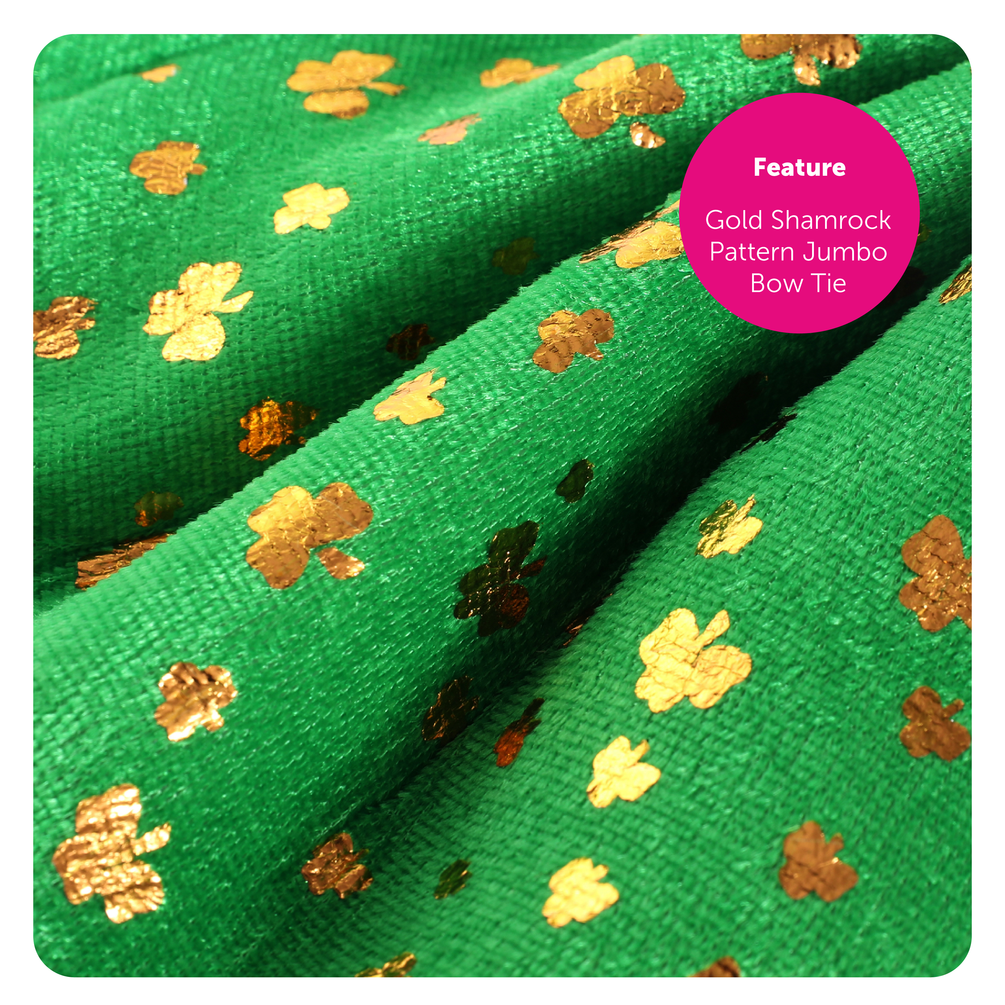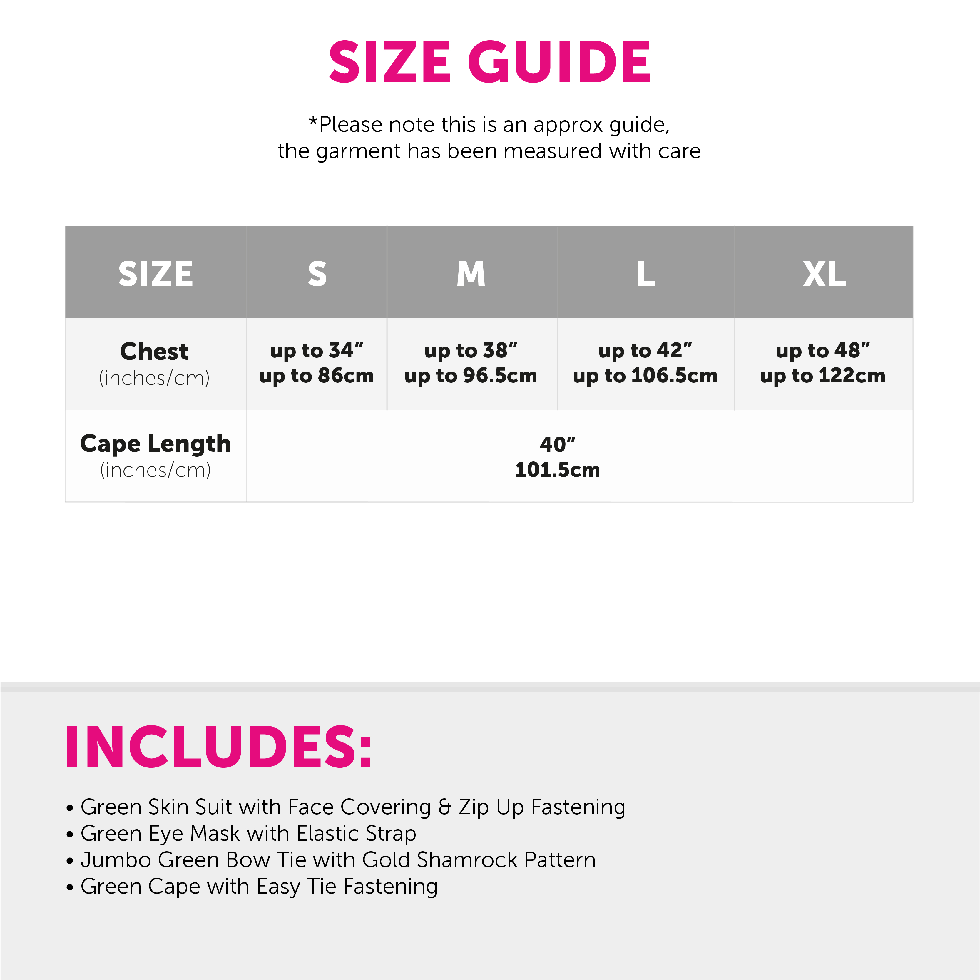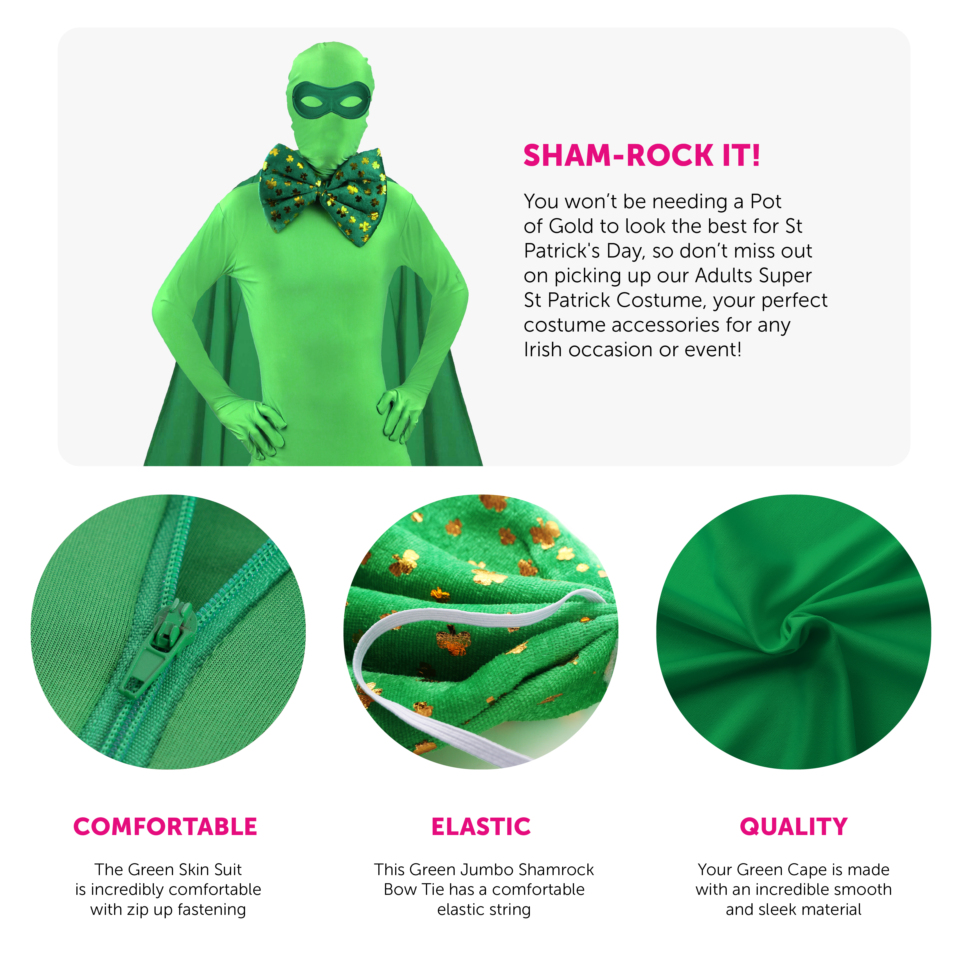 SET INCLUDES: This Adults Super St Patrick Set includes a Green Skinsuit, a Green Eye Mask with an elastic strap, a Green Cape with easy tie-up fastening, and a Jumbo Green Bow Tie with a Golden Shamrock pattern, you'll be sure to look the part at any Irish event!