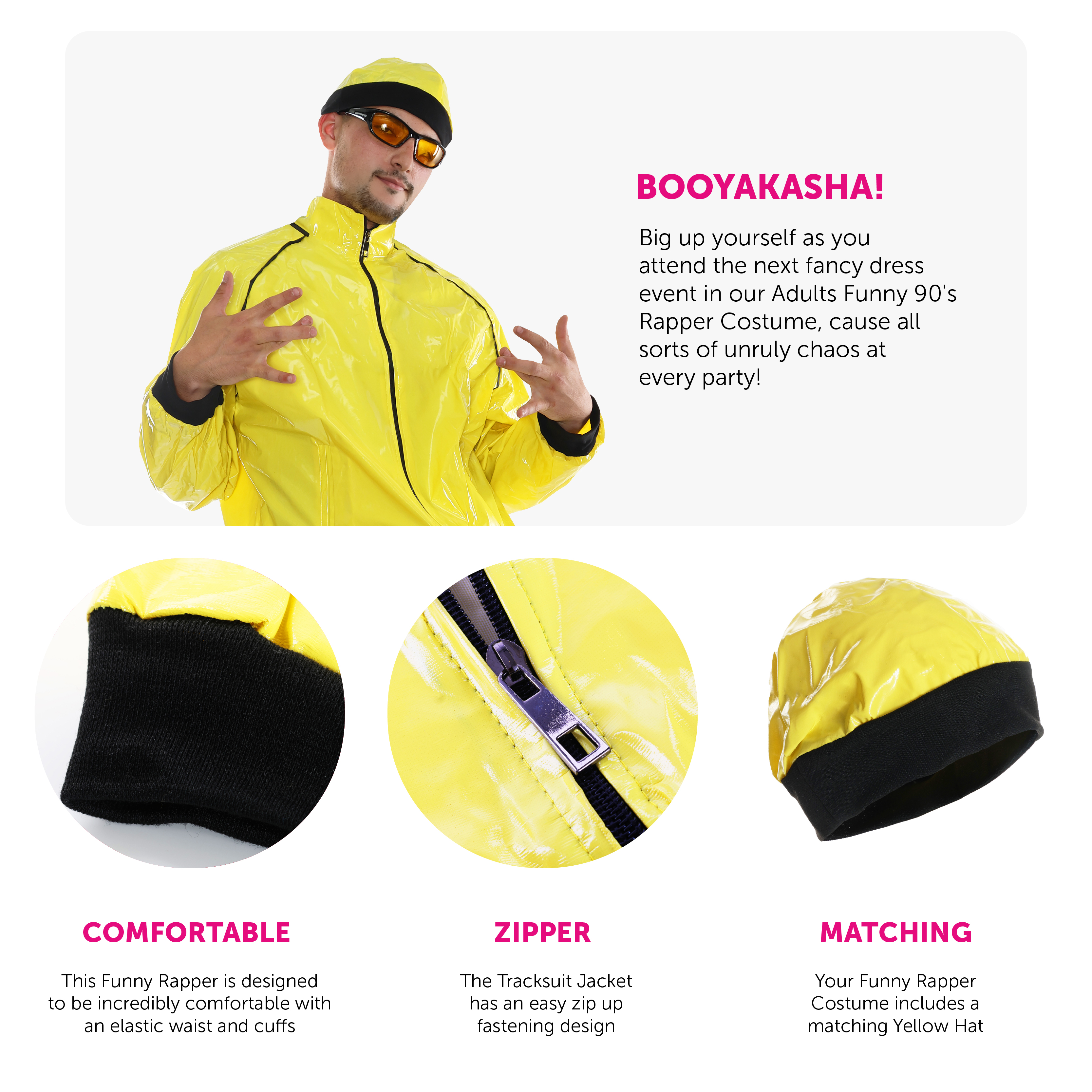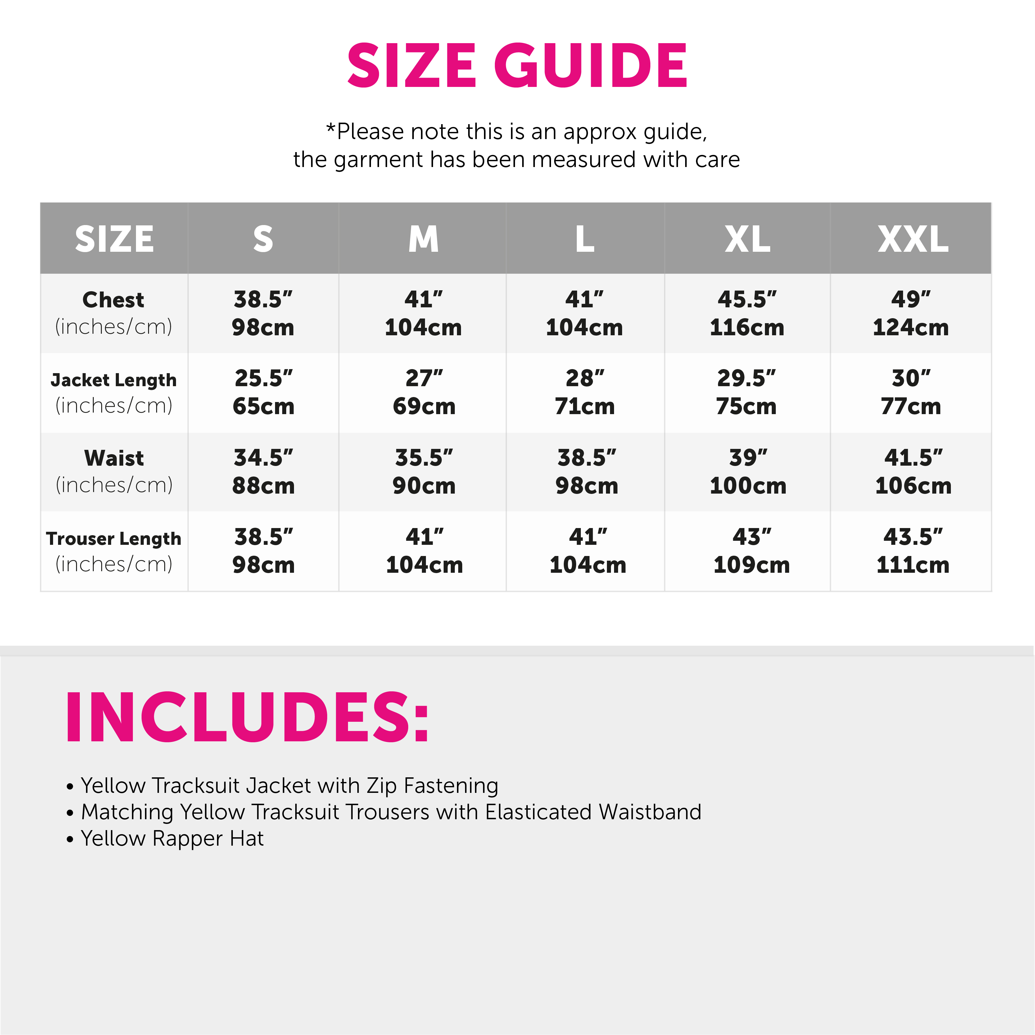 COSTUME DETAILS: Your Funny Rapper Costume includes a bright Yellow Tracksuit Jacket with matching Trousers and Hat, the perfect Costume set for any fancy dress event!