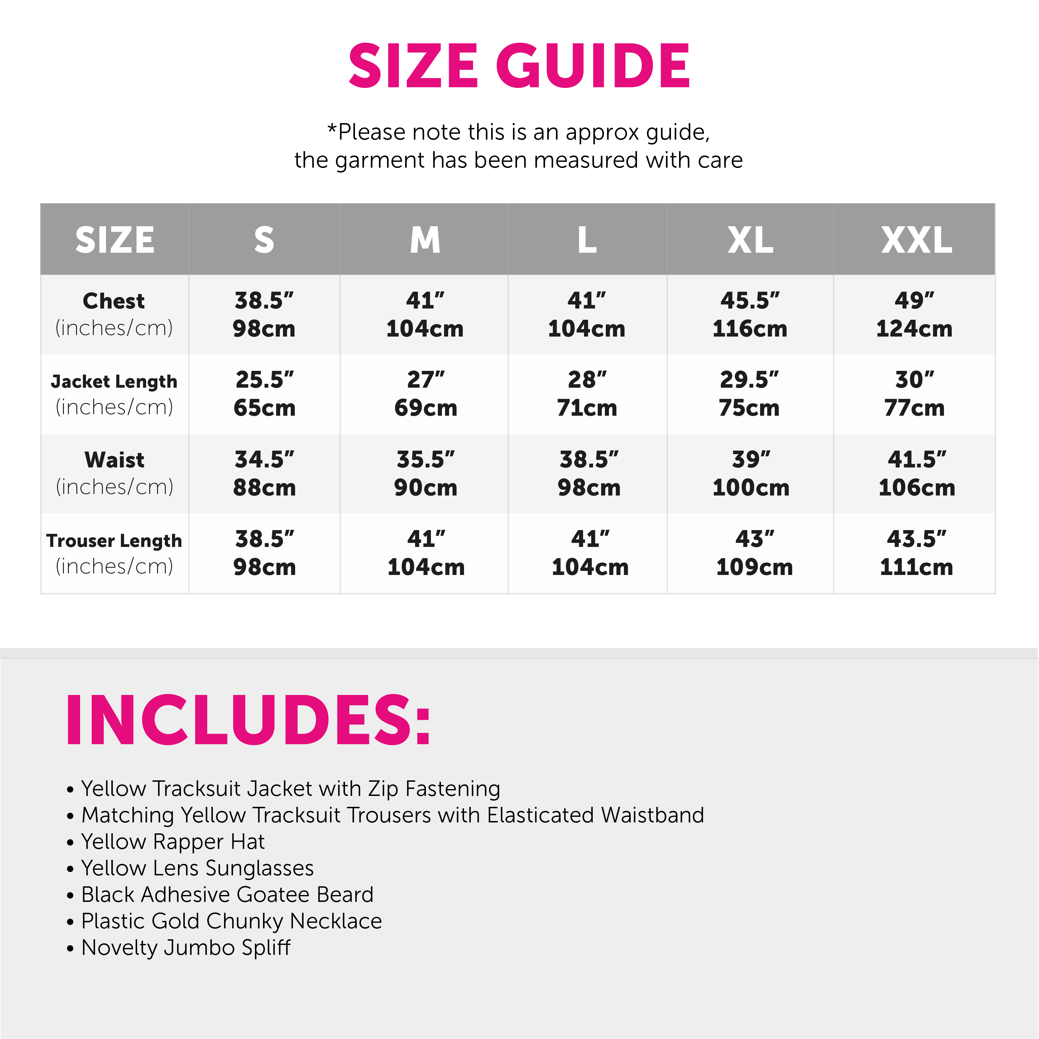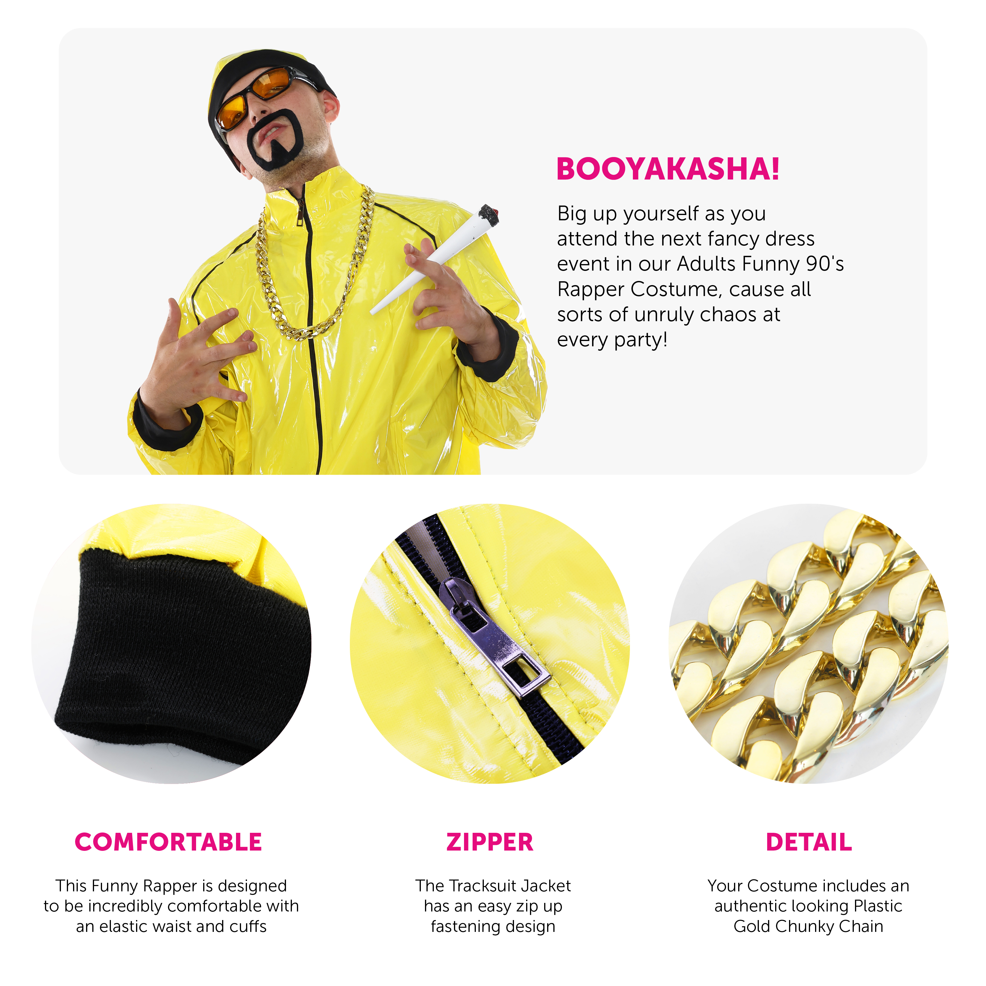 COSTUME DETAILS: Your Funny Rapper Costume includes a bright Yellow Tracksuit Jacket with matching Trousers, a Yellow Hat, Yellow Lens Sunglasses, a Black Adhesive Goatee Beard, a Chunky Plastic Gold Chain Necklace, and a Novelty Jumbo Spliff, the perfect Costume set for any fancy dress event!
