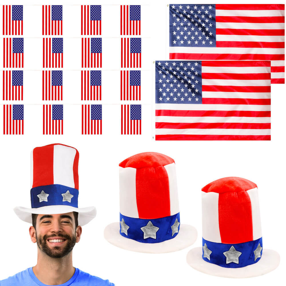 - Includes: 2x Packs Of USA Bunting, 2x USA 5ft X 3ft Flags & 2x Uncle Sam Top Hats