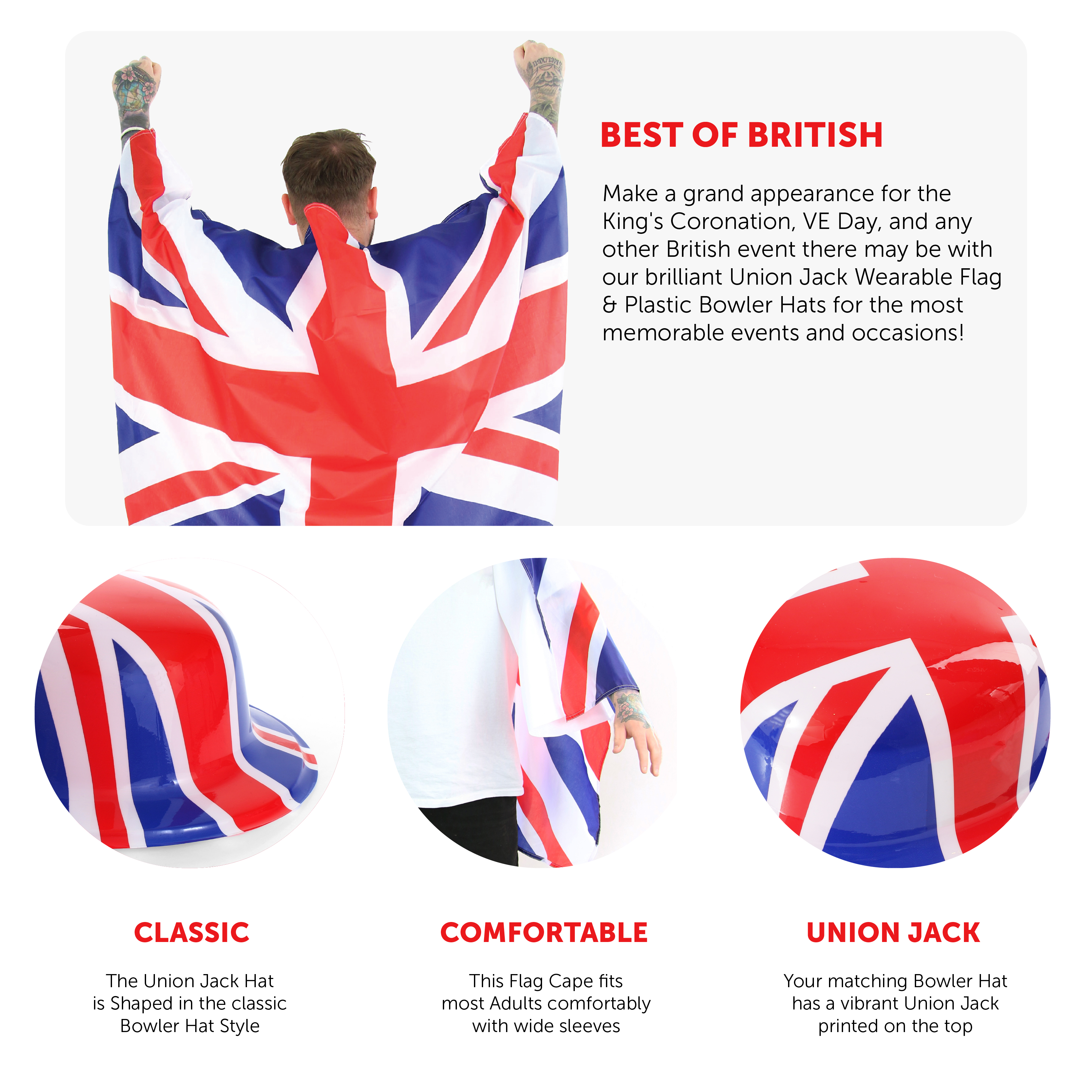 UNION JACK WEARABLE FLAG & BOWLER: Make a grand appearance for the King's Coronation, VE Day, and any other British event there may be with our brilliant Union Jack Wearable Flag & Plastic Bowler Hats for the most memorable events and occasions!
