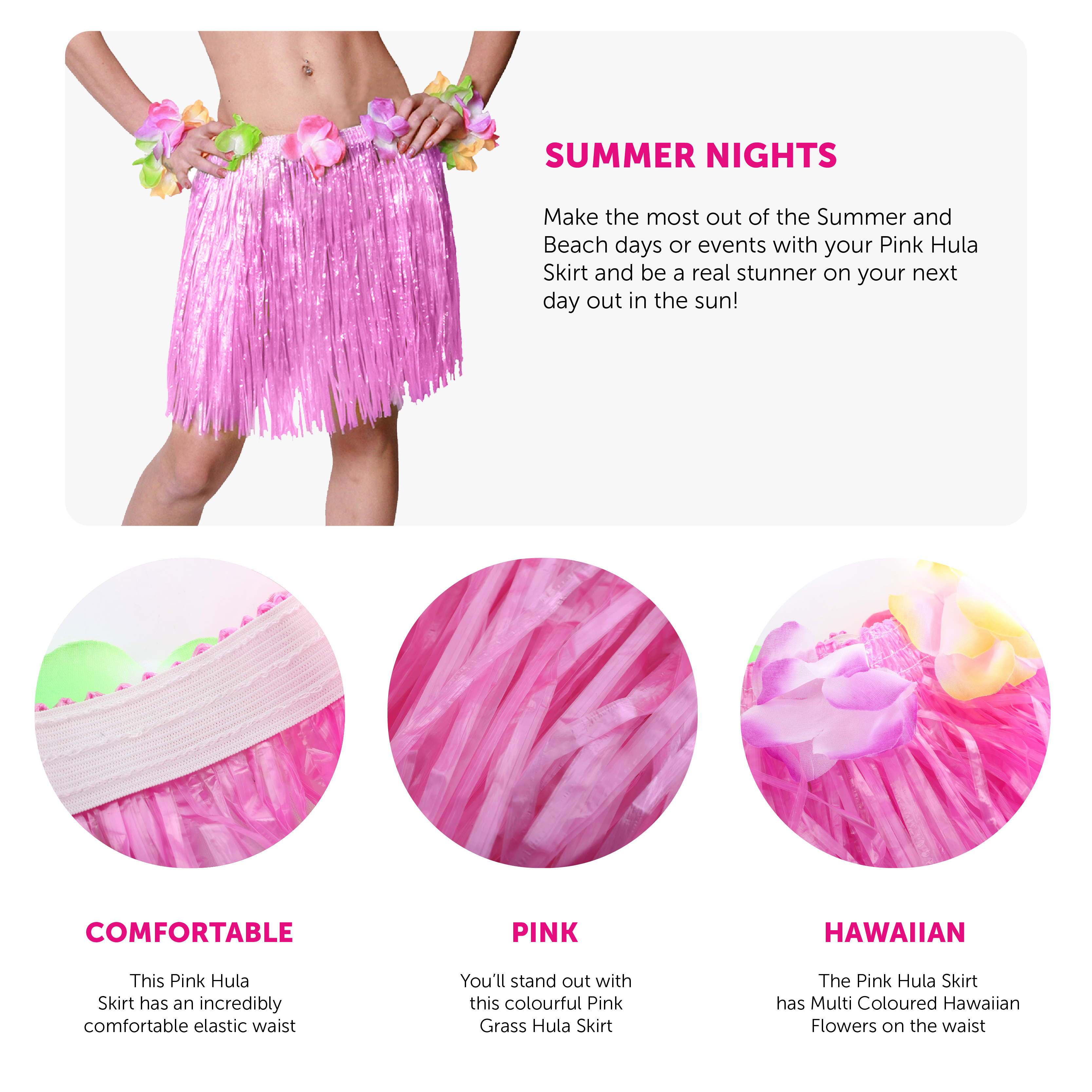 HULA SKIRT DETAILS: Your Hula Skirt is a Pink, grass-like Skirt with an elasticated waistband and multi coloured decorative Hawaiian Lei Flowers, all tropical and ready for the beach!