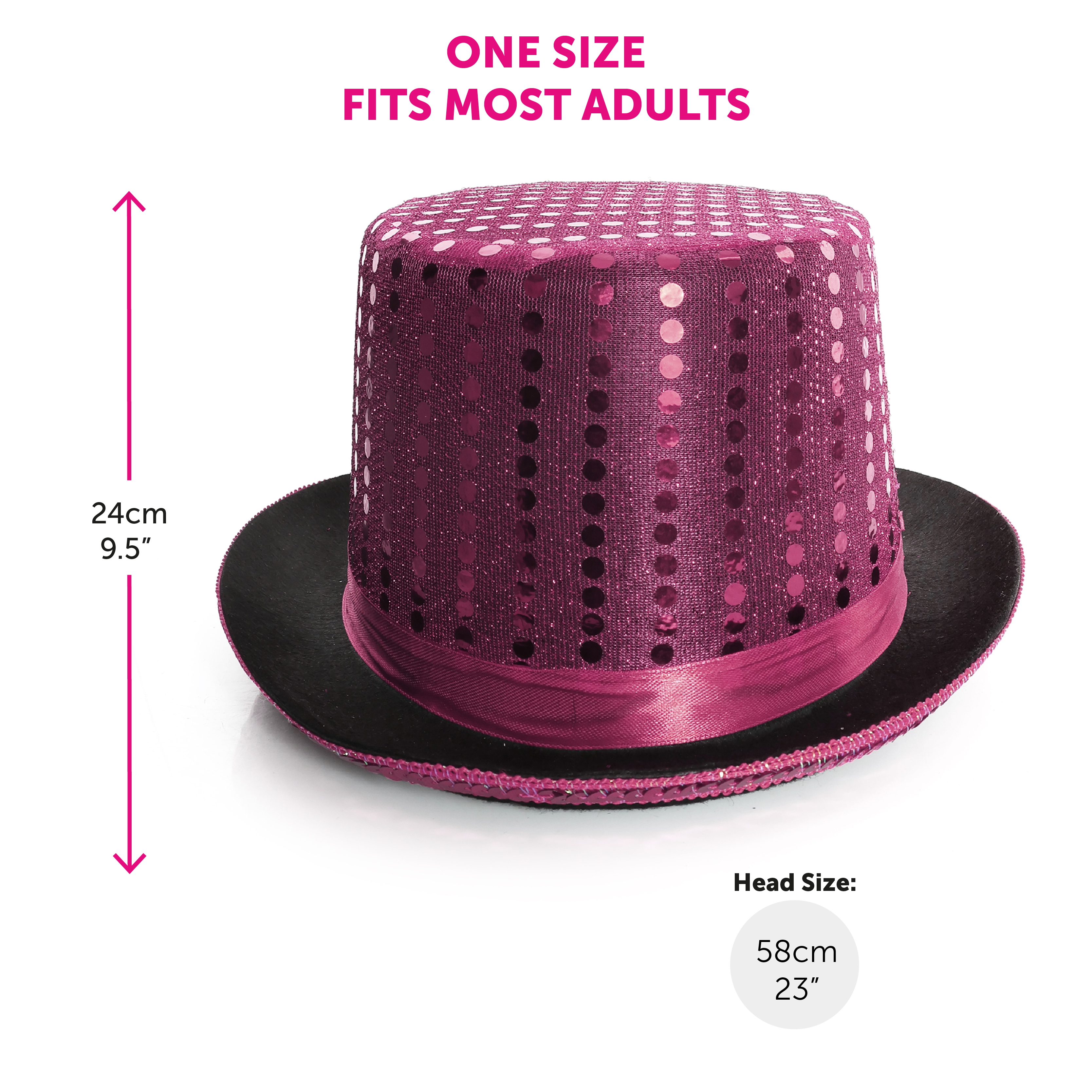 ONE SIZE FITS MOST: Your Pink Sequin Hat stands at a height of 24cm (9.5") and has a head size of 58cm (23"), being one size makes it suitable for most Adults to wear comfortably!