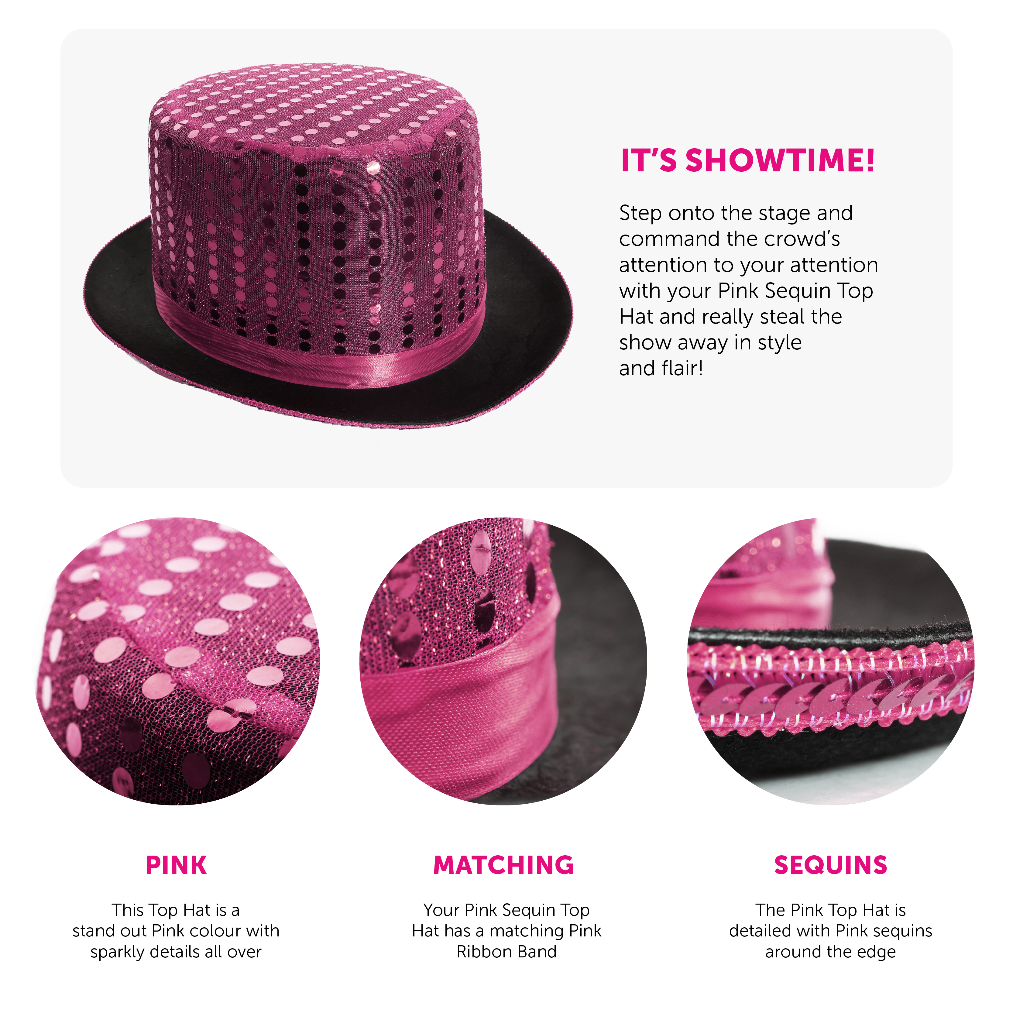 HAT DETAILS: The classic Top Hat design has been brought back to life with a fantastic new style! Your Top Hat has a Pink Satin quality with matching Sequin details on the top, and a detailed trim!