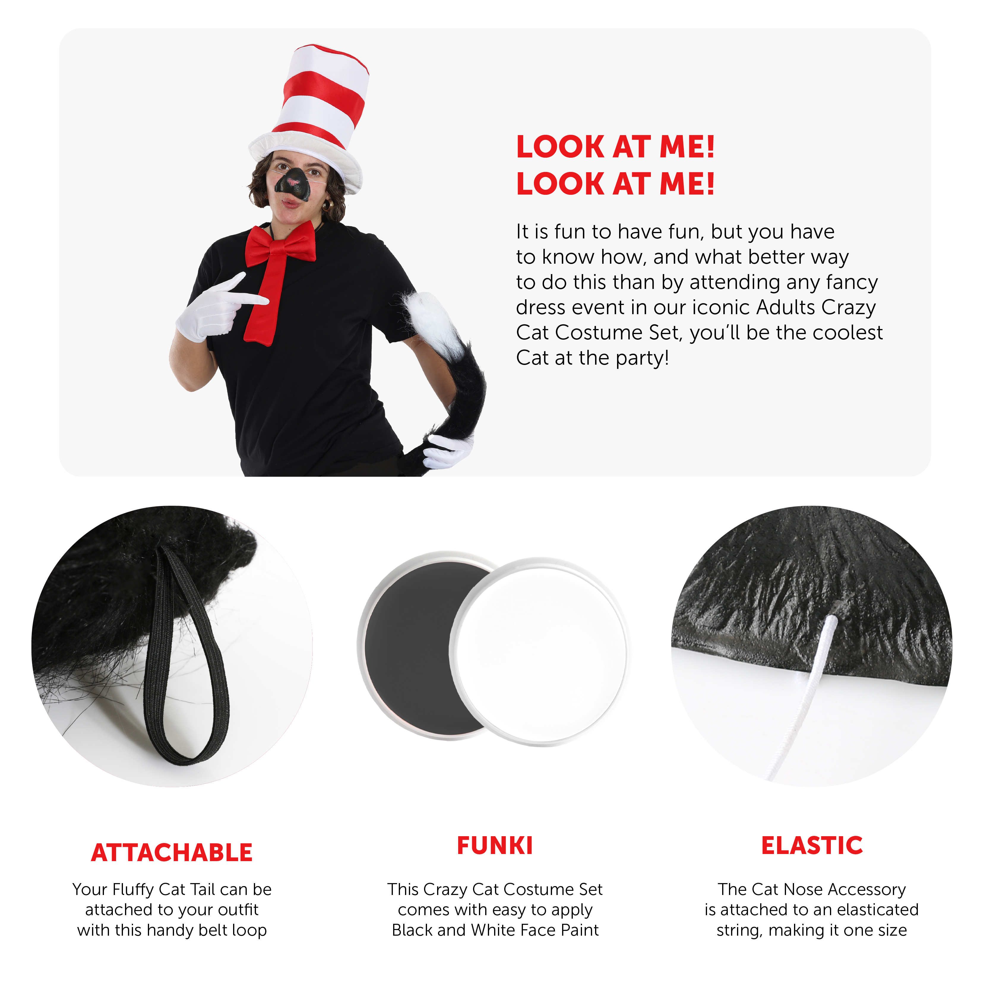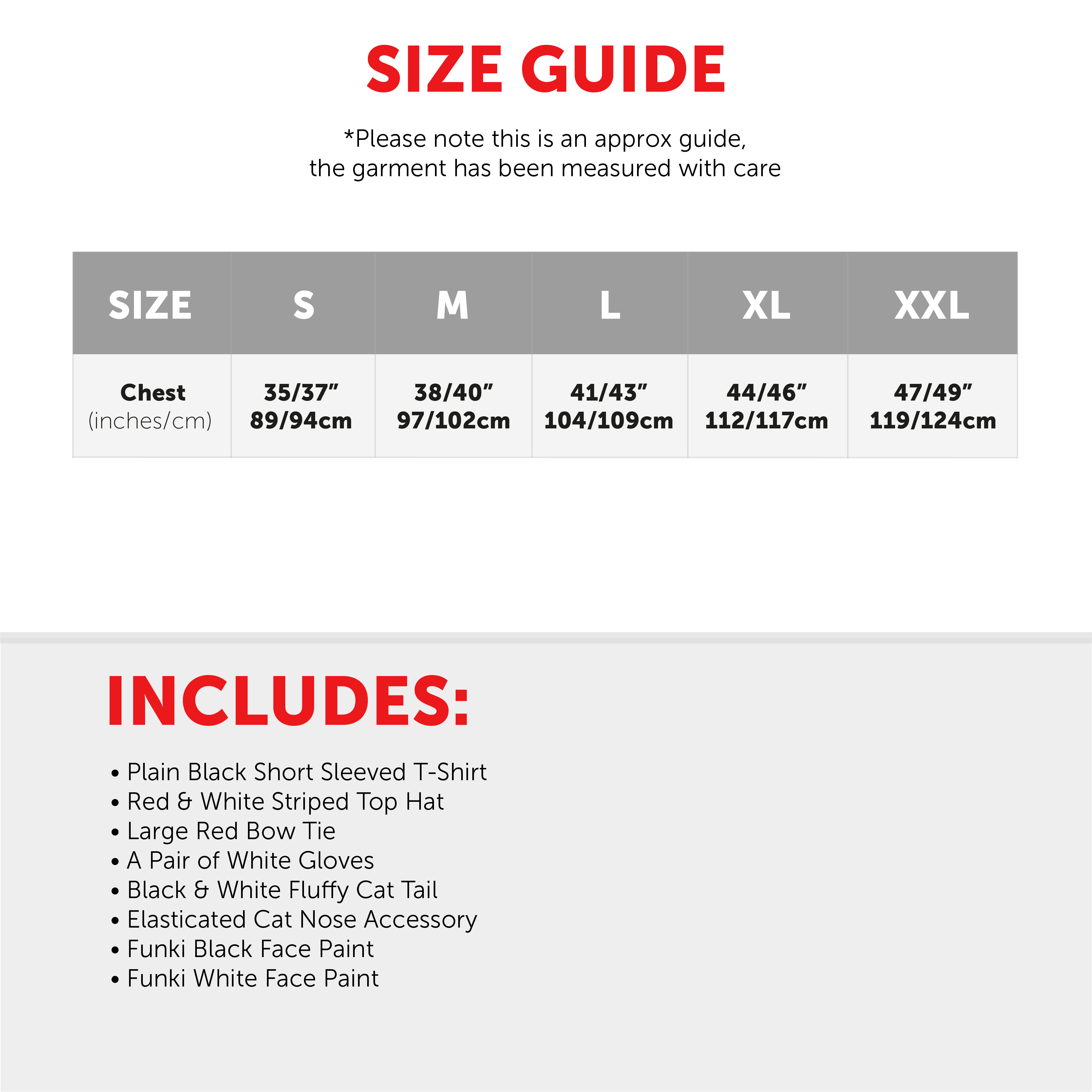 CRAZY CAT COSTUME DETAILS: Your Adults Crazy Cat Costume Set includes a tall, Red and White Striped Top Hat, a Plain Black T-Shirt, a Cat Nose Accessory on elasticated string, a Black and White Faux Fur Tail, a pair of White Gloves, a large Red Bow Tie, a palette of Black Face Paint and a palette of White Face Paint!