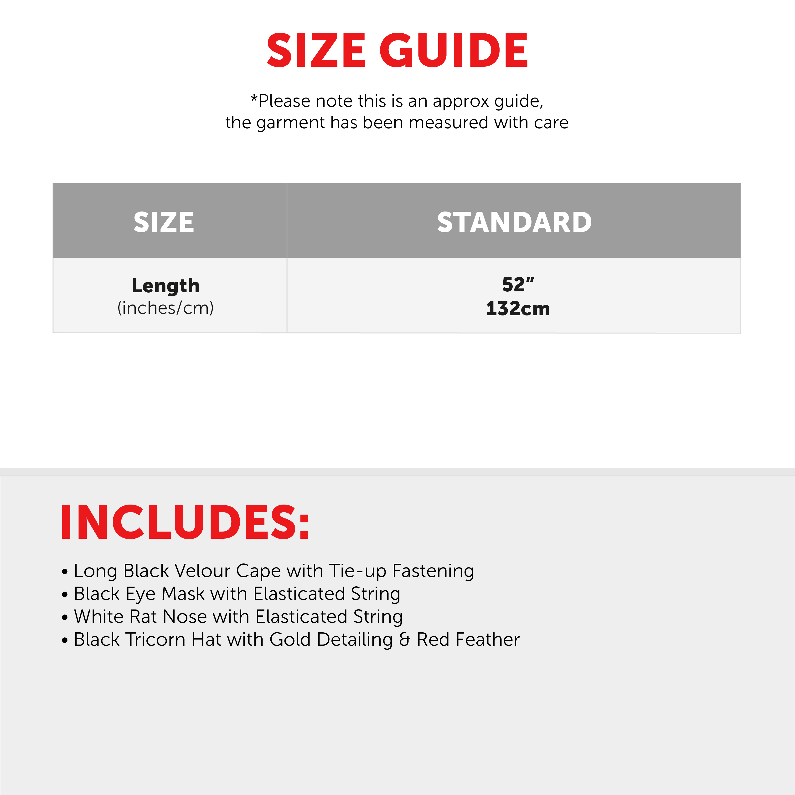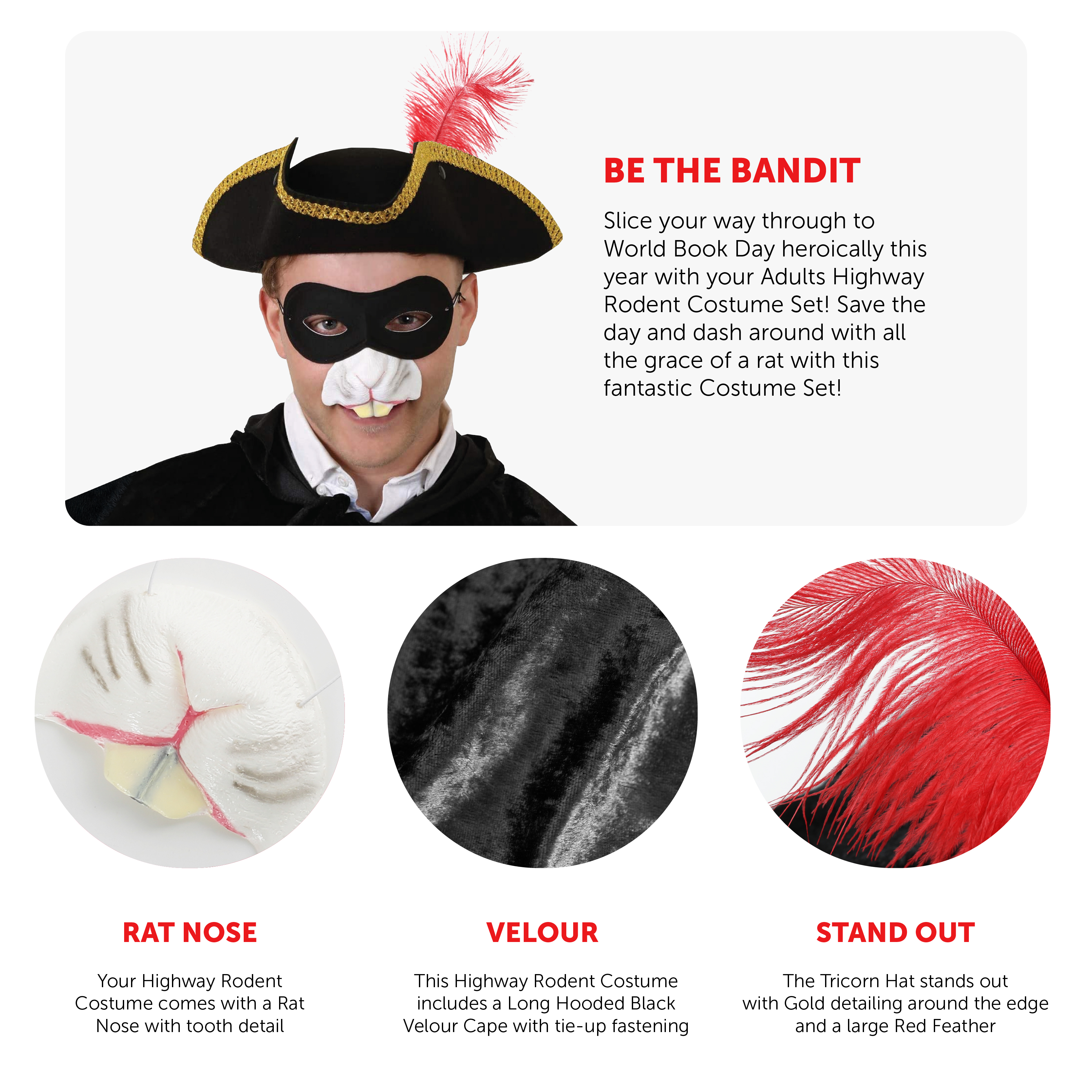 COSTUME SET INCLUDES: Your Adults Highway Rodent Costume Set includes a Long Black Hooded Velour Cape, a Black Tricorn Hat with Gold detailing and a Red Feather, a Black Eye Mask, and a Rat Nose with an elasticated strap!