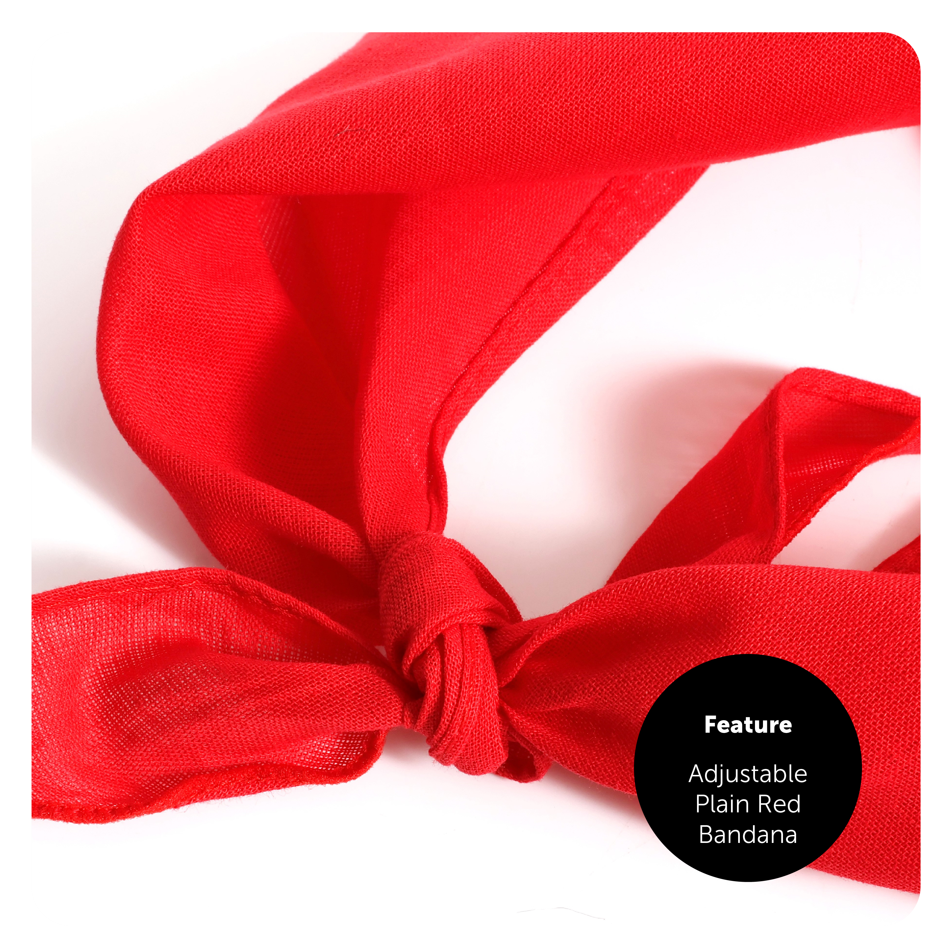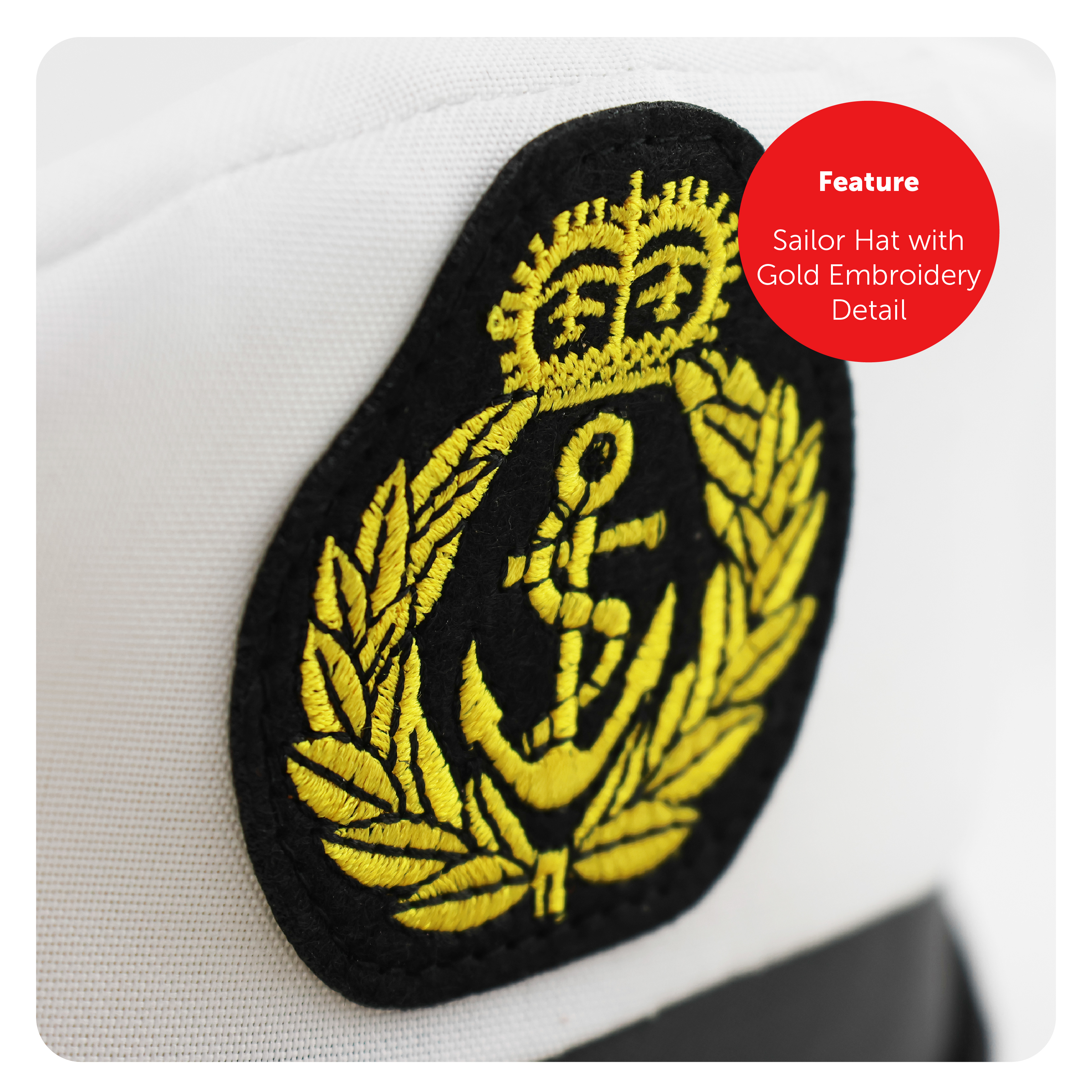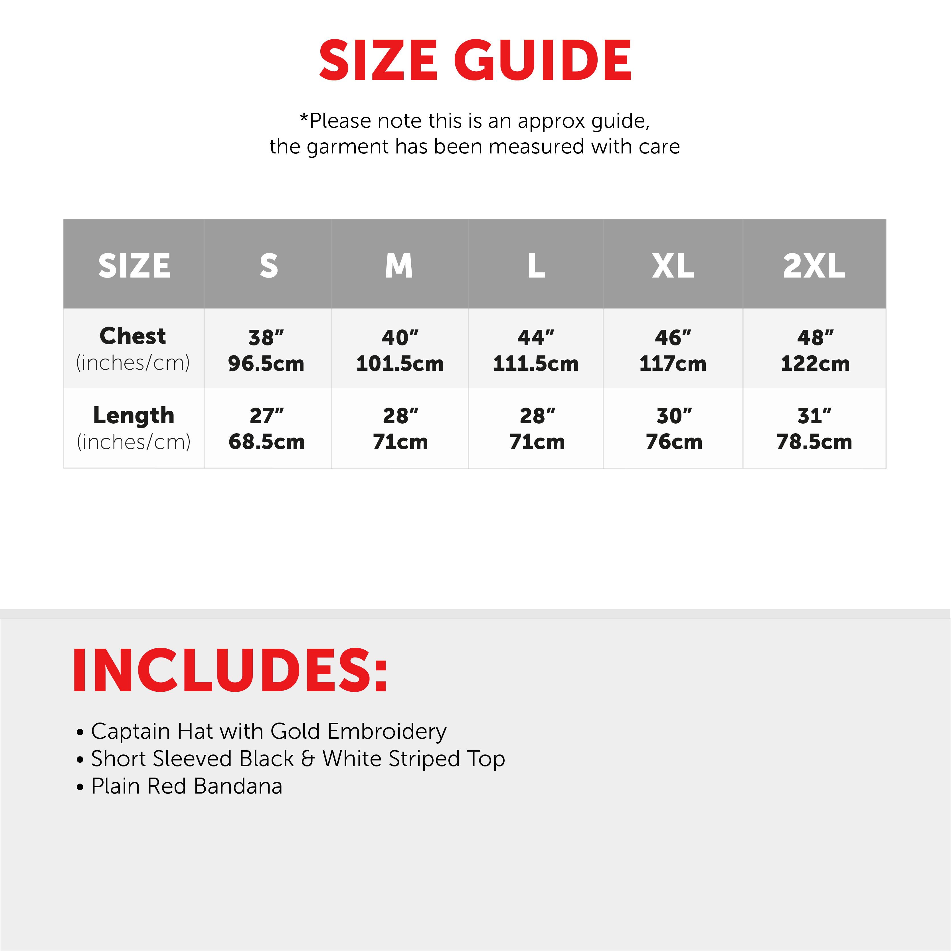 SAILOR SET INCLUDES: This Sailor Costume Set includes a White Sailor Hat with Golden Embroidered details, a Plain Red Bandana, and a Short Sleeved Black & White Striped T-Shirt, the perfect look for any fancy dress event!