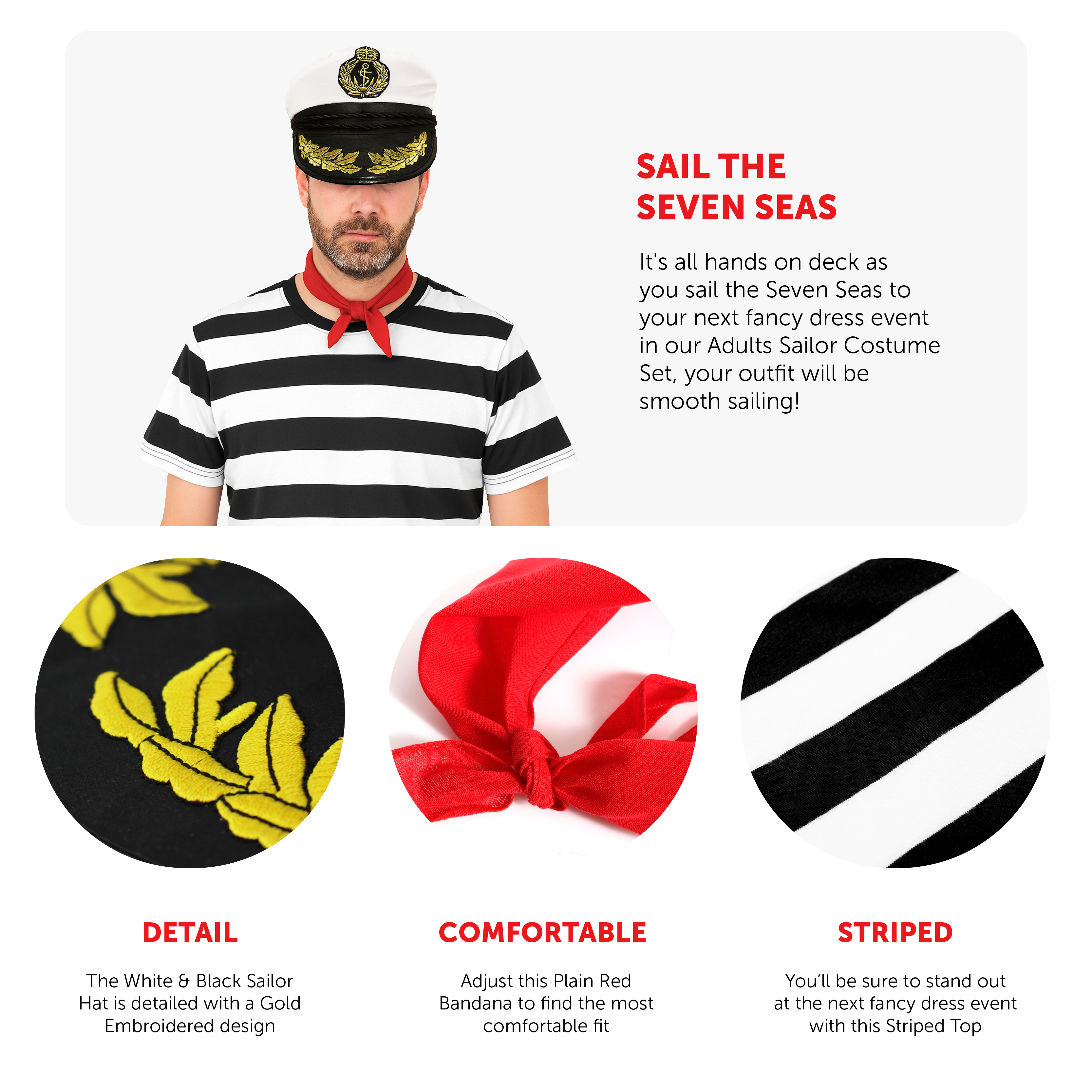 Adults Sailor Costume Set - Black & White Tee, Captain Hat & Red Bandana