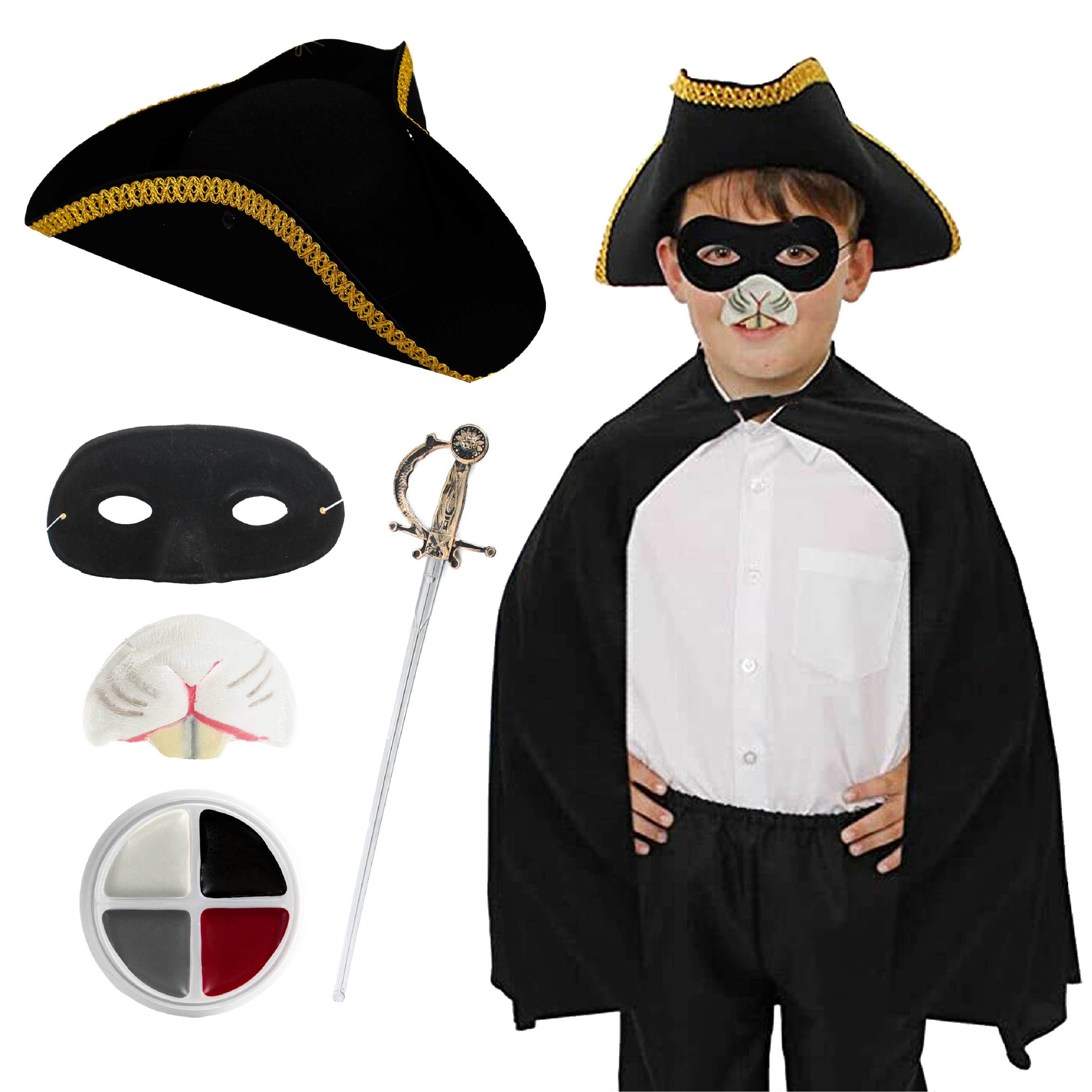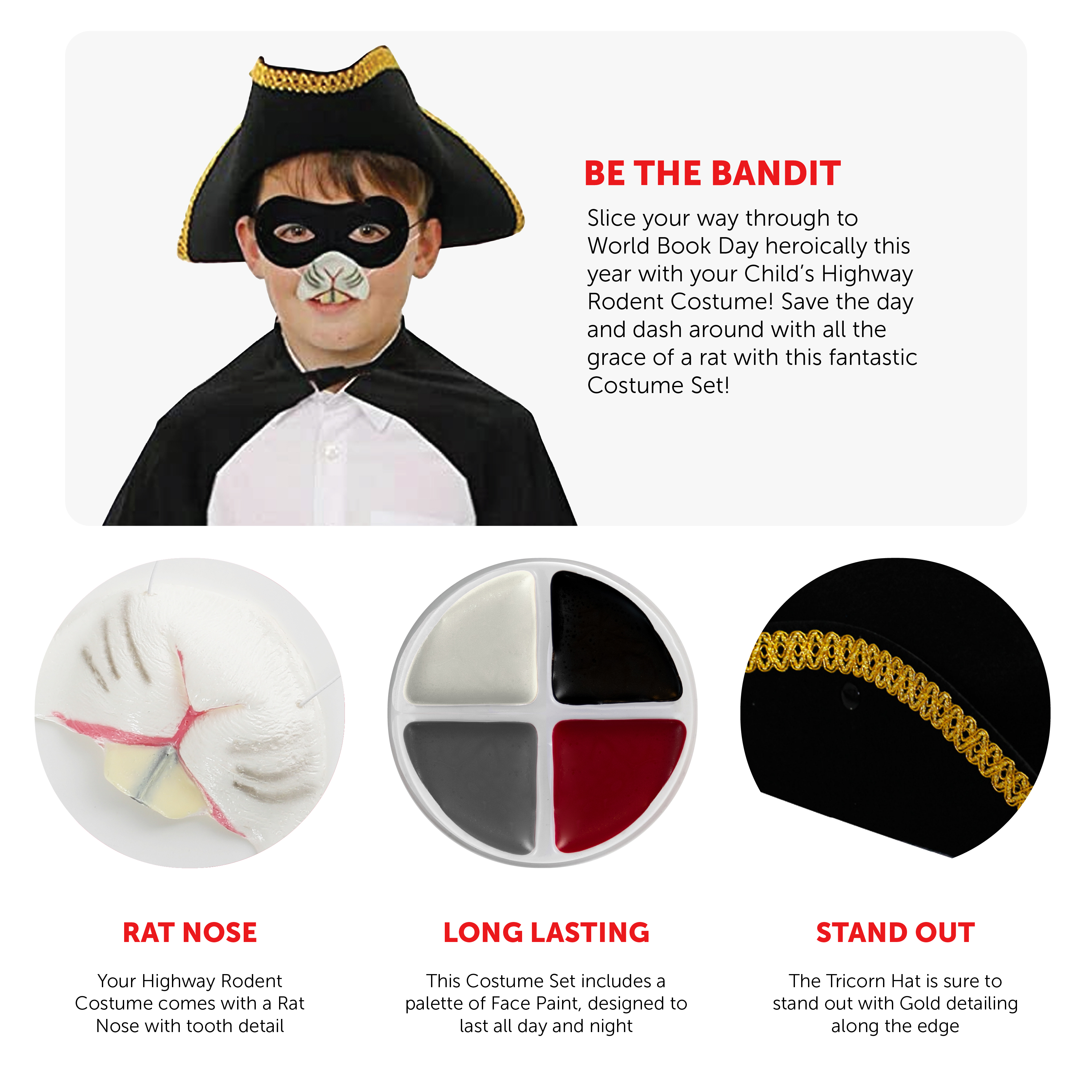 SET INCLUDES: Your Child's Highway Rodent Set includes a Tricorn Hat with Gold detailing, a Black Eye Mask, a Sword, a Rat Nose on elastic strap, a Black Cape, and a Palette of Face Paint!