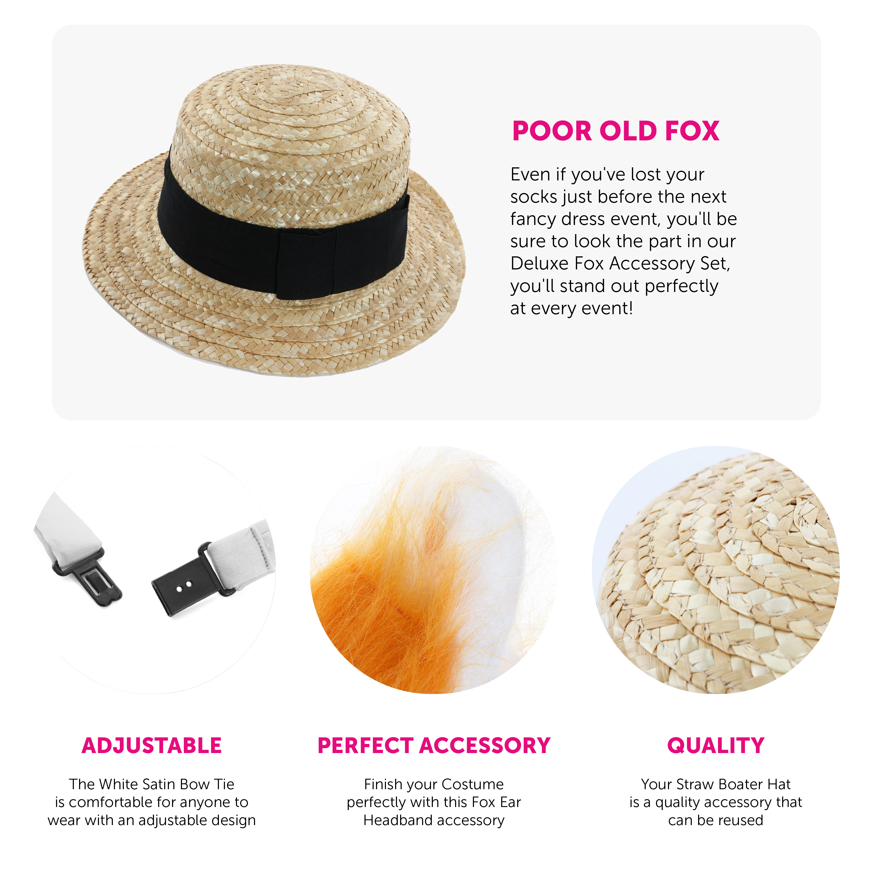 SET INCLUDES: Your Deluxe Fox Accessory Set includes a Straw Boater with a Black Band, an Orange Headband with furry Fox Ears attached, a matching Fox Tail with a belt loop for easy attachment, a Fox's Snout on an elastic strap, and an adjustable White Satin Bow Tie, the perfect look for this World Book Day!