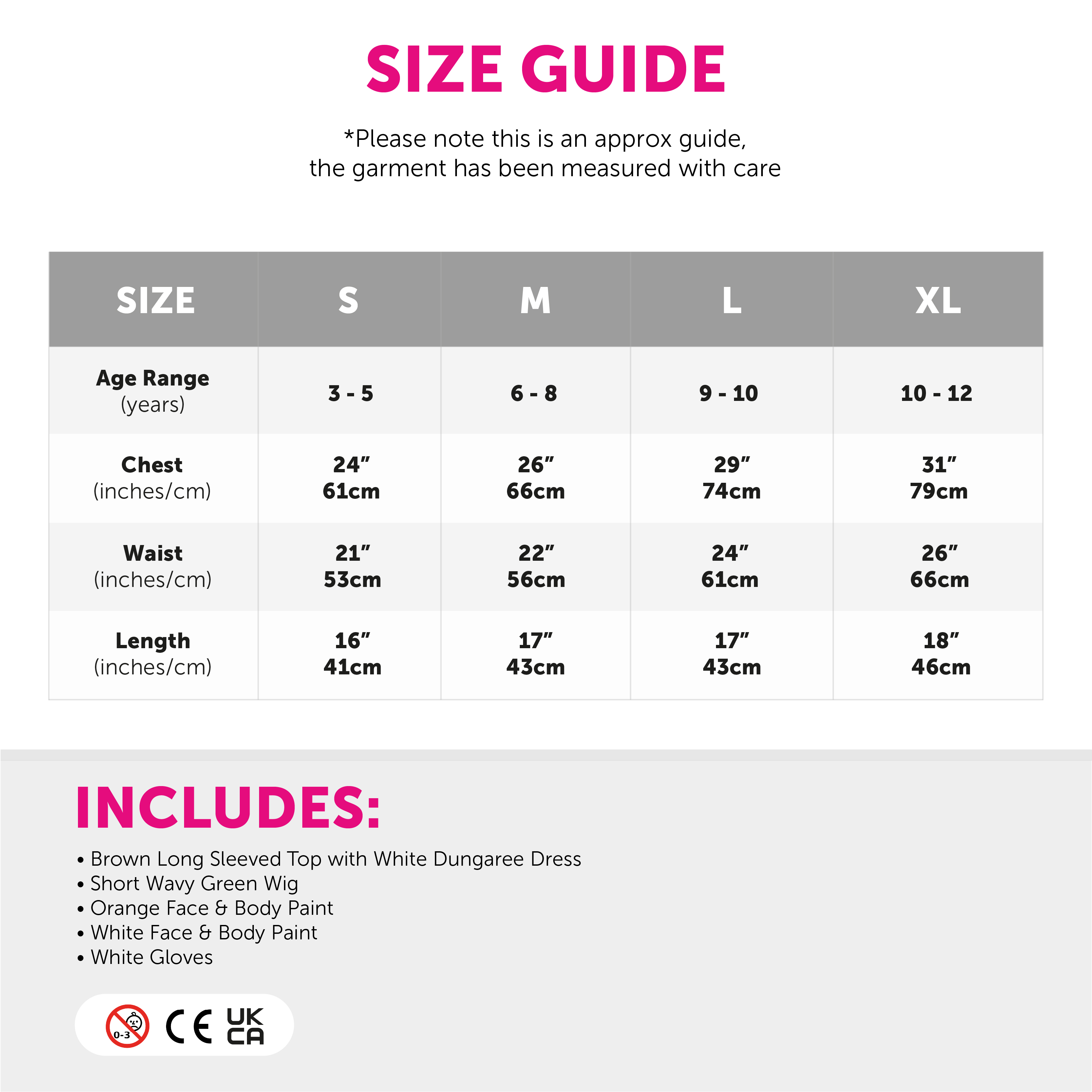 AVAILABLE IN MULTIPLE SIZES: The Girls Factory Worker Costume is available in a range of sizes, from Small to X-Large: Small (3 - 5 years) - Chest: 24" (61cm), Waist: 21" (53cm), Length: 16" (41cm) | Medium (6 - 8 years) - Chest: 26" (66cm), Waist: 22" (56cm), Length: 17" (43cm) | Large (9 - 10 years) - Chest: 29" (74cm), Waist: 24" (61cm), Length: 17" (43cm) | X-Large (10 - 12 years) - Chest: 31" (79cm), Waist: 26" (66cm), Length: 18" (46cm)