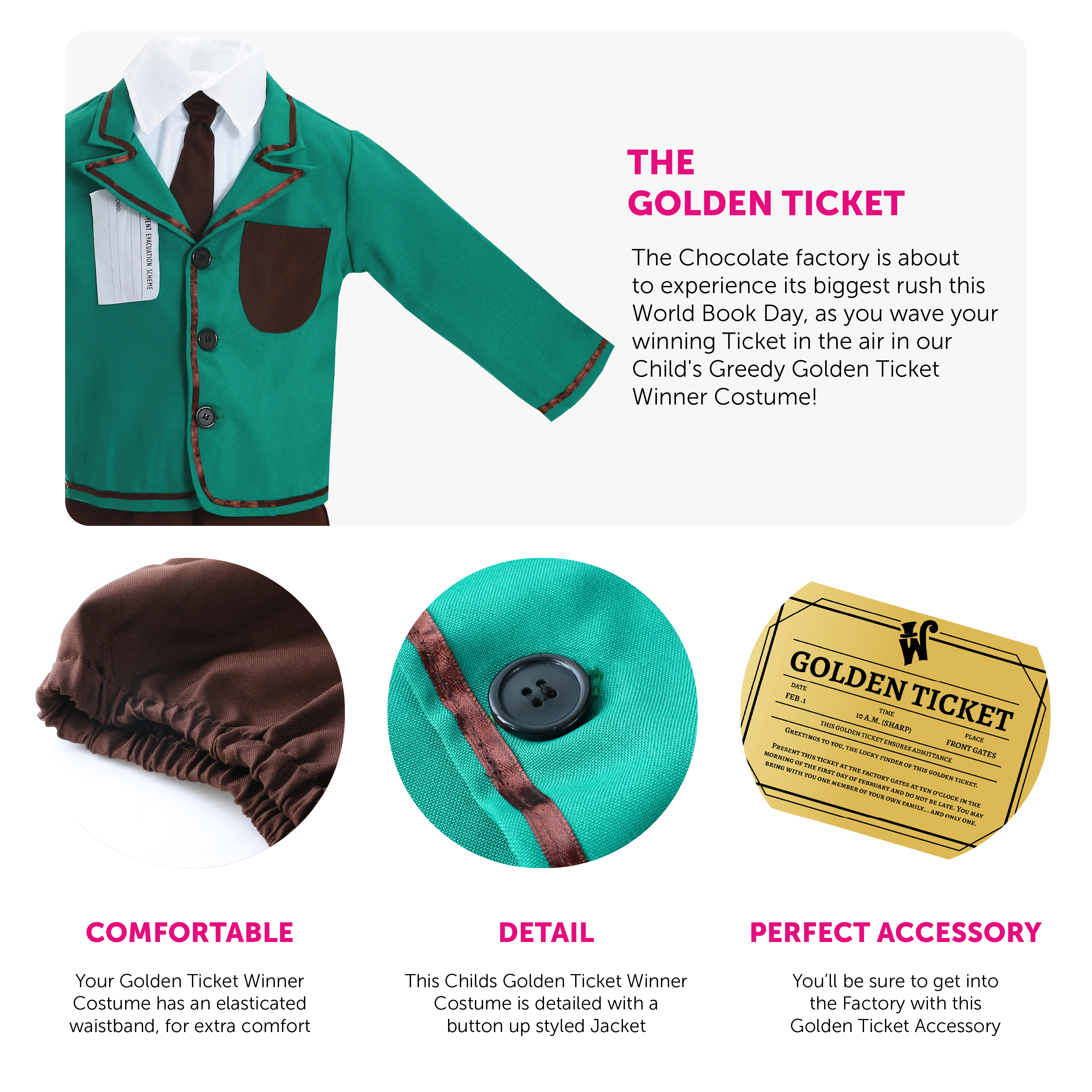 CHILD'S GREEDY GOLDEN TICKET WINNER COSTUME: The Chocolate factory is about to experience its biggest rush this World Book Day, as you wave your winning Ticket in the air in our Child's Greedy Golden Ticket Winner Costume!
