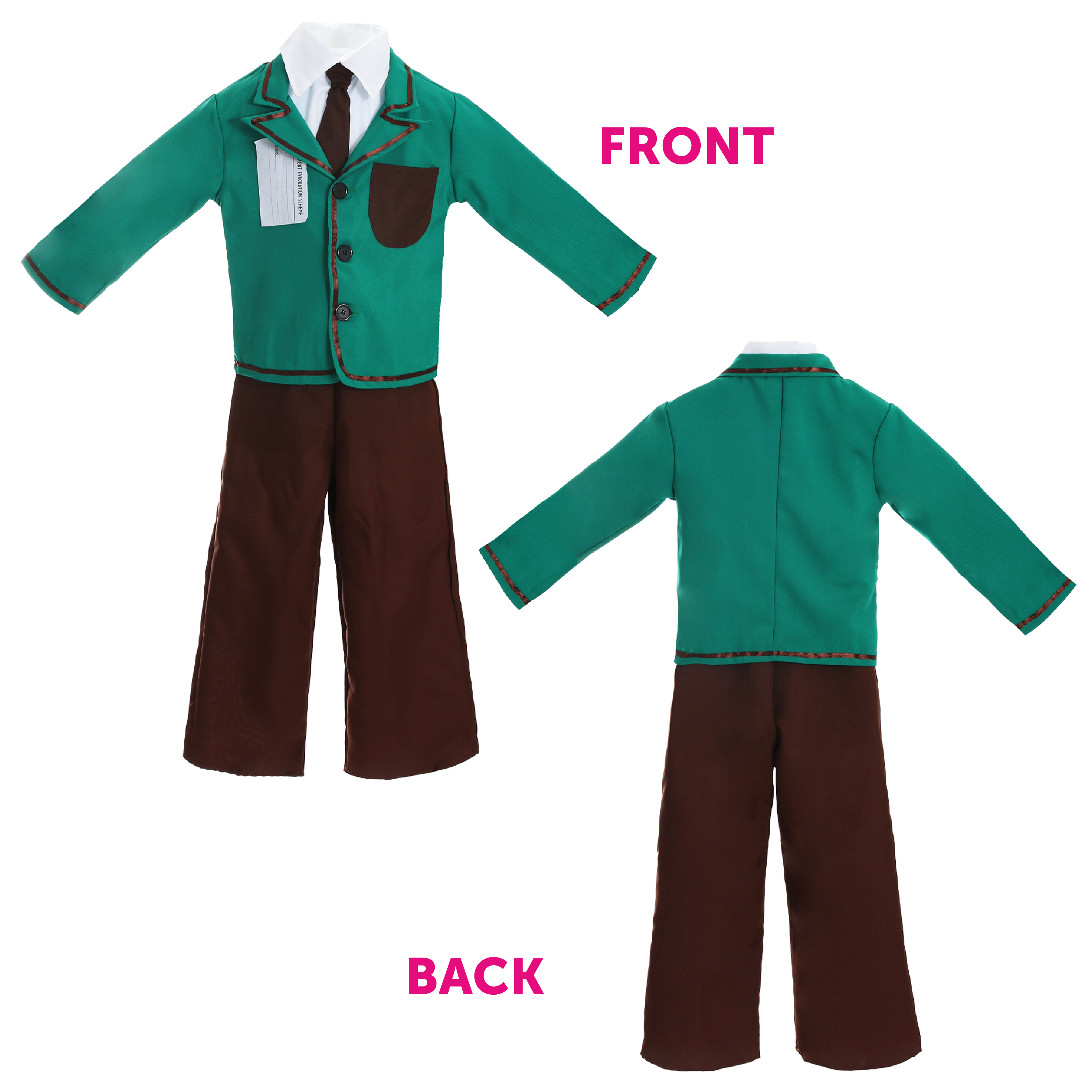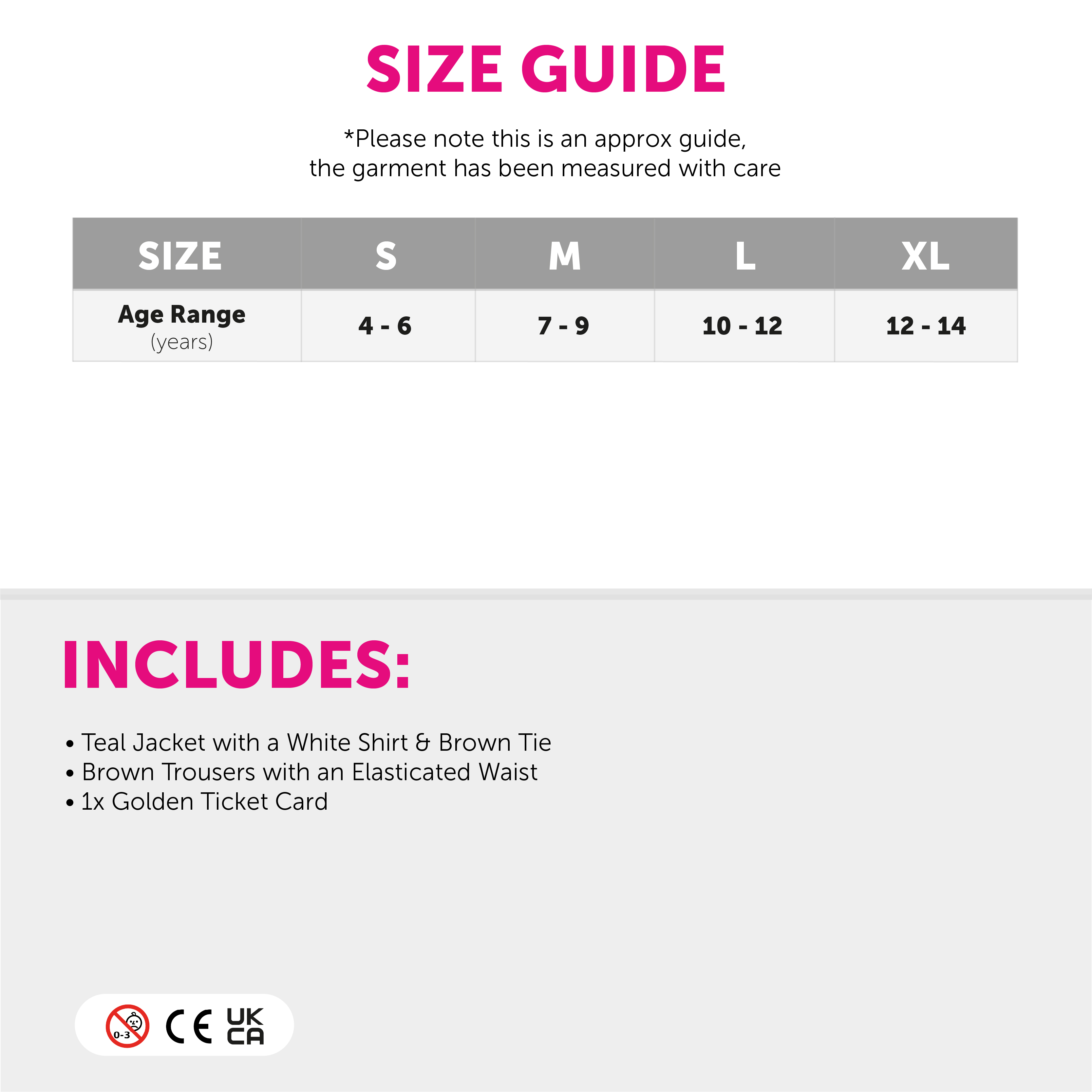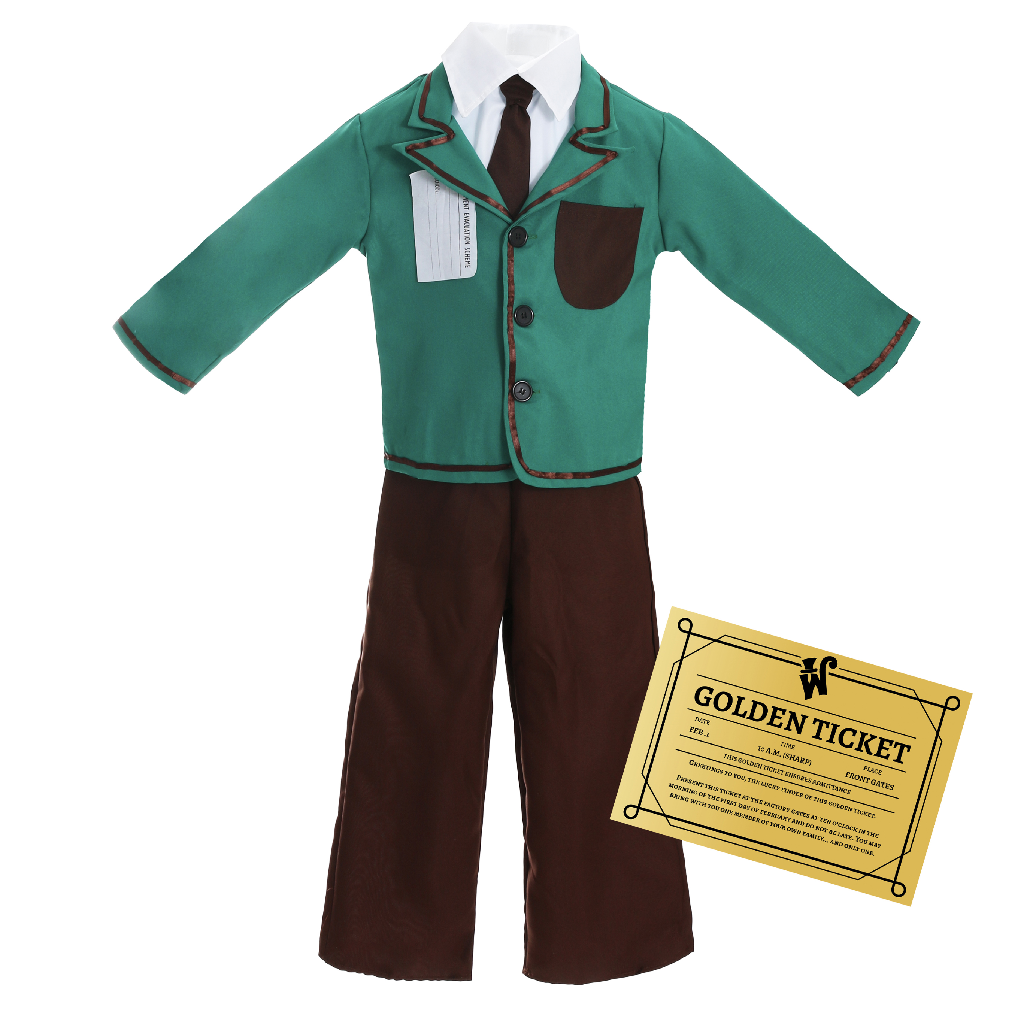 GREEDY GOLDEN TICKET WINNER COSTUME INCLUDES: Your Child's Greedy Golden Ticket Winner Costume includes a Teal and Brown Jacket with an attached White Shirt Front & Brown Tie, a pair of Brown Trousers and a Golden Ticket Prop, to finish off your outfit!