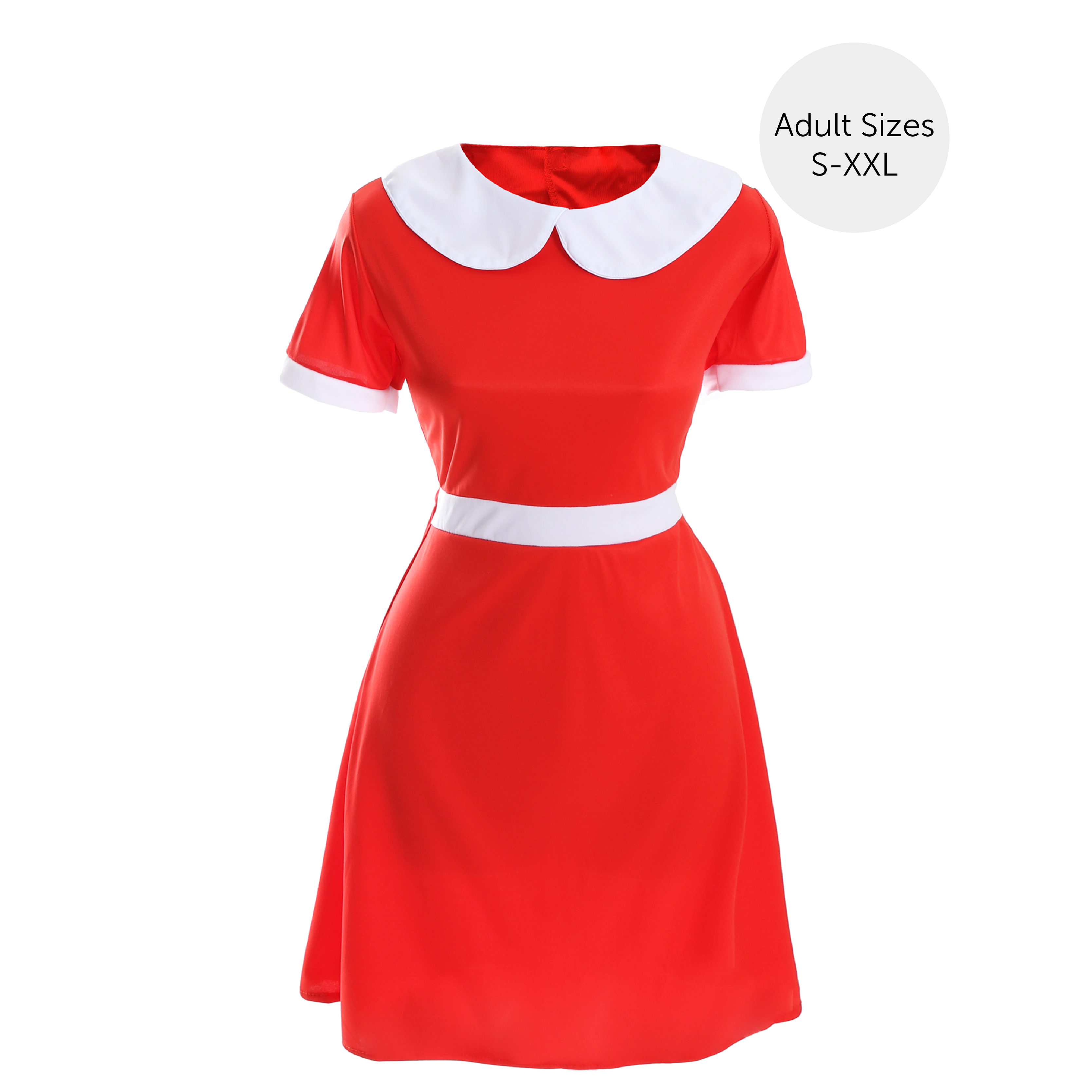 COSTUME INCLUDES: Ladies Red Dress with White Collar and Cuff Detailing, a curly Auburn Afro Wig and a pair of White Frilly Ankle Socks! A simple yet iconic look for you to rock and wear for your next World Book Day events and occasions!