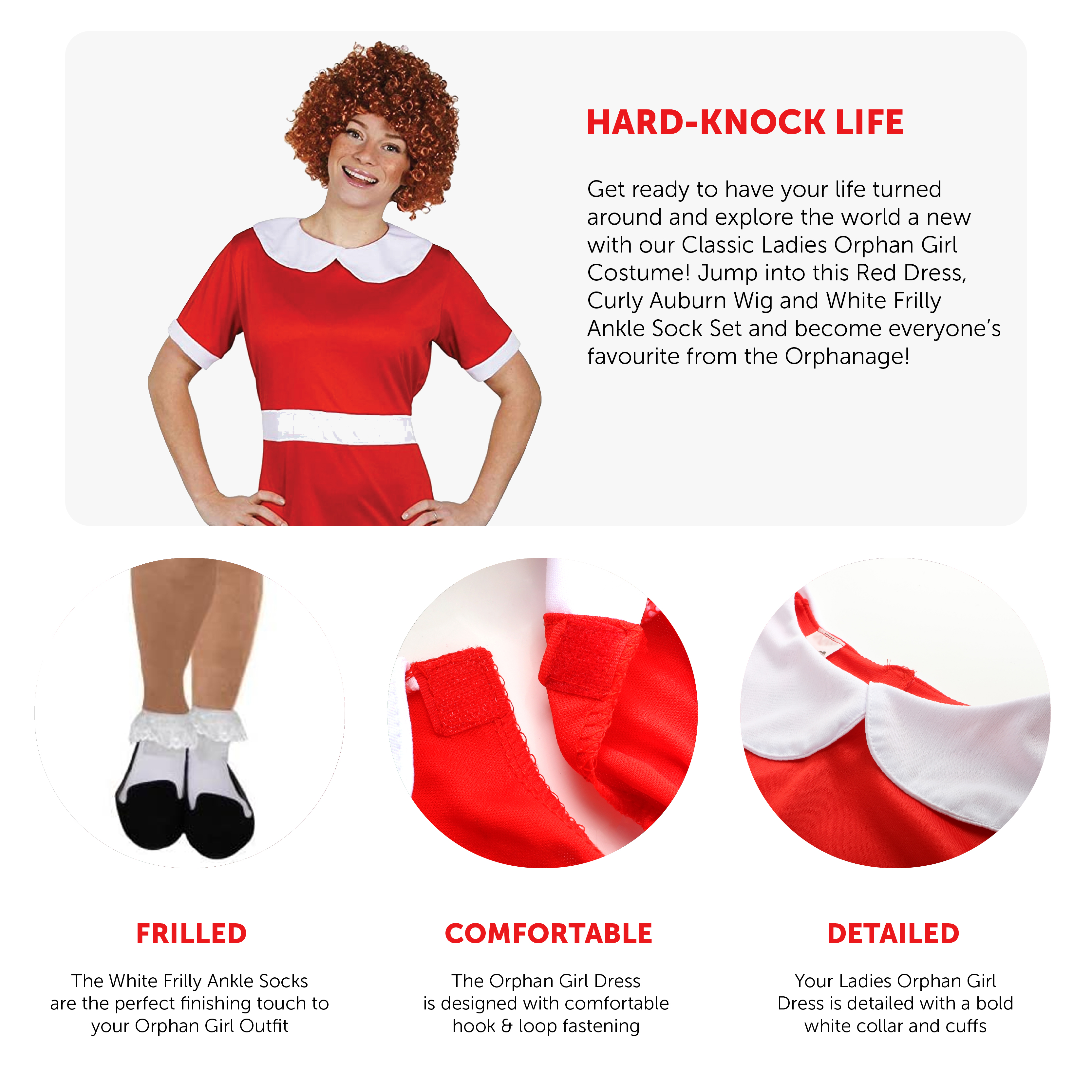 LADIES ORPHAN GIRL COSTUME SET: Get ready to have your life turned around and explore the world anew with our Classic Ladies Orphan Girl Costume Set! Jump into this Red Dress and become everyone's favourite from the Orphanage!