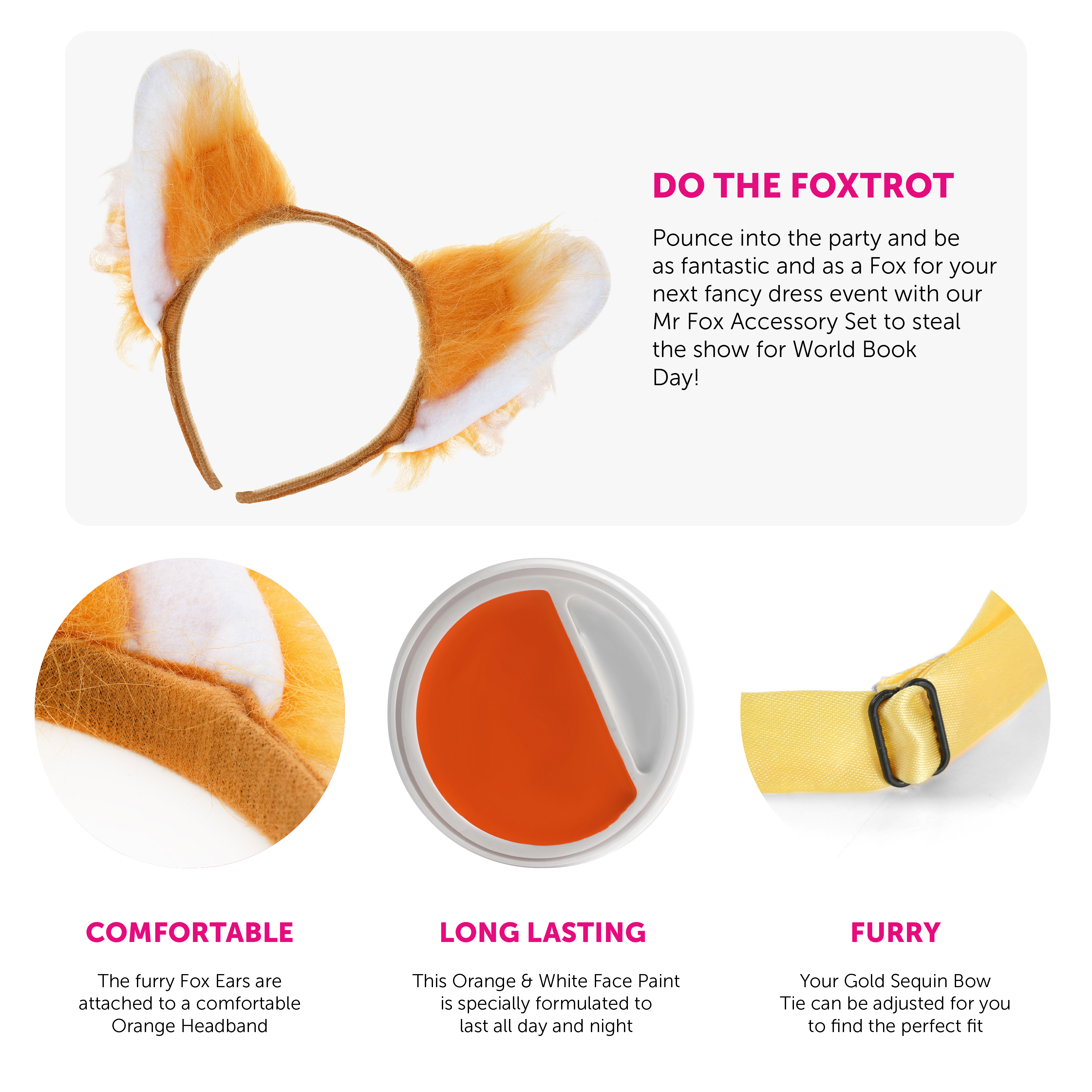 SET INCLUDES: Your Mr Fox Accessory Set includes an Orange Headband with furry Fox Ears attached, a matching Fox Tail with a belt loop for easy attachment, an adjustable Gold Sequin Bow Tie and a palette of Orange and White Face Paint, the perfect look for this World Book Day!