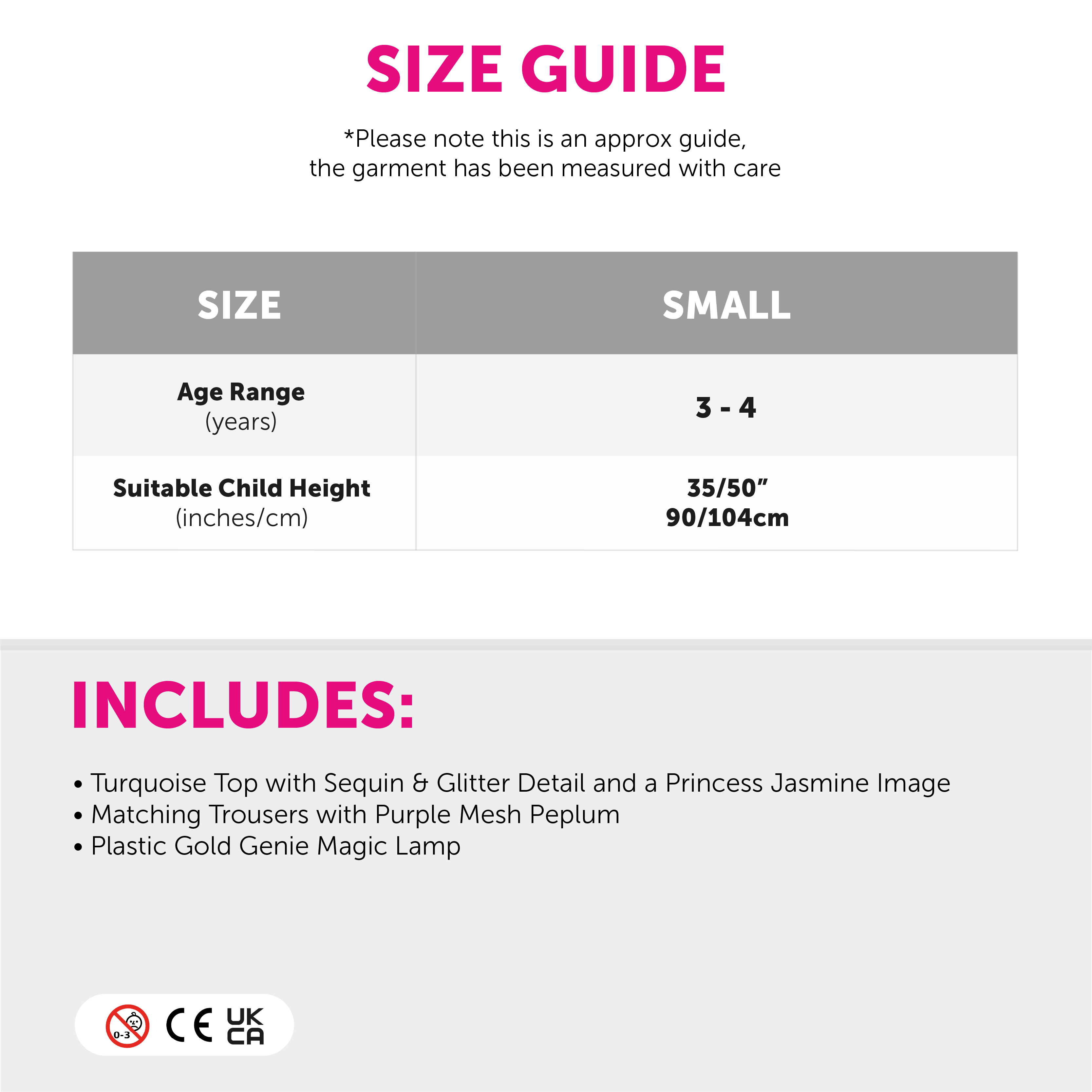 AVAILABLE IN ONE SIZE: Your Child's Princess Jasmine Costume is available in a size Small (3 - 4 years) with a suitable height of 35/50" (90/104cm)