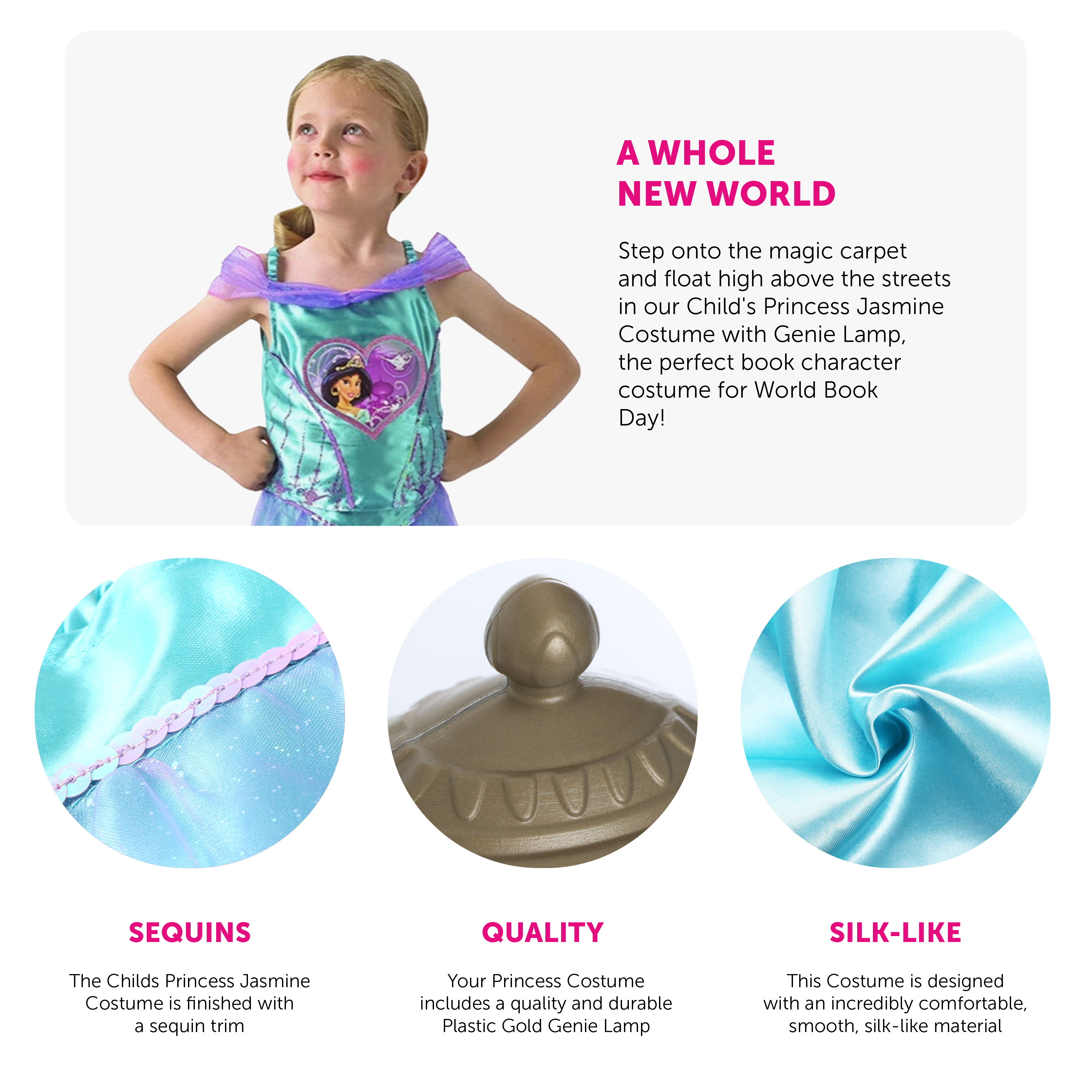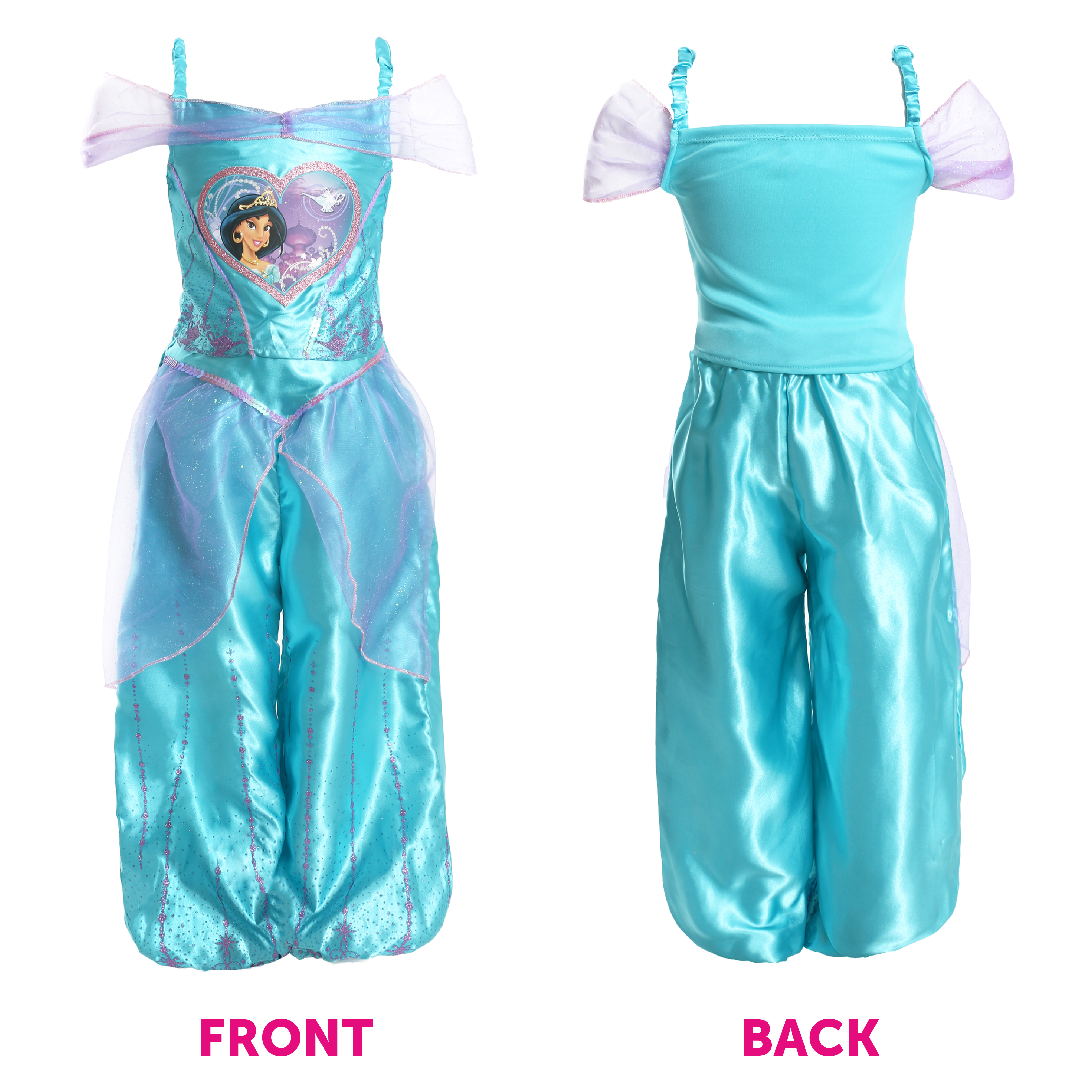 COSTUME INCLUDES: Your Child's Princess Jasmine Costume includes a Turquoise satin feel Top detailed with a Princess Jasmine image and Purple Glitter detail and Turquoise Trousers with an attached Purple mesh peplum with sequin detail, and a Gold Plastic Genie Lamp!