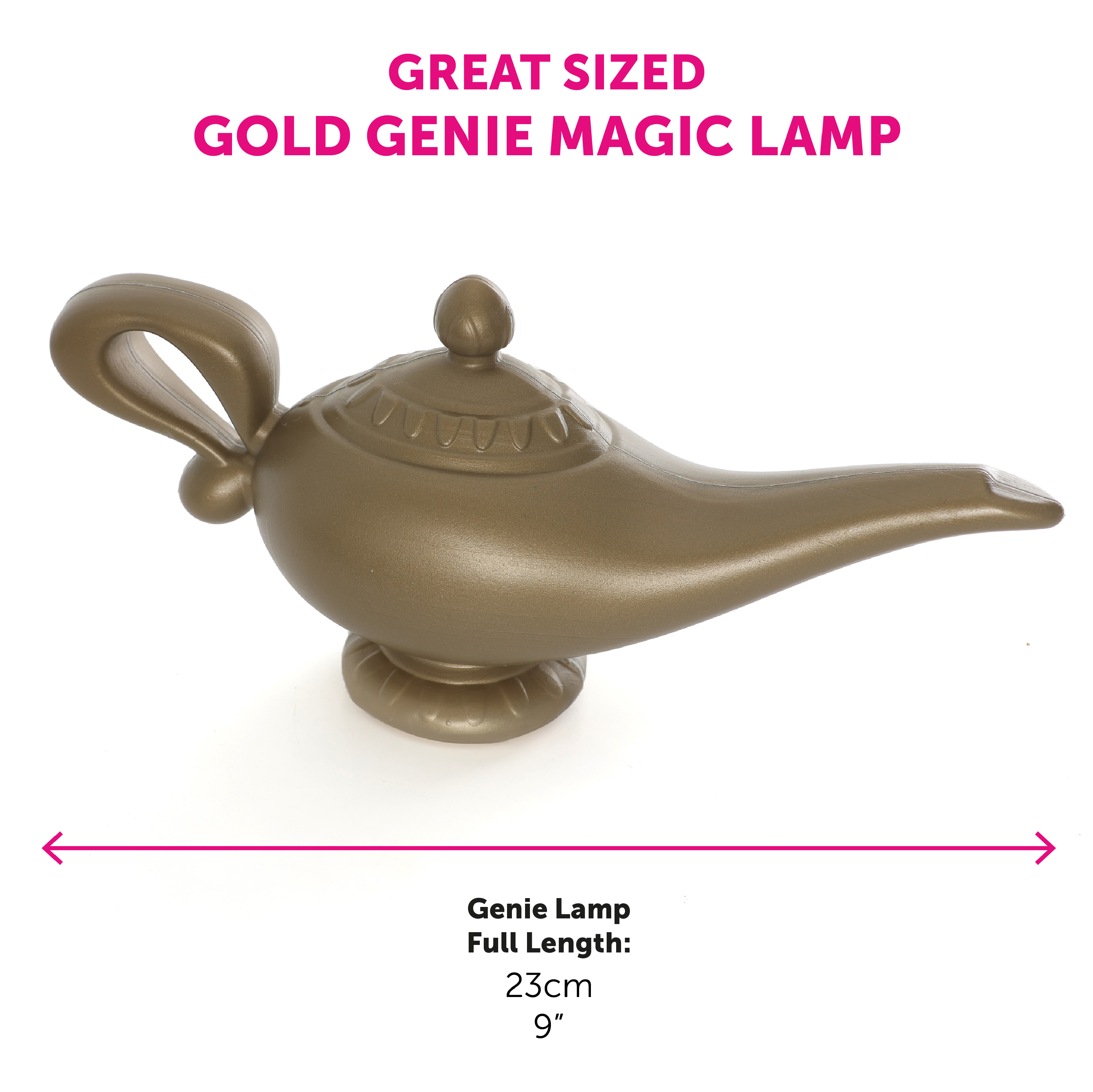 GREAT SIZED LAMP: The Gold Genie Magic Lamp is a great sized prop for you to add to your Costume with a full length of 23cm (9"), this accessory is the perfect addition!