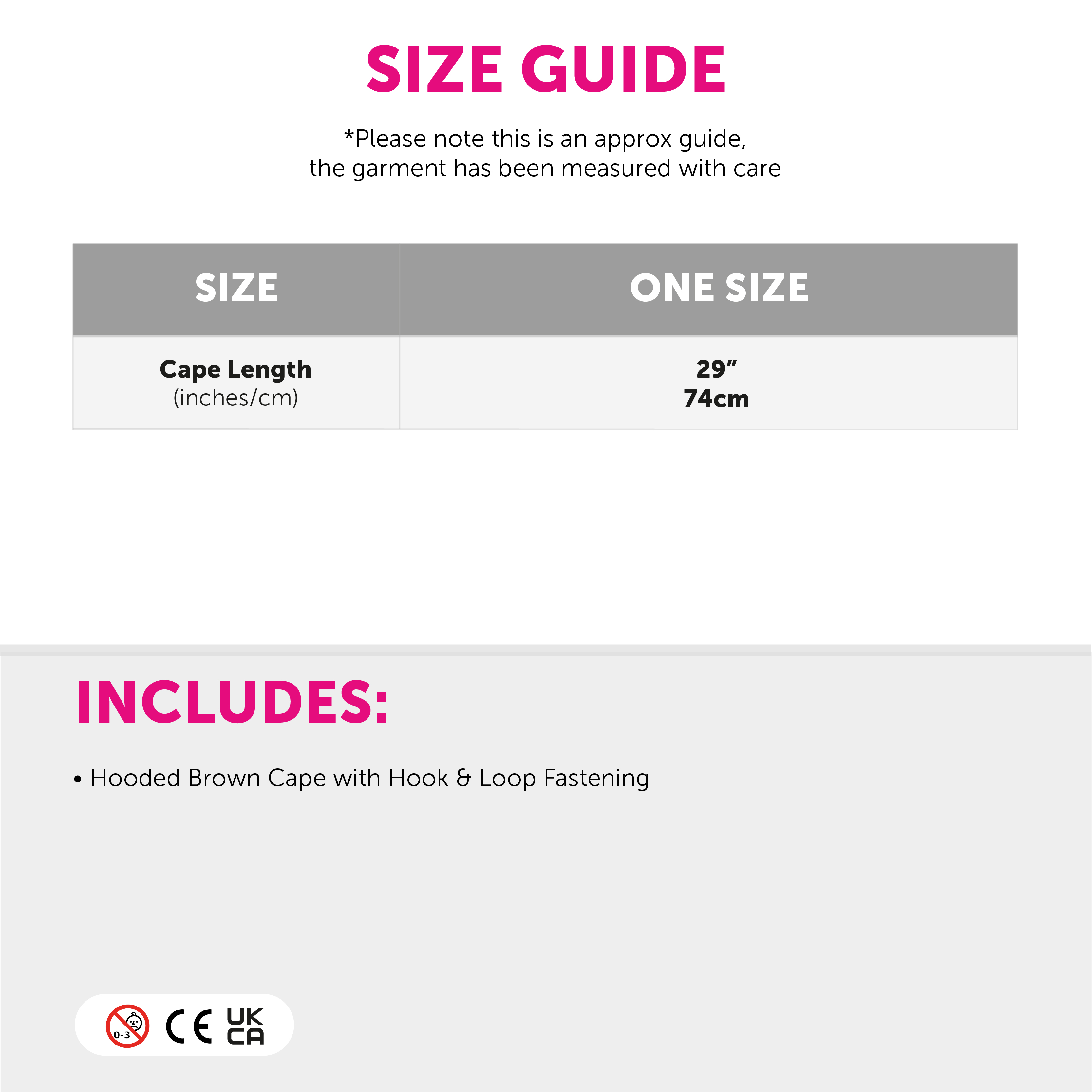 CAPE DETAILS: Your Child's Cape is a long, Brown calf-length cape, with an attached hood, and an easy to fasten hook and loop design, the perfect addition to any fancy dress Costume!