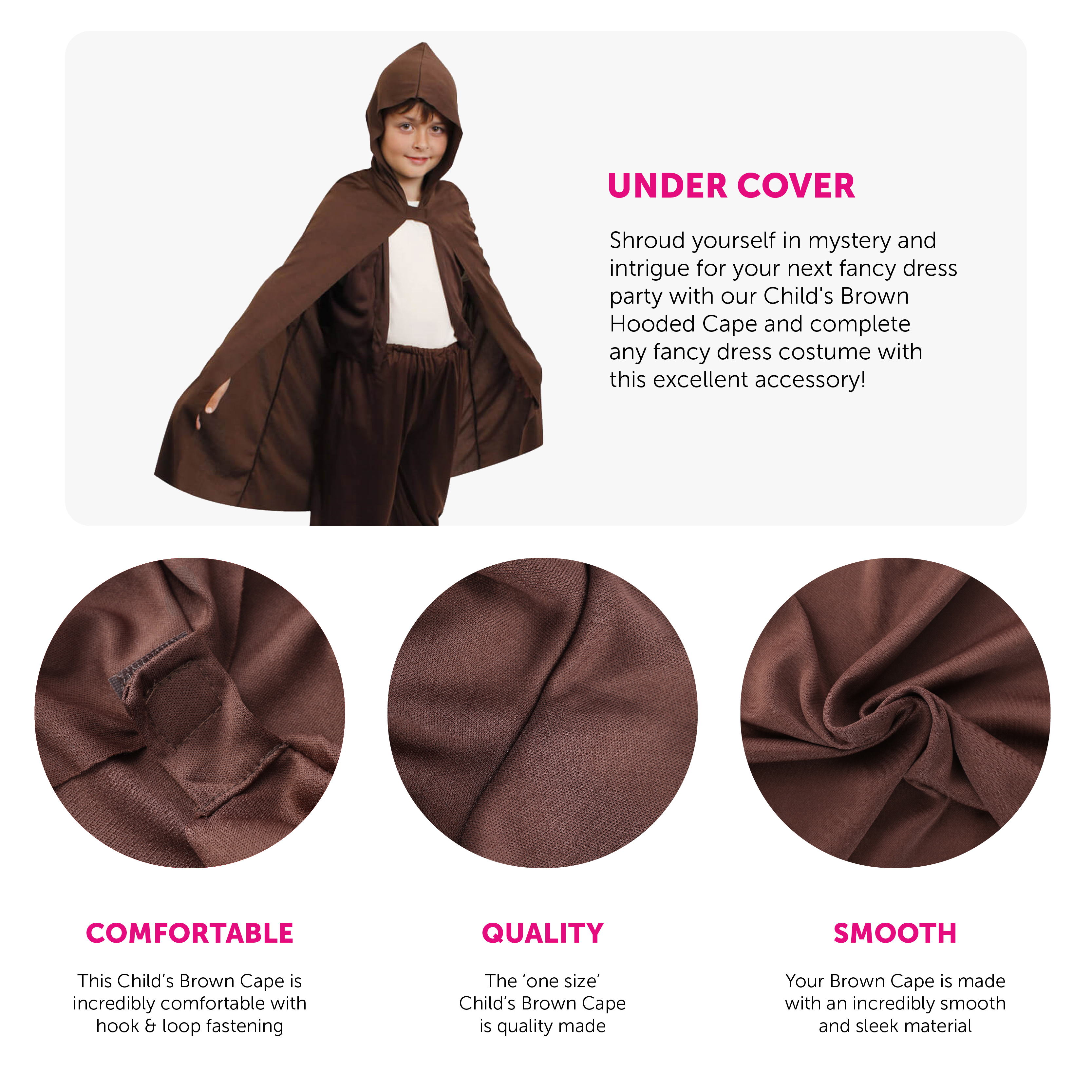 CHILD'S BROWN CAPE: Shroud yourself in mystery and intrigue for your next fancy dress party with our Child's Brown Hooded Cape and complete any fancy dress costume with this excellent accessory!