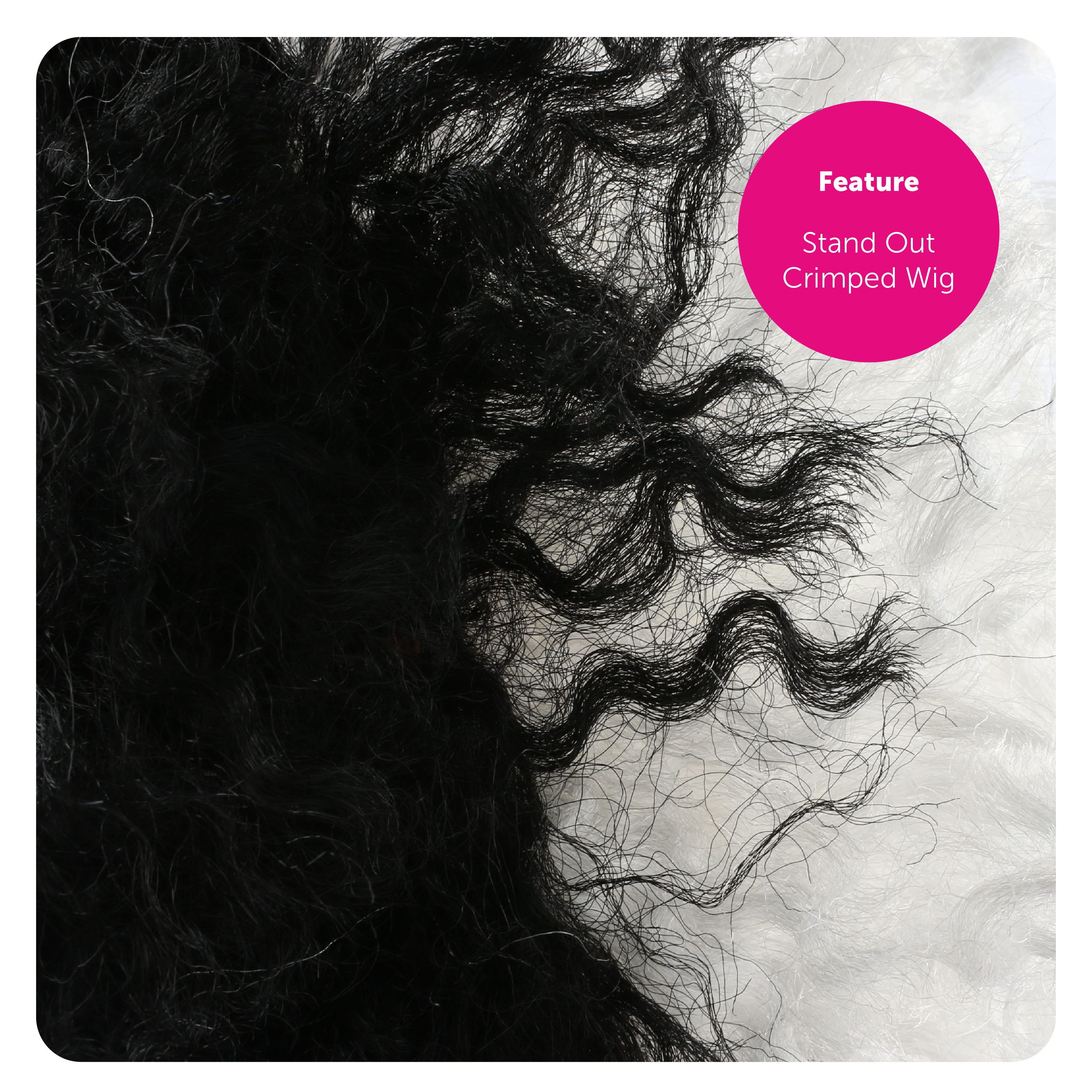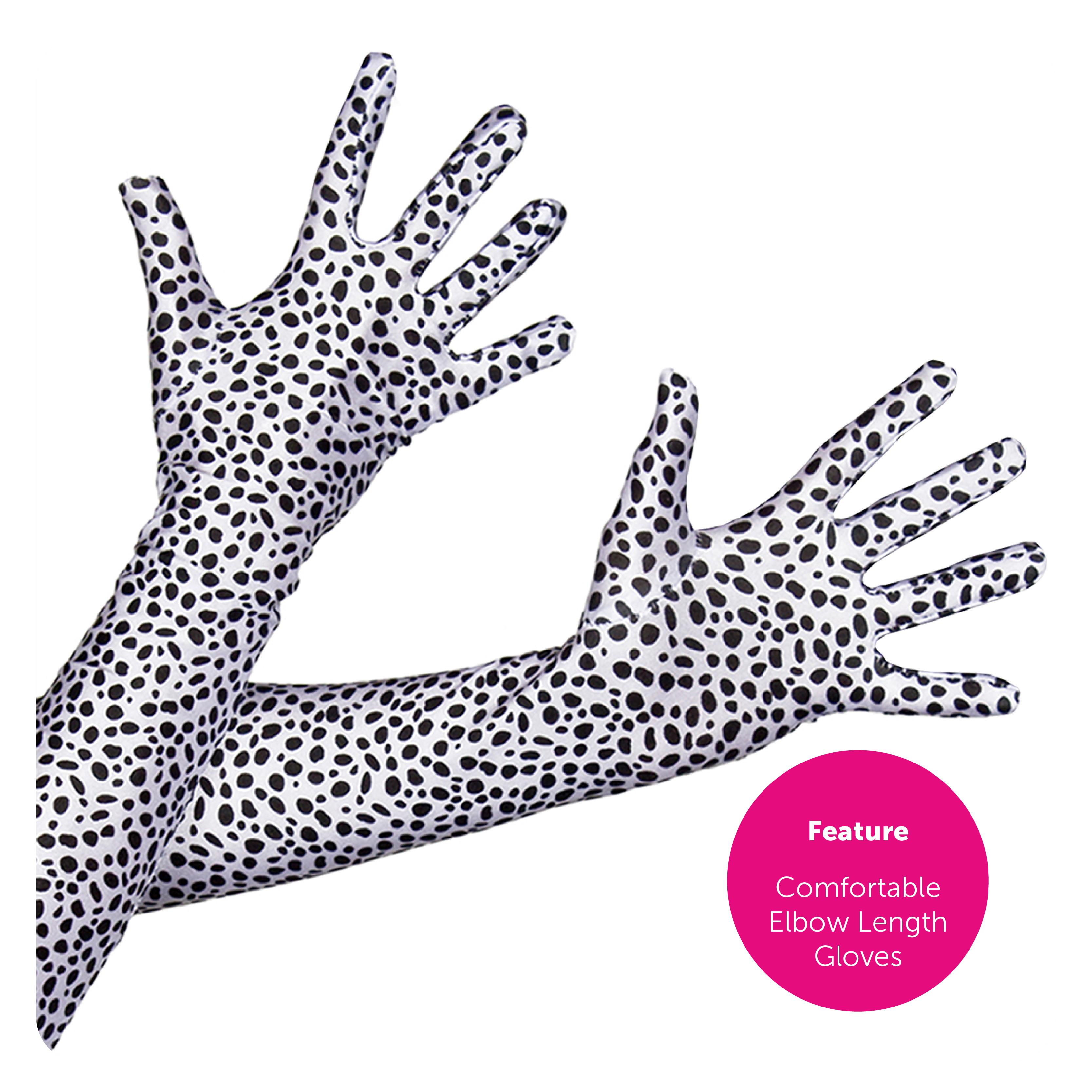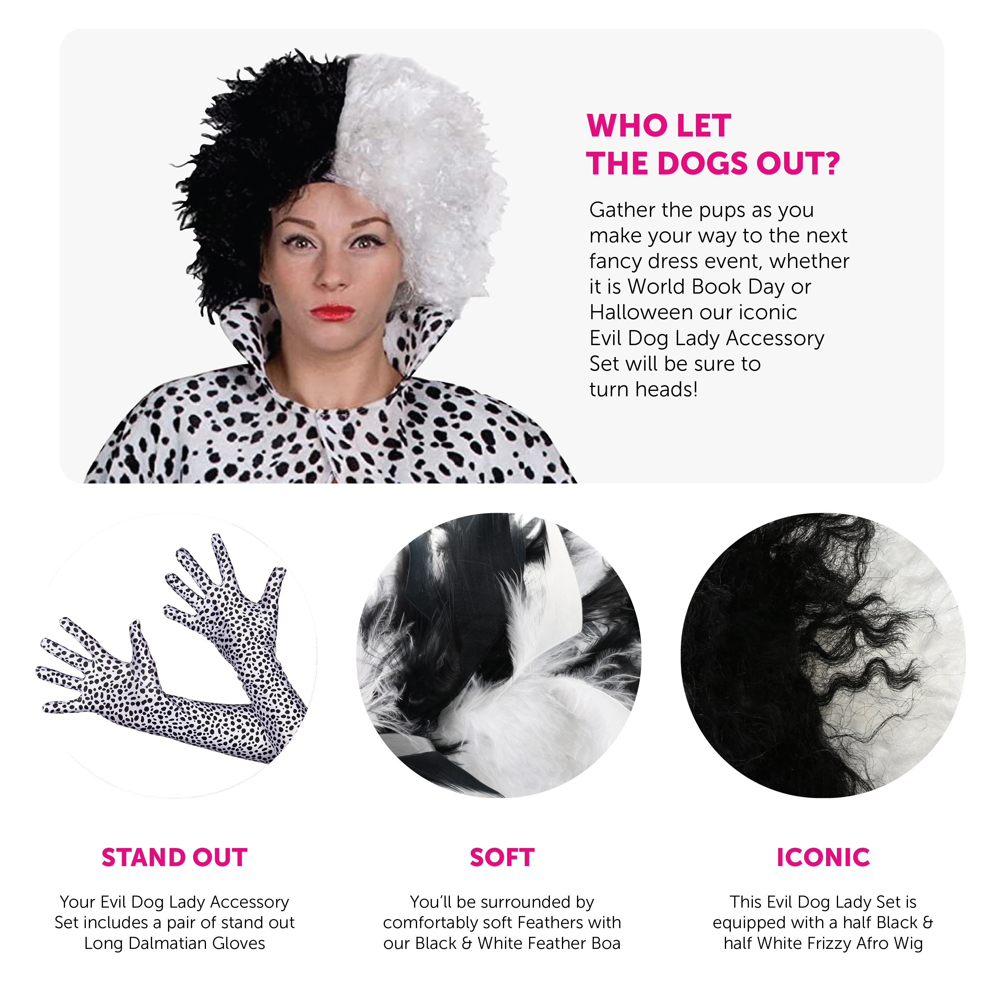 SET INCLUDES: Your Evil Dog Lady Accessory Set includes a half White and half Black Crimped Afro Wig, a pair of Long Dalmatian Gloves, and a Black and White Feather Boa, the perfect costume set for any fancy dress event!