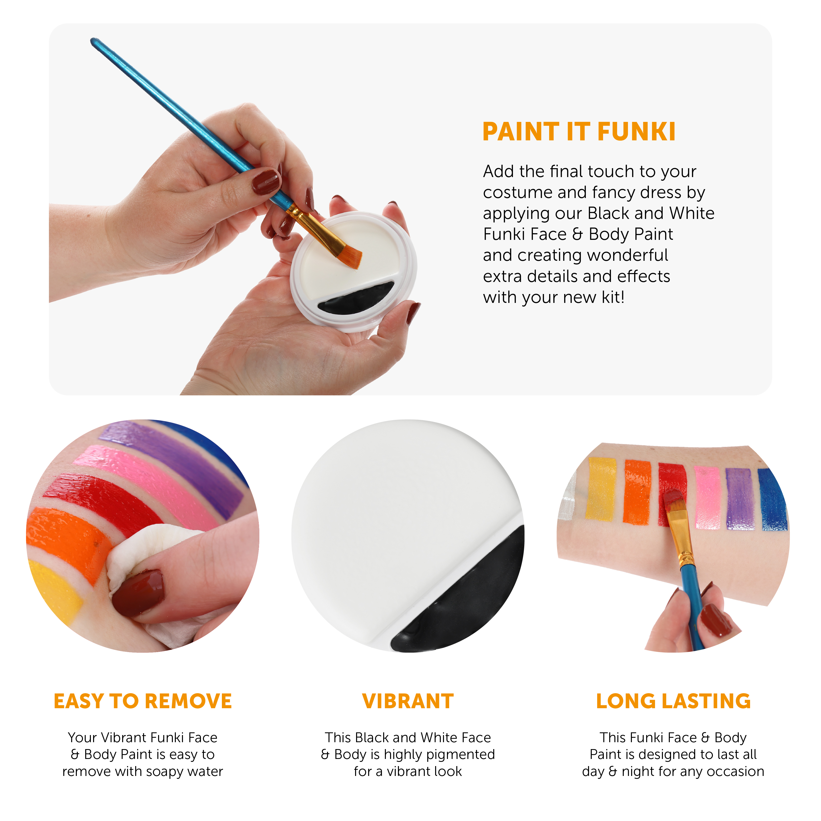 • PERFECT FOR ANY FANCY DRESS AND OUTINGS: Whether it be to complete a fancy-dress costume with some brilliant face painting, extra features for body painting, or any other brilliant use you can think of, Funki Face & Body paint is for you!