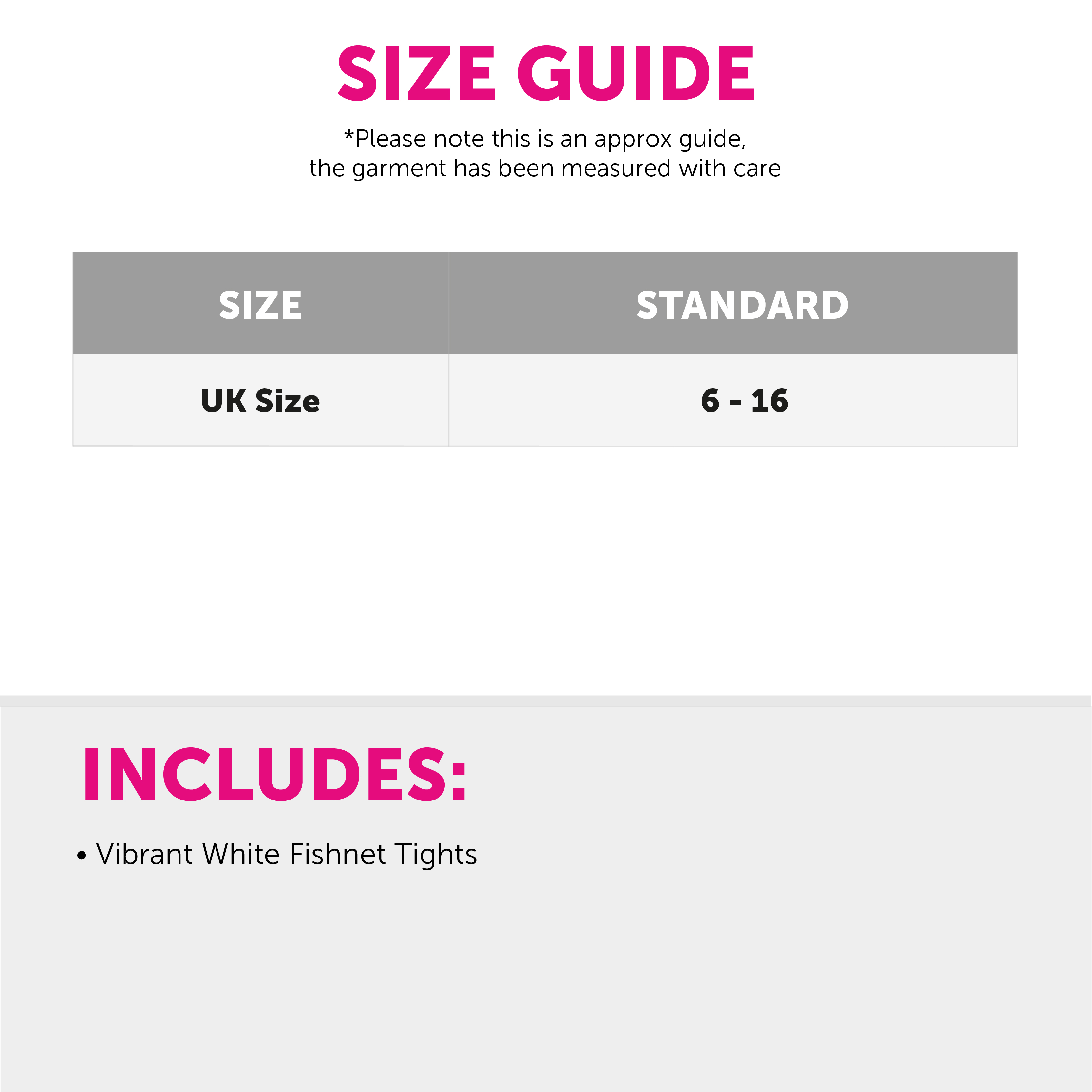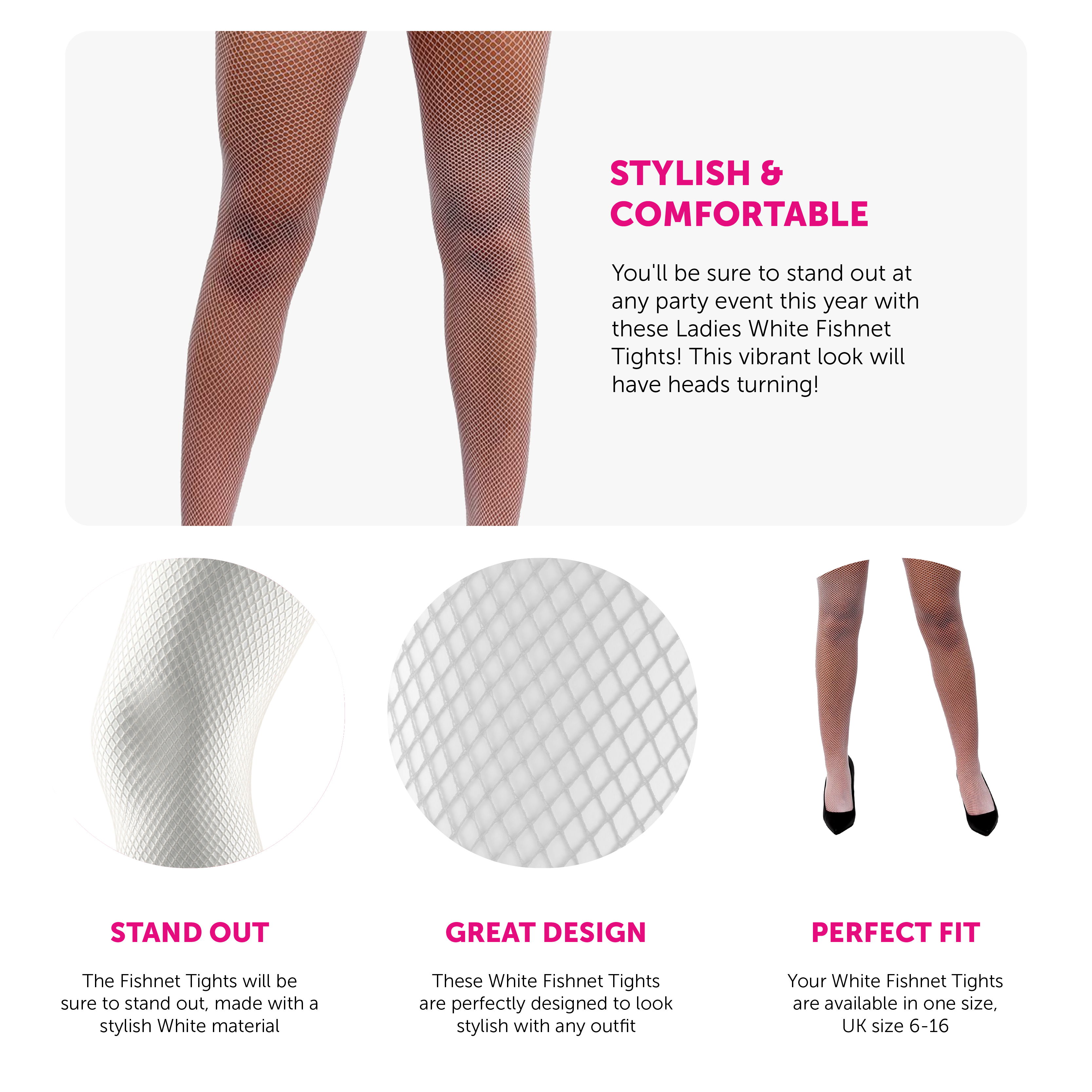 AVAILABLE IN ONE SIZE: Your Ladies White Fishnet Tights are available in just one size, UK 6 - 16, with enough stretch for anyone to wear comfortably!