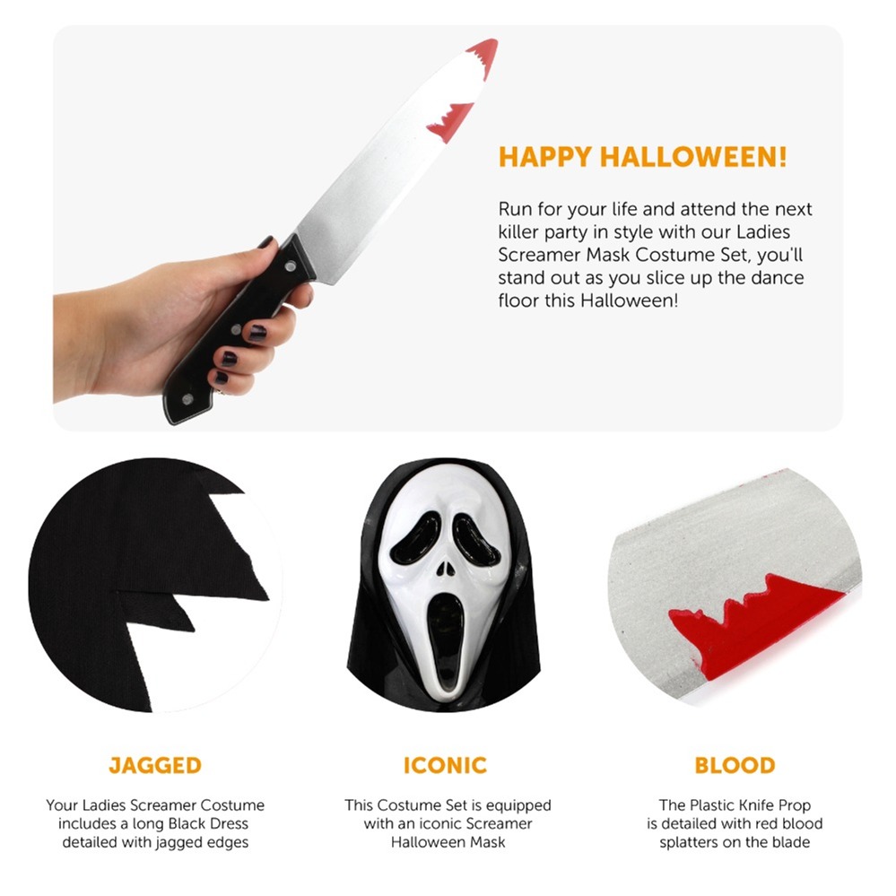 Ladies Screamer Costume - Dress, Blood Pump Mask & Knife Prop £15.99